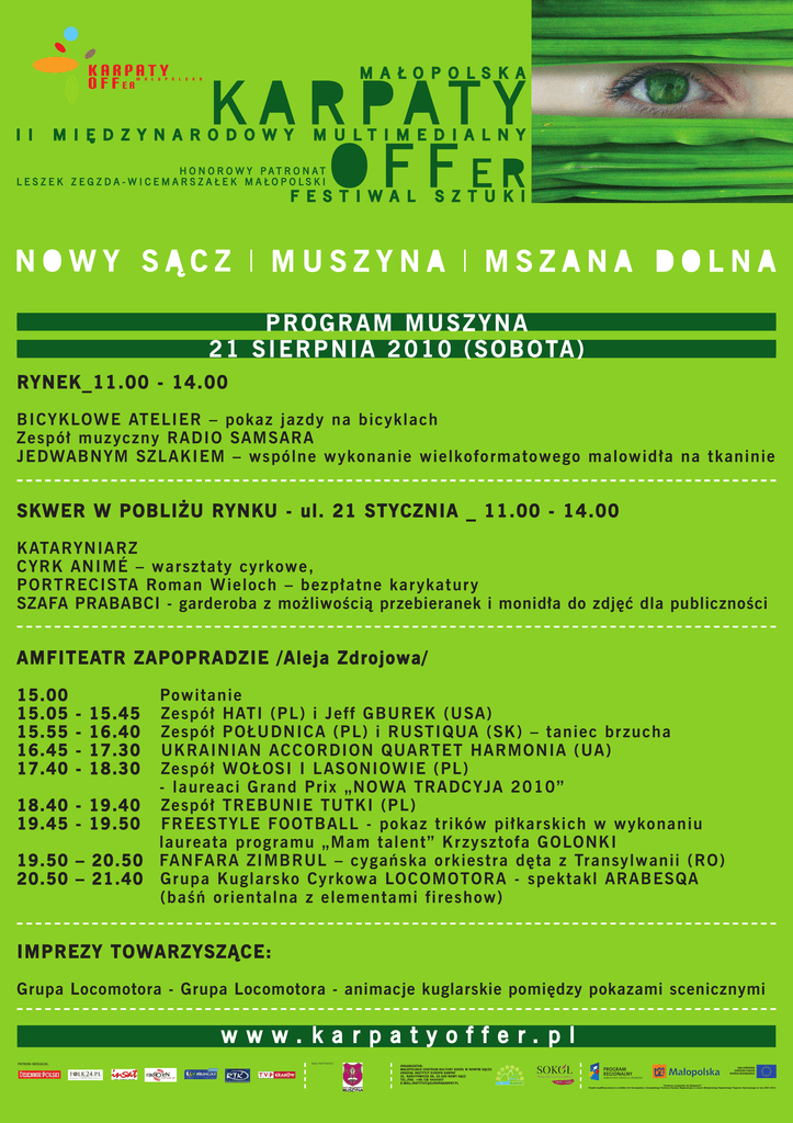 PROGRAM MUSZYNA 2 1 S I E R P N I A 2 0 1 0 ( S O B O TA ) RYNEK_11.00 - 14.00 B I C YK LOWE ATELIER – pok a z j a z d y n a b i c y k l a c h Z es p ół muzyczny RADIO SAM S AR A J E DWABNYM SZL AKIEM – w s p ó l n e w y k o n a n i e w i e l k o f o r m a t o w e g o m a l o w i d ł a n a t k a n i n i e SKW ER W POBLIŻU RYNKU - ul. 21 STYCZNIA _ 11.00 - 14.00 K ATARYNIARZ C Y R K ANIMÉ – warsztaty cy r k o w e , P OR T RECISTA Roman Wie l o c h – b e z p ł a t n e k a r y k a t u r y SZAFA PRABABCI - garderoba z możliwością przebieranek i monidła do zdjęć dla publiczności AM FITEATR ZAPOPRADZIE /Aleja Zdrojowa/ 15.00 15.05 15.55 16.45 17.40 - 15.45 16.40 17.30 18.30 1 8 . 4 0 - 19.40 1 9 . 4 5 - 19.50 1 9 . 5 0 – 20.50 2 0 . 5 0 – 21.40 Powitanie Zespół HAT I ( P L ) i J e f f G B U R E K ( U S A ) Zespół PO ŁU D N I C A ( P L ) i R U S T I Q U A ( S K ) – t a n i e c b r z u c h a UKRAINIAN A C C O R D I O N Q U A R T E T H A R M O N I A ( U A ) Zespół WOŁO S I I L A S O N I O W I E ( P L ) - lau reaci G r a n d Pr i x „ N O WA T R A D C Y J A 2 0 1 0 ” Zespół TRE B U N I E T U T K I ( P L ) FREESTYLE F O O T B A L L - p o k a z t r i k ó w p i ł k a r s k i c h w w y k o n a n i u laureata p r o g r a m u „ M a m t a l e n t ” K r z y s z t o f a G O LO N K I FANFARA Z I M B R U L – c y g a ń s k a o r k i e s t r a d ę t a z Tr a n s y l w a n i i ( R O ) Gru pa Ku g l a r s k o C y r k o w a LO C O M O T O R A - s p e k t a k l A R A B E S Q A (baśń orie n t a l n a z e l e m e n t a m i f i r e s h o w ) IMPREZY TOWARZYSZĄCE: Grupa Locomotora - Grupa Locomotora - animacje kuglarskie pomiędzy pokazami scenicznymi NASI PARTNERZY: