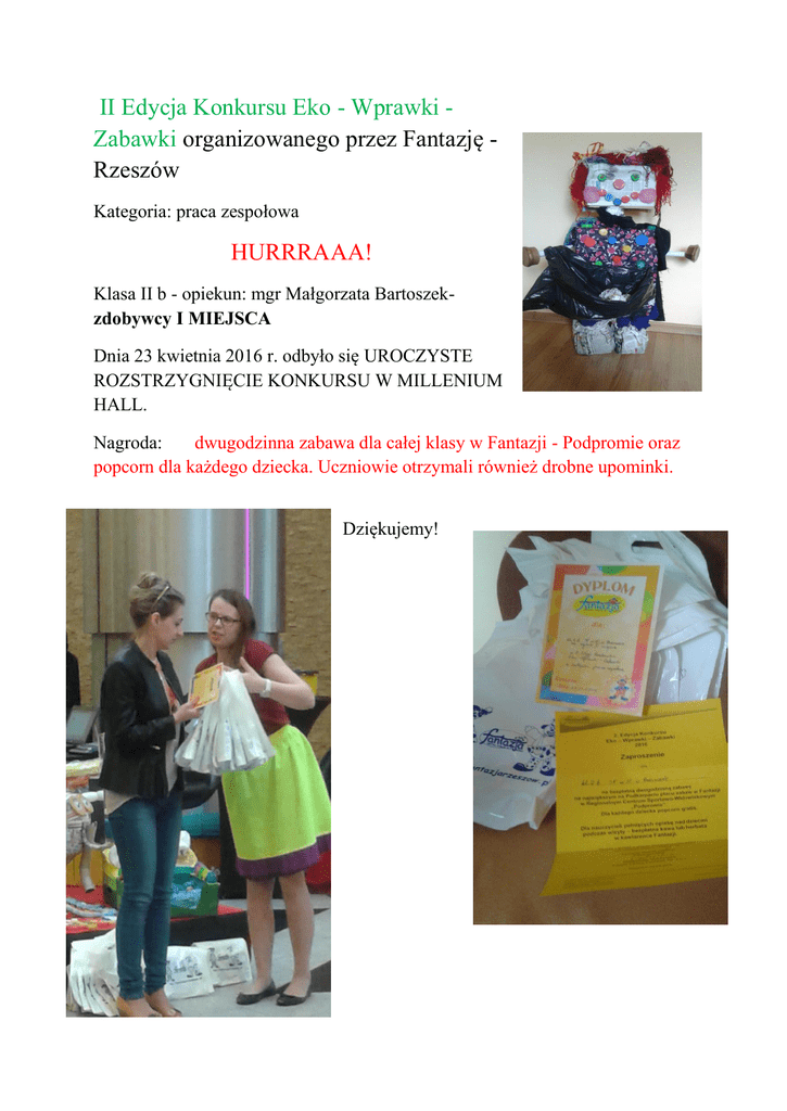 II Edycja Konkursu Eko - Wprawki Zabawki organizowanego przez Fantazję Rzeszów Kategoria: praca zespołowa HURRRAAA! Klasa II b - opiekun: mgr Małgorzata Bartoszekzdobywcy I MIEJSCA Dnia 23 kwietnia 2016 r. odbyło się UROCZYSTE ROZSTRZYGNIĘCIE KONKURSU W MILLENIUM HALL. Nagroda: dwugodzinna zabawa dla całej klasy w Fantazji - Podpromie oraz popcorn dla każdego dziecka. Uczniowie otrzymali również drobne upominki. Dziękujemy!