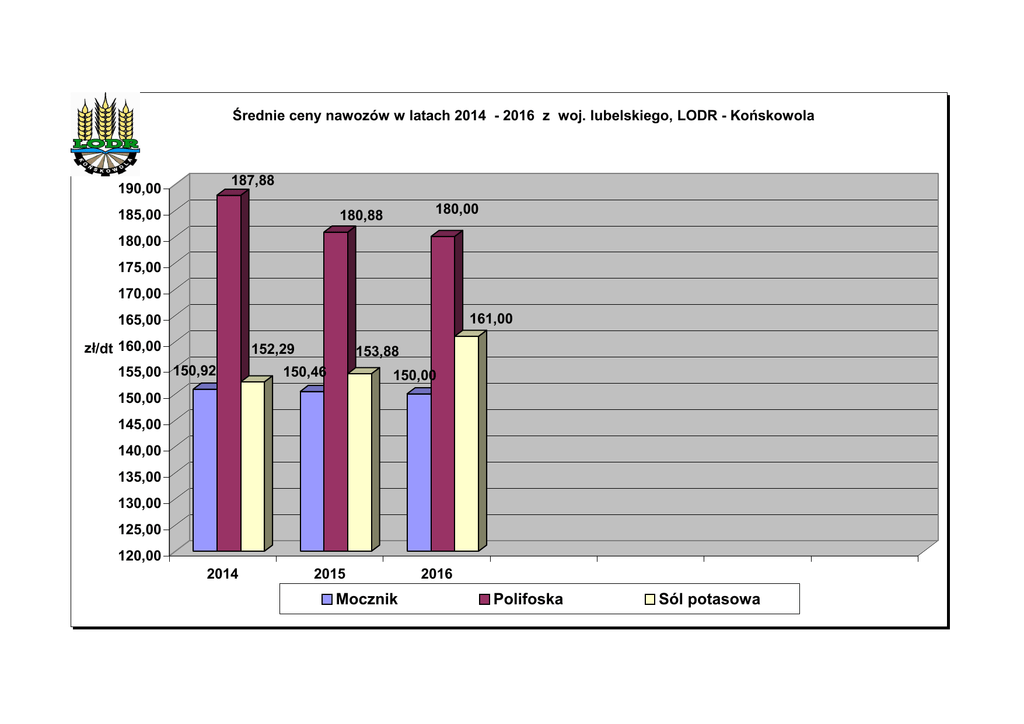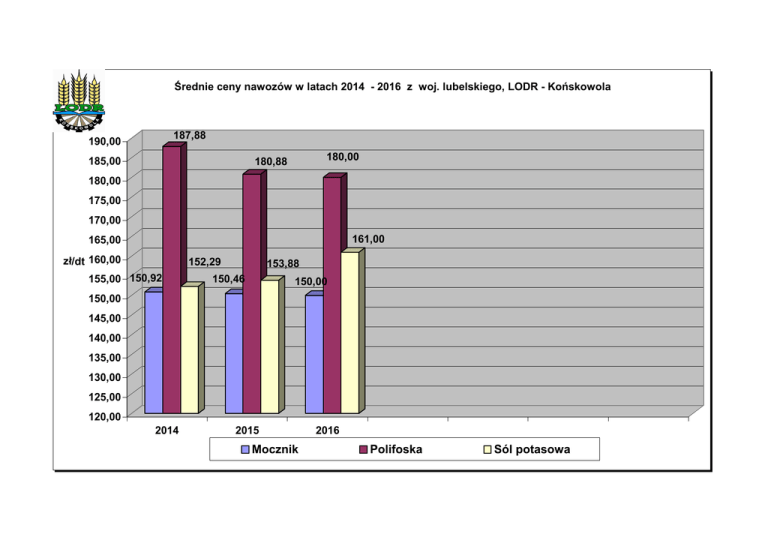 Średnie ceny nawozów w latach 2014 - 2016 z woj. lubelskiego, LODR - Końskowola 187,88 190,00 185,00 180,00 180,88 180,00 175,00 170,00 161,00 165,00 zł/dt 160,00 152,29 155,00 150,92 153,88 150,46 150,00 150,00 145,00 140,00 135,00 130,00 125,00 120,00 2014 2015 Mocznik 2016 Polifoska Sól potasowa