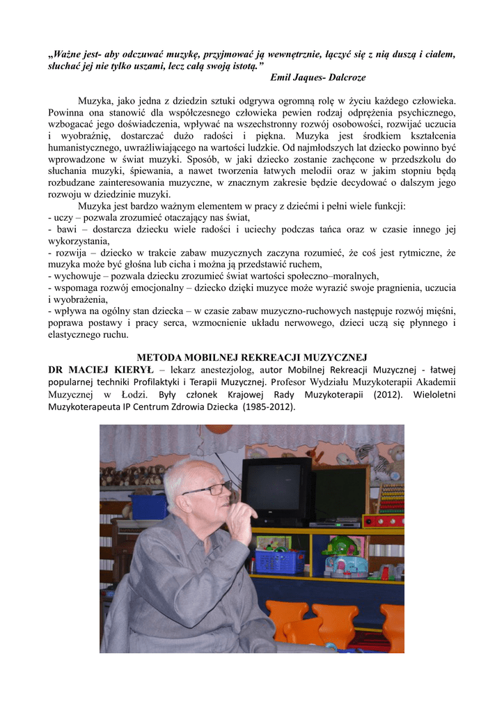 „Ważne jest- aby odczuwać muzykę, przyjmować ją wewnętrznie, łączyć się z nią duszą i ciałem, słuchać jej nie tylko uszami, lecz całą swoją istotą.” Emil Jaques- Dalcroze Muzyka, jako jedna z dziedzin sztuki odgrywa ogromną rolę w życiu każdego człowieka. Powinna ona stanowić dla współczesnego człowieka pewien rodzaj odprężenia psychicznego, wzbogacać jego doświadczenia, wpływać na wszechstronny rozwój osobowości, rozwijać uczucia i wyobraźnię, dostarczać dużo radości i piękna. Muzyka jest środkiem kształcenia humanistycznego, uwrażliwiającego na wartości ludzkie. Od najmłodszych lat dziecko powinno być wprowadzone w świat muzyki. Sposób, w jaki dziecko zostanie zachęcone w przedszkolu do słuchania muzyki, śpiewania, a nawet tworzenia łatwych melodii oraz w jakim stopniu będą rozbudzane zainteresowania muzyczne, w znacznym zakresie będzie decydować o dalszym jego rozwoju w dziedzinie muzyki. Muzyka jest bardzo ważnym elementem w pracy z dziećmi i pełni wiele funkcji: - uczy – pozwala zrozumieć otaczający nas świat, - bawi – dostarcza dziecku wiele radości i uciechy podczas tańca oraz w czasie innego jej wykorzystania, - rozwija – dziecko w trakcie zabaw muzycznych zaczyna rozumieć, że coś jest rytmiczne, że muzyka może być głośna lub cicha i można ją przedstawić ruchem, - wychowuje – pozwala dziecku zrozumieć świat wartości społeczno–moralnych, - wspomaga rozwój emocjonalny – dziecko dzięki muzyce może wyrazić swoje pragnienia, uczucia i wyobrażenia, - wpływa na ogólny stan dziecka – w czasie zabaw muzyczno-ruchowych następuje rozwój mięśni, poprawa postawy i pracy serca, wzmocnienie układu nerwowego, dzieci uczą się płynnego i elastycznego ruchu. METODA MOBILNEJ REKREACJI MUZYCZNEJ DR MACIEJ KIERYŁ – lekarz anestezjolog, autor Mobilnej Rekreacji Muzycznej - łatwej popularnej techniki Profilaktyki i Terapii Muzycznej. Profesor Wydziału Muzykoterapii Akademii Muzycznej w Łodzi. Były członek Krajowej Rady Muzykoterapii (2012). Wieloletni Muzykoterapeuta IP Centrum Zdrowia Dziecka (1985-2012). SZKOLENIE RADY NAUCZYCIELSKIEJ W PRZEDSZKOLU 154 "POD WESOŁĄ TRUSKAWECZKĄ". W dniach 11 i 13 lutego 2014r. dzięki Pani Dyrektor Alicji Zan, odbyło się szkolenie Rady Pedagogicznej. Szkolenie przeprowadził sam autor metody Mobilnej Rekreacji Muzycznej dr Maciej Kierył. Celem szkolenia było poszerzenie warsztatu pedagoga, zapoznanie z wiadomościami z zakresu profilaktyki i terapii muzycznej oraz prowadzenia zajęć techniką Mobilnej Rekreacji Muzycznej. MOBILNA REKREACJA MUZYCZNA (MRM) Według autora w tej metodzie wykorzystujemy niekonwencjonalne źródła dźwięku związane z ciałem (klaskanie, tupanie, gwizdanie, tupanie, oklepywanie, okrzyki,itp.), wzmacniać działania muzyki o ćwiczenia rytmiczne, ruchowe, oddechowe, wyobrażeniowe, relaksacyjne, perkusyjne, formy plastyczne, literackie i teatralne, a także wykorzystywać różne formy ruchu i prowadzić działania muzyczne w atrakcyjnej formie gier i zabaw. M. Kierył podkreśla, że MRM, powinna stanowić uporządkowany emocjonalnie układ ćwiczeń rytmicznych, ruchowych, perkusyjnych, oddechowych i wyobrażeniowych stymulowanych muzyką. Układ taki może być stosowany indywidualnie lub grupowo w celu profilaktycznym. Składa się on z pięciu etapów (OZURA) : Etap 1-O, czyli ODREAGOWANIE (klaskanie, tupanie, podskoki, krzyk), Wykonywanie kilku prostych, spontanicznych, dynamicznych ruchów. Etap 2-Z, ZRYTMIZOWANIE, czyli wzmacnianie rytmu muzyki poprzez ruch, czy grę na instrumentach. Etap 3-U, czyli UWRAŻLIWIENIE poprzez integrację muzyki z plastyką, literaturą, może również polegać na samodzielnej grze na prostych instrumentach. Etap 4-R, czyli REKREACJA, polega na nauce różnych form odpoczynku z wykorzystaniem muzyki, ćwiczenia oddechowe w pozycji leżącej lub siedzącej. Etap 5–A, czyli AKTYWIZACJA poprzez ćwiczenia rytmiczne, taniec, śpiew: - łagodna — spokojne ćwiczenia w pozycji leżącej, przechodzenie do pozycji stojącej przez siad; - dynamiczna — ćwiczenia w tempie (np. mini aerobik). 17 marca 2014r. w gr.Zajączki odbyły się zajęcia przeprowadzone metodą Mobilnej Rekreacji Muzycznej.