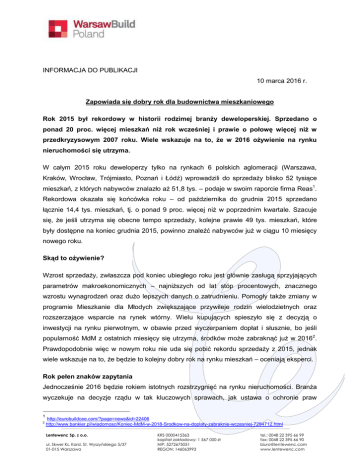 INFORMACJA DO PUBLIKACJI 10 marca 2016 r. Zapowiada się dobry rok dla budownictwa mieszkaniowego Rok 2015 był rekordowy w historii rodzimej branży deweloperskiej. Sprzedano o ponad 20 proc. więcej mieszkań niż rok wcześniej i prawie o połowę więcej niż w przedkryzysowym 2007 roku. Wiele wskazuje na to, że w 2016 ożywienie na rynku nieruchomości się utrzyma. W całym 2015 roku deweloperzy tylko na rynkach 6 polskich aglomeracji (Warszawa, Kraków, Wrocław, Trójmiasto, Poznań i Łódź) wprowadzili do sprzedaży blisko 52 tysiące mieszkań, z których nabywców znalazło aż 51,8 tys. – podaje w swoim raporcie firma Reas1. Rekordowa okazała się końcówka roku – od października do grudnia 2015 sprzedano łącznie 14,4 tys. mieszkań, tj. o ponad 9 proc. więcej niż w poprzednim kwartale. Szacuje się, że jeśli utrzyma się obecne tempo sprzedaży, kolejne prawie 49 tys. mieszkań, które były dostępne na koniec grudnia 2015, powinno znaleźć nabywców już w ciągu 10 miesięcy nowego roku. Skąd to ożywienie? Wzrost sprzedaży, zwłaszcza pod koniec ubiegłego roku jest głównie zasługą sprzyjających parametrów makroekonomicznych – najniższych od lat stóp procentowych, znacznego wzrostu wynagrodzeń oraz dużo lepszych danych o zatrudnieniu. Pomogły także zmiany w programie Mieszkanie dla Młodych zwiększające przywileje rodzin wielodzietnych oraz rozszerzające wsparcie na rynek wtórny. Wielu kupujących spieszyło się z decyzją o inwestycji na rynku pierwotnym, w obawie przed wyczerpaniem dopłat i słusznie, bo jeśli popularność MdM z ostatnich miesięcy się utrzyma, środków może zabraknąć już w 20162. Prawdopodobnie więc w nowym roku nie uda się pobić rekordu sprzedaży z 2015, jednak wiele wskazuje na to, że będzie to kolejny dobry rok na rynku mieszkań – oceniają eksperci. Rok pełen znaków zapytania Jednocześnie 2016 będzie rokiem istotnych rozstrzygnięć na rynku nieruchomości. Branża wyczekuje na decyzje rządu w tak kluczowych sprawach, jak ustawa o ochronie praw 1 2 http://eurobuildcee.com/?page=news&id=22406 http://www.bankier.pl/wiadomosc/Koniec-MdM-w-2018-Srodkow-na-doplaty-zabraknie-wczesniej-7294712.html Lentewenc Sp. z o.o. ul. Skwer Ks. Kard. St. Wyszyńskiego 5/37 01-015 Warszawa KRS 0000415363 kapitał zakładowy: 1 567 000 zł NIP: 5272675051 REGON: 146063993 tel.: 0048 22 395 66 99 fax: 0048 22 395 66 90 [email protected] www.lentewenc.com nabywców, szczegóły Narodowego Programu Budowy Mieszkań, który ma zastąpić MdM oraz na to, jak będzie wyglądał portfel lokali na wynajem finansowanych przez BGK Nieruchomości. Ważne będzie również to, czy i jak zmieni się kodeks budowlany oraz regulacje dotyczące dostępności gruntów pod budownictwo, a także jaka będzie ostateczna formuła pomocy państwa dla osób zadłużonych we franku szwajcarskim. Polscy deweloperzy, architekci, producenci, montażyści i inwestorzy oraz ich kontrahenci ze świata na bieżąco muszą orientować się w nowych realiach prawnych i rynkowych, by szybko i celnie reagować na zmiany. Branżowy program obowiązkowy Mimo iż wartość wskaźnika koniunktury w budownictwie jest cały czas ujemna, to od początku 2016 roku GUS odnotowuje jej stopniowy wzrost – w lutym o prawie 4 punkty procentowe. Oznacza to, że wśród firm budowlanych przybywa optymistów. Najbliższe miesiące lepiej oceniają firmy duże, zatrudniające powyżej 250 osób. Mniejsze nadal borykają się z zaległościami w płatnościach za wykonywane roboty czy usługi, wysokimi kosztami zatrudnienia (60 proc.), obciążeniami na rzecz budżetu (40 proc.) czy niejasnym prawem (31 proc.). „Pokonywanie barier w prowadzeniu bieżącej działalności firm budowlanych, a także nowe inwestycje, perspektywy rozwoju w Polsce i na rynkach zagranicznych, zmiany legislacyjne, wsparcie finansowe dla rozwoju energooszczędnego budownictwa, w tym rozwiązań pozyskiwania energii z OZE to najistotniejsze zagadnienia, poruszane podczas spotkań branżowych Warsaw Build, odbywających się z udziałem przedstawicieli branży, deweloperów, producentów materiałów budowlanych oraz wykonawców” – mówi Anna Rabiej, dyrektor Warsaw Build. „W ubiegłym roku wydarzenie zgromadziło przedstawicieli 100 przedsiębiorstw z Polski i 11 krajów świata, m.in. Belgii, Chin, Niemiec, Turcji czy ZEA. Warszawa, jako prężnie rosnący rynek nieruchomości okazała się doskonałym miejscem spotkań i wymiany doświadczeń”. xxx Lentewenc Sp. z o.o. ul. Skwer Ks. Kard. St. Wyszyńskiego 5/37 01-015 Warszawa KRS 0000415363 kapitał zakładowy: 1 567 000 zł NIP: 5272675051 REGON: 146063993 tel.: 0048 22 395 66 99 fax: 0048 22 395 66 90 [email protected] www.lentewenc.com Informacje dla mediów: Organizator: Organizatorem Międzynarodowych Targów Warsaw Build 2016 jest Lentewenc Sp. z o.o., będąca częścią brytyjskiej ITE Group, która od ponad 20 lat specjalizuje się w organizacji targów i konferencji w kluczowych sektorach przemysłu na świecie. W Polsce realizuje działania w sektorach, takich jak budownictwo, wykończenie wnętrz, sprzęt medyczny, farmacja, transport i logistyka, przemysł spożywczy. Organizowane przez Lentewenc targi są spotkaniami branżowymi B2B, skupiającymi polskie i zagraniczne firmy. Organizowane dotychczas wydarzenia to: Międzynarodowe Targi Medyczne WIHE – Hospital, Międzynarodowe Targi Transportu i Logistyki w Warszawie TransPoland, Międzynarodowe Targi Żywności i Napojów World Food Warsaw, Międzynarodowe Targi Budowlane i Wnętrzarskie Warsaw Build, Międzynarodowych Targów Systemów Grzewczych, Wentylacji, Klimatyzacji, Systemów Wodnych, Sanitarnych i Basenów Aqua-Therm Warsaw. Więcej informacji o nadchodzącej edycji Warsaw Build 2016 na stronie www.warsawbuild.pl Kontakt dla dziennikarzy: Monika Pezda, Konsultant ds. PR, tel.: 502 575 453, e-mail: [email protected] Lentewenc Sp. z o.o. ul. Skwer K