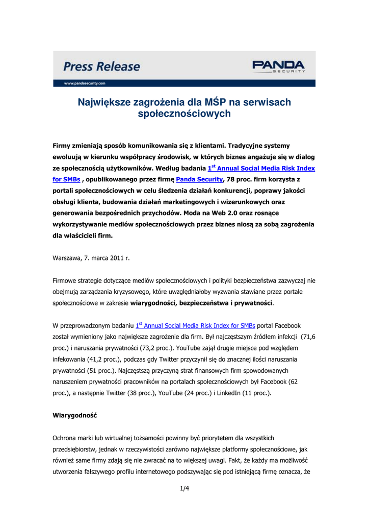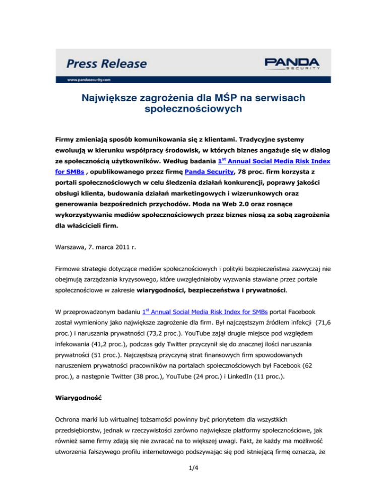 Największe zagrożenia dla MŚP na serwisach społecznościowych Firmy zmieniają sposób komunikowania się z klientami. Tradycyjne systemy ewoluują w kierunku współpracy środowisk, w których biznes angażuje się w dialog ze społecznością użytkowników. Według badania 1st Annual Social Media Risk Index for SMBs , opublikowanego przez firmę Panda Security, 78 proc. firm korzysta z portali społecznościowych w celu śledzenia działań konkurencji, poprawy jakości obsługi klienta, budowania działań marketingowych i wizerunkowych oraz generowania bezpośrednich przychodów. Moda na Web 2.0 oraz rosnące wykorzystywanie mediów społecznościowych przez biznes niosą za sobą zagrożenia dla właścicieli firm. Warszawa, 7. marca 2011 r. Firmowe strategie dotyczące mediów społecznościowych i polityki bezpieczeństwa zazwyczaj nie obejmują zarządzania kryzysowego, które uwzględniałoby wyzwania stawiane przez portale społecznościowe w zakresie wiarygodności, bezpieczeństwa i prywatności. W przeprowadzonym badaniu 1st Annual Social Media Risk Index for SMBs portal Facebook został wymieniony jako największe zagrożenie dla firm. Był najczęstszym źródłem infekcji (71,6 proc.) i naruszania prywatności (73,2 proc.). YouTube zajął drugie miejsce pod względem infekowania (41,2 proc.), podczas gdy Twitter przyczynił się do znacznej ilości naruszania prywatności (51 proc.). Najczęstszą przyczyną strat finansowych firm spowodowanych naruszeniem prywatności pracowników na portalach społecznościowych był Facebook (62 proc.), a następnie Twitter (38 proc.), YouTube (24 proc.) i LinkedIn (11 proc.). Wiarygodność Ochrona marki lub wirtualnej tożsamości powinny być priorytetem dla wszystkich przedsiębiorstw, jednak w rzeczywistości zarówno największe platformy społecznościowe, jak również same firmy zdają się nie zwracać na to większej uwagi. Fakt, że każdy ma możliwość utworzenia fałszywego profilu internetowego podszywając się pod istniejącą firmę oznacza, że 1/4 dowolna osoba jest w stanie przemawiać w imieniu instytucji w rzeczywistości nie mając z nią nic wspólnego. Może to prowadzić do powstania społeczności użytkowników postrzegających konto firmowe za wiarygodne źródło, a publikowane na nim informacje są w stanie skutecznie psuć wizerunek marki oraz jej relacje z otoczeniem. Jedynie kilka portali społecznościowych, takich jak Twitter, pozwala użytkownikom zdefiniować konto jako autentyczne poprzez Verified Badge, jednak zdecydowana większość nie zawiera takiej opcji. W związku z tym zaleca się, aby na bieżąco rejestrować wszystkie nazwy handlowe firmy na głównych portalach społecznościowych, aby jasno określić oficjalny kanał komunikacji, jeżeli nie ma innego mechanizmu weryfikacji. Bezpieczeństwo Podczas korzystania z mediów społecznościowych firmy zmagają się z tymi samymi problemami co osoby prywatne, jednak dla nich skutki mogą okazać się o wiele bardziej szkodliwe. Główne obawy związane z kwestią bezpieczeństwa obejmują: - Kradzież tożsamości. Konta administratorów mogą zostać zainfekowane, a ich dane i hasła mogą zostać wykradzione. Ostatecznie prowadzi to do sytuacji, w której ktoś obcy jest w stanie przejąć kontrolę nad kontem firmowym, by podejmować dowolne działania, na przykład rozsyłać zaproszenia na jakieś wydarzenie (poprzez konto na Facebooku) zawierające złośliwe linki. Dodatkowo, użytkownik, który kontroluje konto może publikować dowolne informacje na oficjalnym profilu firmy z katastrofalnym skutkiem dla jej wizerunku. - Ryzyko infekcji. Cyberprzestępcy mogą wykorzystać aplikacje do komunikacji lub platformy mikroblogowe, aby rozsyłać użytkownikom fałszywe linki. W przypadku dużych przedsiębiorstw możliwe są nawet ukierunkowane ataki zorganizowane specjalnie, by zainfekować komputery w celu przeniknięcia do sieci i uzyskania dostępu do wszelkiego rodzaju informacji firmowych. Możliwe jest także rozprzestrzenianie złośliwych linków poprzez wklejanie ich na tablicach użytkowników. Wszelkie tego typu działania stanowią zagrożenie dla wizerunku marki. - Luki w zabezpieczeniach platform. W 2010 roku pojawiło się wiele exploitów, które wykorzystywały błędy w oprogramowaniu popularnych portali społecznościowych, takich jak Facebook lub Twitter, narażając miliony użytkowników na niebezpieczeństwo. W związku z tym, że coraz więcej osób rejestruje się na tych stronach, wykonywanych jest coraz więcej prób odnalezienia luk w systemach bezpieczeństwa, a wiele z nich dokonują niestety hakerzy. 2/4 Przestrzeganie przydatnych praktyk zarządzania hasłami, takich jak ich regularna zmiana i wzmacnianie (poprzez kombinację znaków alfanumerycznych), może pomóc w ochronie firmy. Świadomość potrzeby bezpieczeństwa, edukacja, jak również śledzenie na bieżąco najnowszych zagrożeń z pewnością przyczyni się do lepszej czujności oraz do wykrycia wszelkich nieprawidłowości. Prywatność Profile firm są zarządzane przez administratorów niekiedy udostępniających zbyt dużo informacji, które mogą następnie być wykorzystywane przeciwko firmie w sieci, a nawet poza nią. Przykładowo zbyt wielkim ryzykiem jest podawanie danych dotyczących finansów firmy, działań, pracy itp. Ponadto, jak pokazują badania, 77 proc. pracowników MŚP wykorzystuje sieci społecznościowe w czasie pracy i może dzielić się na nich poufnymi informacjami. „Razem z lepszą ochroną sieci korporacyjnych, użycie zdrowego rozsądku, często najmniej wykorzystywanego spośród zmysłów, jest tym, co powinno się zrobić, by pozbyć się problemów wywołanych przez zagrożenia internetowe i ochronę prywatności” – mówi Luis Corrons, dyrektor techniczny PandaLabs. Posiadanie odpowiednich programów szkoleniowych i zastosowanie odpowiedniej polityki mediów społecznościowych znacznie przyc