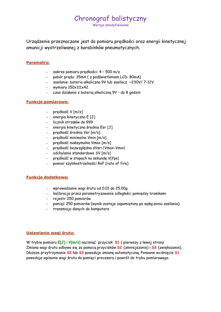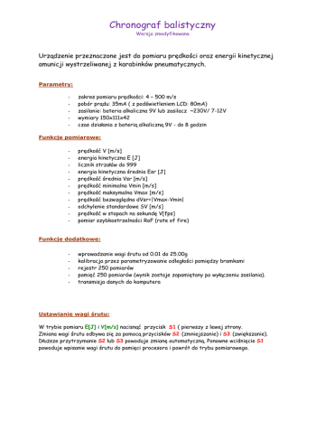Chronograf balistyczny Wersja zmodyfikowana Urządzenie przeznaczone jest do pomiaru prędkości oraz energii kinetycznej amunicji wystrzeliwanej z karabinków pneumatycznych. Parametry: - zakres pomiaru prędkości: 4 – 500 m/s pobór prądu: 35mA ( z podświetleniem LCD: 80mA) zasilanie: bateria alkaliczna 9V lub zasilacz ~230V/ 7-12V wymiary 150x111x42 czas działania z baterią alkaliczną 9V - do 8 godzin Funkcje pomiarowe: - prędkość V [m/s] energia kinetyczna E [J] licznik strzałów do 999 energia kinetyczna średnia Esr [J] prędkość średnia Vsr [m/s] prędkość minimalna Vmin [m/s] prędkość maksymalna Vmax [m/s] prędkość bezwzględna dVsr=|Vmax-Vmin| odchylenie standardowe SV [m/s] prędkość w stopach na sekundę V[fps] pomiar szybkostrzelności RoF (rate of fire) Funkcje dodatkowe: - wprowadzanie wagi śrutu od 0.01 do 25.00g kalibracja przez parametryzowanie odległości pomiędzy bramkami rejestr 250 pomiarów pamięć 250 pomiarów (wynik zostaje zapamiętany po wyłączeniu zasilania). transmisja danych do komputera Ustawianie wagi śrutu: W trybie pomiaru E[J] i V[m/s] nacisnąć przycisk S1 ( pierwszy z lewej strony. Zmiana wagi śrutu odbywa się za pomocą przycisków S2 (zmniejszanie) i S3 (zwiększanie). Dłuższe przytrzymanie S2 lub S3 powoduje zmianę automatyczną. Ponowne wciśnięcie S1 powoduje wpisanie wagi śrutu do pamięci procesora i powrót do trybu pomiarowego. Pomiar: Ustawić lufę karabinka nad szyną i strzelić przez 2 bramki optyczne. Jeżeli prędkość jest mniejsza od 4m/s lub zareaguje tylko pierwsza bramka, wówczas zapala się czerwony wskaźnik i zostaje wyświetlony komunikat „zakres”. Cykliczne naciskanie S2 powoduje, że zostaje wyświetlony: - numer strzału 1-999 energia średniej Esr prędkość średnia Vsr prędkość minimalna Vmin prędkość maksymalna Vmax różnica prędkości |dV| = Vmax-Vmin odchylenie standardowe prędkości SV prędkość w stopach na sekundę tryb pomiaru szybkostrzelności Naciśnięcie przycisku S3 (trzeci od lewej) powoduje powrót do trybu początkowego. W trybie początkowym przycisk S3 kasuje wyniki pomiaru. Żeby skasować wynik trzeba przytrzymać dłużej niż 1 sekundę. Rejestr wyników Moduł posiada rejestr 250 pomiarów prędkości. Przeglądanie rejestru odbywa się za pomocą S2 i S3. Przekroczenie rozmiaru rejestru, powoduje nadpisanie istniejących wyników. Pomiar może być realizowany także w trybie przeglądania rejestru. Pamięć EEPROM Rejestr może być zapamiętany w pamięci eeprom i odtworzony po ponownym włączeniu zasilania. Kolejne pomiary będą wówczas zapisywane w wolnych komórkach rejestru. Licznik strzałów pracuje wówczas od zera. Każdy nowy zapis do eeprom nadpisuje poprzednio zapisane dane. W celu zachowania wcześniejszych wyników przechowywanych w eeprom należy odczytać dane z pamięci i rozpocząć nowy pomiar. Połączenie z komputerem Komunikacja z komputerem możliwa jest po zastosowaniu przewodu USB/FBUS lub standardowego kabla RS232. Wybór kabla dokonywany jest przez przełączenie zworki na złączu P7 na płycie. Prędkość transmisji wynosi 19200 bps. Dane wysyłane po każdym strzale oraz podczas odczytu pamięci eeprom. Do odbioru można wykorzystać Hyper Terminal z Windows. Z Hyper Terminal pomiary można kopiować do pliku tekstowego lub arkusza kalkulacyjnego. Dodatkową opcją jest możliwość zmiany znaku rozdzielającego część całkowitą liczby od dziesiętnej. W celu dokonania wyboru kropki lub przecinka, należy przed włączeniem zasilania wcisnąć jednocześnie S1,S2 i S3. Zmiana następuje przemiennie. Hyper Terminal Sterowanie przepływem wybrać: Brak lub Sprzęt. Skonfigurowane połączenie można zapisać jako plik sesji: Plik -> Zapisz jako. Po uruchomieniu pliku sesji zostanie uruchomiony Hyper Terminal z wprowadzonymi ustawieniami. Kalibracja: Wcisnąć S3 i włączyć zasilanie – po 1 sekundzie pojawi się komunikat <bramka> oraz parametr odległości pomiędzy bramkami. Zmiana parametru powoduje zmianę pomiaru prędkości i energii. V=Odległość między bramkami / czas Przy prędkości V=230m/s zwiększenie parametru o 0.1mm powoduje zwiększenie mierzonej prędkości o ok. 0.3m/s Przyciski S2 i S3 umożliwiają zmianę parametru odległości bramek. Naciśnięcie S1 powoduje zapis i powrót do pomiaru. Pomiar odległości między bramkami na szynie można dokonać suwmiarką mierząc odległości Lz i Lw pomiędzy dwoma czujnikami. Oznaczając Lz – odległość po stronie zewnętrznej, Lw – odległość po stronie wewnętrznej: L=(Lz+Lw)/2 Kalibrację można wykonać również metodą porównawczą, która polega na porównaniu prędkości z innym przyrządem wzorcowym. Przy tym sposobie należy obliczyć parametr L – odległość pomiędzy bramkami i wprowadzić do pamięci. L= Lk * Vw / Vk L[cm] - obliczona odległość pomiędzy bramkami Lk[cm] - odległość pomiędzy bramkami wprowadzona do chronografu przy kalibracji zgrubnej. Vk[m/s] - prędkość mierzona przez chronograf kalibrowany Vw[m/s] - prędkość mierzona przez chronograf wzorcowy Pomiar szybkostrzelności ( RoF – rate of fire ) RoF wyświetlany jest jako liczba strzałów oddanych w ciągu sekundu ( RPS ) lub minuty ( RPM ). Dolna granica pomiaru wynosi: 3.5 RPM. Formuła matermatyczna (N – liczba strzałów, ti – mierzony czas ): Ustawienie trybu pomiaru RoF Po włączeniu zasilania wybrać tryb pomiaru RoF używając przycisku S2. Pomiar Należy wykonać kilka strzałów. Pociski muszą przelecieć przez pierwszą bramkę optyczną. Na wyświetlaczu pojawią się wyniki: liczba strzałów na sekundę ( RPS ), liczba strzałów na minutę ( RPM ) oraz numer strzału. Przełączanie pomiędzy RPS i RPM odbywa się za pomocą przycisku S1. Pomiar jest inicjowany przez pierwszy strzał. Wynik jest wyświetlany już po drugim strzale. Czas całego cyklu pomiarowy wynosi: t1 + t2 + t3 + ……. + tn + 16 sekund gdz
