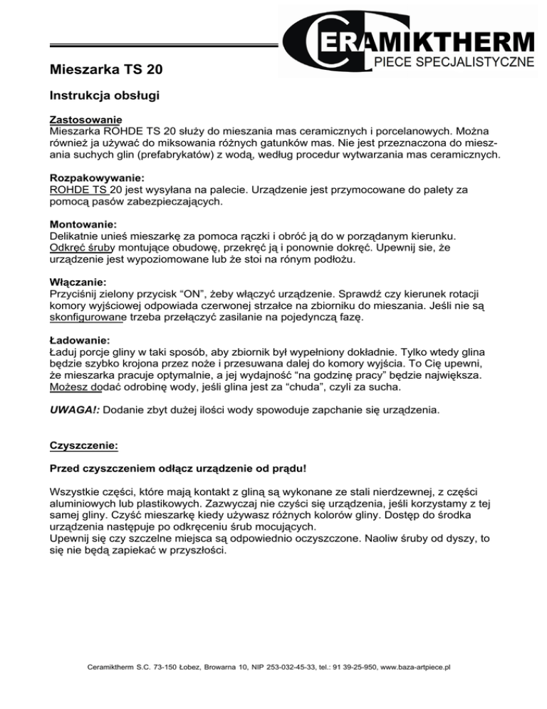 Mieszarka TS 20 Instrukcja obsługi Zastosowanie Mieszarka ROHDE TS 20 służy do mieszania mas ceramicznych i porcelanowych. Można również ja używać do miksowania różnych gatunków mas. Nie jest przeznaczona do mieszania suchych glin (prefabrykatów) z wodą, według procedur wytwarzania mas ceramicznych. Rozpakowywanie: ROHDE TS 20 jest wysyłana na palecie. Urządzenie jest przymocowane do palety za pomocą pasów zabezpieczających. Montowanie: Delikatnie unieś mieszarkę za pomoca rączki i obróć ją do w porządanym kierunku. Odkręć śruby montujące obudowę, przekręć ją i ponownie dokręć. Upewnij sie, że urządzenie jest wypoziomowane lub że stoi na rónym podłożu. Włączanie: Przyciśnij zielony przycisk “ON”, żeby włączyć urządzenie. Sprawdź czy kierunek rotacji komory wyjściowej odpowiada czerwonej strzałce na zbiorniku do mieszania. Jeśli nie są skonfigurowane trzeba przełączyć zasilanie na pojedynczą fazę. Ładowanie: Ładuj porcje gliny w taki sposób, aby zbiornik był wypełniony dokładnie. Tylko wtedy glina będzie szybko krojona przez noże i przesuwana dalej do komory wyjścia. To Cię upewni, że mieszarka pracuje optymalnie, a jej wydajność “na godzinę pracy” będzie największa. Możesz dodać odrobinę wody, jeśli glina jest za “chuda”, czyli za sucha. UWAGA!: Dodanie zbyt dużej ilości wody spowoduje zapchanie się urządzenia. Czyszczenie: Przed czyszczeniem odłącz urządzenie od prądu! Wszystkie części, które mają kontakt z gliną są wykonane ze stali nierdzewnej, z części aluminiowych lub plastikowych. Zazwyczaj nie czyści się urządzenia, jeśli korzystamy z tej samej gliny. Czyść mieszarkę kiedy używasz różnych kolorów gliny. Dostęp do środka urządzenia następuje po odkręceniu śrub mocujących. Upewnij się czy szczelne miejsca są odpowiednio oczyszczone. Naoliw śruby od dyszy, to się nie będą zapiekać w przyszłości. Ceramiktherm S.C. 73-150 Łobez, Browarna 10, NIP 253-032-45-33, tel.: 91 39-25-950, www.baza-artpiece.pl Eksploatacja: Silnik nie wymaga żadnej konserwacji. Olej musi być wymieniany zgodnie z poniższymi wskaźnikami: Co każde 4 tyś. godzin pracy lub przynajmniej co 4 lata. 0,5L syntetycznego oleju powinno wystarczyć, użyj np.: SAE 85 W 90 Systemy ochronne: Mieszarka jest wyposażona w trzy systemy ochronne: 1. Ochrona urazowa: Po wciśnięciu przycisku bezpieczeństwa urządzenie wyłącza się natychmiast. Ponowne włączenie wymaga naciśnięcia przycisku włączającego urządzenie - “ON”. 2. Ochrona przeciążenia silnika: Jeśli ładunek jest zbyt twardy lub ciężki, włącza się bezpiecznik ochrony silnika. Sytuacja ta się również zdarzy, jeśli jest wadliwe zasilanie bądź nastąpi spięcie w instalacji elektrycznej. Żeby ponownie uruchomić silnik zresetuj urządzenie poprzez wyłączenie wtyczki z gniazda, a potem odczekaj 3 minuty, żeby silnik mógł się trochę ochłodzić. 3. Włącznik bezpieczeństwa: Włącznik ON/OFF“jest zabezpieczony bezpiecznikiem umieszczonym w czarnym schowku, przy włącznikach. Parametry: Silnik: Zasilanie: 1,5 kW, 1400 U/min 230 Volt /16 A Średnica dyszy: Max. wydajność 80 mm 600 kg/h Wymiary: Wys.: Szer.: Głęb.: 1100 mm 550 mm 1100 mm Poziom hałasu: 76 dB (A) Ceramiktherm S.C. 73-150 Łobez, Browarna 10, NIP 253-032-45-33, tel.: 91 39-25-950, www.baza-artpiece.pl