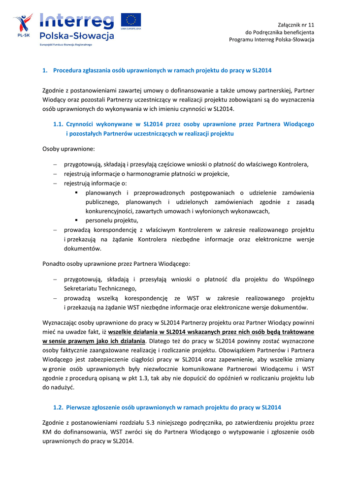 Załącznik nr 11 do Podręcznika beneficjenta Programu Interreg Polska-Słowacja 1. Procedura zgłaszania osób uprawnionych w ramach projektu do pracy w SL2014 Zgodnie z postanowieniami zawartej umowy o dofinansowanie a także umowy partnerskiej, Partner Wiodący oraz pozostali Partnerzy uczestniczący w realizacji projektu zobowiązani są do wyznaczenia osób uprawnionych do wykonywania w ich imieniu czynności w SL2014. 1.1. Czynności wykonywane w SL2014 przez osoby uprawnione przez Partnera Wiodącego i pozostałych Partnerów uczestniczących w realizacji projektu Osoby uprawnione: przygotowują, składają i przesyłają częściowe wnioski o płatność do właściwego Kontrolera, rejestrują informacje o harmonogramie płatności w projekcie, rejestrują informacje o: planowanych i przeprowadzonych postępowaniach o udzielenie zamówienia publicznego, planowanych i udzielonych zamówieniach zgodnie z zasadą konkurencyjności, zawartych umowach i wyłonionych wykonawcach, personelu projektu, prowadzą korespondencję z właściwym Kontrolerem w zakresie realizowanego projektu i przekazują na żądanie Kontrolera niezbędne informacje oraz elektroniczne wersje dokumentów. Ponadto osoby uprawnione przez Partnera Wiodącego: przygotowują, składają i przesyłają wnioski o płatność dla projektu do Wspólnego Sekretariatu Technicznego, prowadzą wszelką korespondencję ze WST w zakresie realizowanego projektu i przekazują na żądanie WST niezbędne informacje oraz elektroniczne wersje dokumentów. Wyznaczając osoby uprawnione do pracy w SL2014 Partnerzy projektu oraz Partner Wiodący powinni mieć na uwadze fakt, iż wszelkie działania w SL2014 wskazanych przez nich osób będą traktowane w sensie prawnym jako ich działania. Dlatego też do pracy w SL2014 powinny zostać wyznaczone osoby faktycznie zaangażowane realizację i rozliczanie projektu. Obowiązkiem Partnerów i Partnera Wiodącego jest zabezpieczenie ciągłości pracy w SL2014 oraz zapewnienie, aby wszelkie zmiany w gronie osób uprawnionych były niezwłocznie komunikowane Partnerowi Wiodącemu i WST zgodnie z procedurą opisaną w pkt 1.3, tak aby nie dopuścić do opóźnień w rozliczaniu projektu lub do nadużyć. 1.2. Pierwsze zgłoszenie osób uprawnionych w ramach projektu do pracy w SL2014 Zgodnie z postanowieniami rozdziału 5.3 niniejszego podręcznika, po zatwierdzeniu projektu przez KM do dofinansowania, WST zwróci się do Partnera Wiodącego o wytypowanie i zgłoszenie osób uprawnionych do pracy w SL2014. Partner Wiodący powinien zwrócić się do pozostałych Partnerów projektu o przekazanie wypełnionych Wniosków o nadanie/zmianę dostępu dla osoby uprawnionej w ramach SL2014 dla każdej osoby wyznaczonej przez danego Partnera. Identyczne wnioski są wypełniane przez Partnera Wiodącego dla osób wyznaczanych przez niego. Wzór wniosku stanowi załącznik nr 1 do procedury. Każdy wniosek powinien zostać podpisany przez osobę umocowaną do występowania w imieniu Partnera/Partnera Wiodącego (np. Wójt, Burmistrz, Prezes Zarządu Stowarzyszenia). Możliwe jest zgłoszenie więcej niż jednej osoby uprawnionej do pracy w SL2014 przez Partnera Wiodącego lub Partnera projektu. Na podstawie otrzymanych Wniosków o nadanie/zmianę dostępu dla osoby uprawnionej w ramach SL2014 Partner Wiodący przygotowuje Listę osób uprawnionych do pracy w SL2014 wg wzoru stanowiącego załącznik do umowy o dofinansowanie. Powyższa lista zawiera informacje o osobach uprawnionych do pracy w SL2014 przez Partnera Wiodącego oraz pozostałych Partnerów uczestniczących w realizacji projektu. Każda część listy (oddzielnie dla każdego Partnera) jest podpisywana przez osobę uprawnioną do reprezentowania Partnera Wiodącego. Lista osób uprawnionych do pracy w SL2014 wraz z Wnioskami o nadanie/zmianę dostępu dla osoby uprawnionej w ramach SL2014 przekazywana jest przez Partnera Wiodącego do WST w terminie wyznaczonym przez WST. Przekazanie ww. dokumentów warunkuje podpisanie umowy przez IZ i utworzenie kont w SL2014 dla osób wymienionych w Liście osób uprawnionych do pracy w SL2014. Brak konta w SL2014 uniemożliwia przystąpienie do rozliczania projektu przez danego Partnera projektu lub Partnera Wiodącego. 1.3. Zgłoszenie zmiany w gronie osób uprawnionych w ramach projektu do pracy w SL2014 W przypadku konieczności wprowadzenia zmian w gronie osób uprawnionych do pracy w SL2014, wynikającej w szczególności z: zmiany danych identyfikujących daną osobę uprawnioną tj. adresu e-mail lub nazwiska; potrzeby wyznaczenia nowej osoby do pracy w SL2014; dłuższej nieobecności (spowodowanej np. urlopem macierzyńskim) lub zakończenia pracy przez dotychczas wyznaczoną osobę uprawnioną; właściwy Partner projektu lub Partner Wiodący przygotowuje niezwłocznie Wniosek o nadanie/zmianę dostępu dla osoby uprawnionej w ramach SL2014 lub Wniosek o wycofanie dostępu dla osoby uprawnionej w ramach SL2014 (stanowiący załącznik nr 2 do procedury). Odpowiednie wnioski, wypełnione i podpisane przez osobę umocowaną do występowania w imieniu Partnera przekazywane są do Partnera Wiodącego. Jeśli zmiany dotyczą osób wskazanych przez Partnera Wiodącego, odpowiedni wniosek jest wypełniany i podpisywany przez osobę umocowaną do występowania w imieniu Partnera Wiodącego. Partner Wiodący na podstawie otrzymanych lub sporządzonych przez siebie Wniosków o nadanie/zmianę dostępu dla osoby uprawnionej w ramach SL2014 lub Wniosków o wycofanie 2 dostępu dla osoby uprawnionej w ramach SL2014 aktualizuje Listę osób uprawnionych do pracy w SL2014 (wg wzoru stanowiącego załącznik do umowy o dofinansowanie). Lista osób uprawnionych do pracy w SL2014, podpisana przez osobę uprawnioną do reprezentowania Partnera Wiodącego, wraz z Wnioskami o nadanie/zmianę dostępu dla osoby uprawnionej w ramach SL2014 lub Wnioskami o wycofanie dostępu dla osoby uprawnionej w ramach SL2014