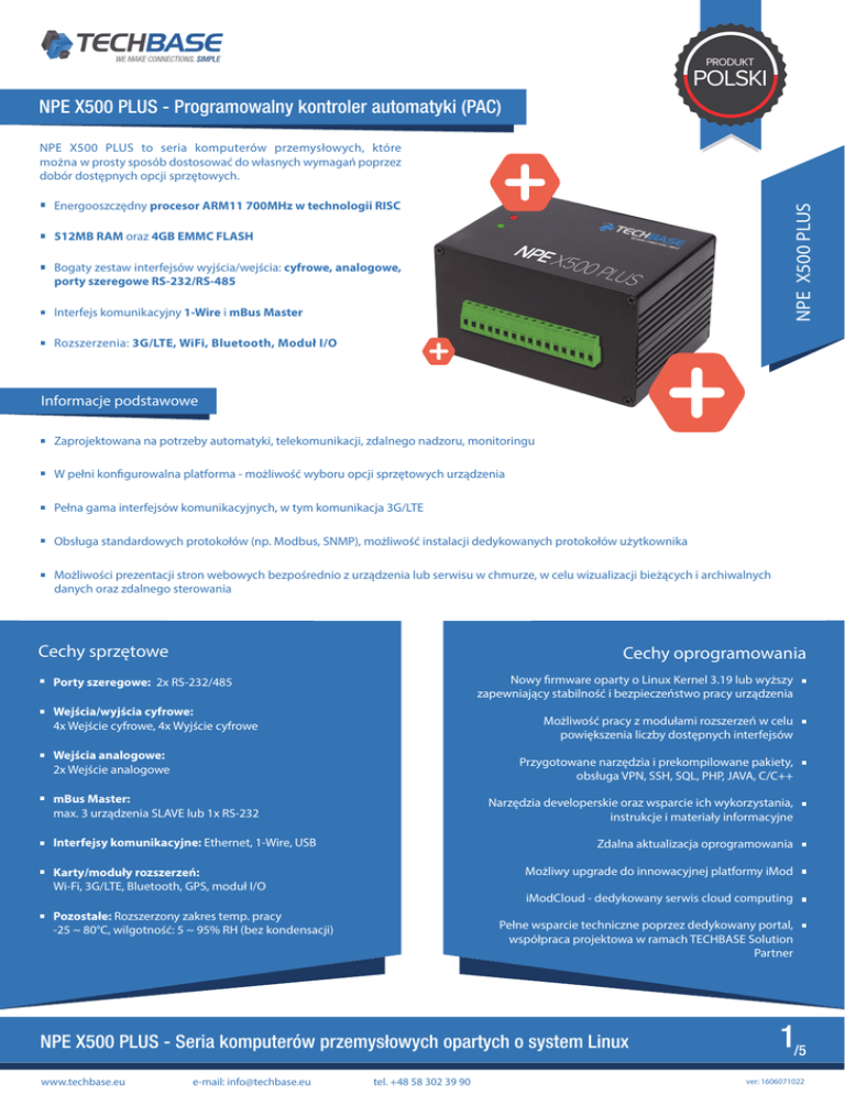 PRODUKT POLSKI NPE X500 PLUS - Programowalny kontroler automatyki (PAC) NPE X500 PLUS to seria komputerów przemysłowych, które można w prosty sposób dostosować do własnych wymagań poprzez dobór dostępnych opcji sprzętowych. 512MB RAM oraz 4GB EMMC FLASH NPE X500 PLUS Energooszczędny procesor ARM11 700MHz w technologii RISC NPE X 500 P LUS Bogaty zestaw interfejsów wyjścia/wejścia: cyfrowe, analogowe, porty szeregowe RS-232/RS-485 Interfejs komunikacyjny 1-Wire i mBus Master Rozszerzenia: 3G/LTE, WiFi, Bluetooth, Moduł I/O Informacje podstawowe Zaprojektowana na potrzeby automatyki, telekomunikacji, zdalnego nadzoru, monitoringu W pełni konfigurowalna platforma - możliwość wyboru opcji sprzętowych urządzenia Pełna gama interfejsów komunikacyjnych, w tym komunikacja 3G/LTE Obsługa standardowych protokołów (np. Modbus, SNMP), możliwość instalacji dedykowanych protokołów użytkownika Możliwości prezentacji stron webowych bezpośrednio z urządzenia lub serwisu w chmurze, w celu wizualizacji bieżących i archiwalnych danych oraz zdalnego sterowania Cechy sprzętowe Cechy oprogramowania Nowy firmware oparty o Linux Kernel 3.19 lub wyższy zapewniający stabilność i bezpieczeństwo pracy urządzenia Porty szeregowe: 2x RS-232/485 Wejścia/wyjścia cyfrowe: 4x Wejście cyfrowe, 4x Wyjście cyfrowe Możliwość pracy z modułami rozszerzeń w celu powiększenia liczby dostępnych interfejsów Wejścia analogowe: 2x Wejście analogowe Przygotowane narzędzia i prekompilowane pakiety, obsługa VPN, SSH, SQL, PHP, JAVA, C/C++ mBus Master: max. 3 urządzenia SLAVE lub 1x RS-232 Narzędzia developerskie oraz wsparcie ich wykorzystania, instrukcje i materiały informacyjne Interfejsy komunikacyjne: Ethernet, 1-Wire, USB Zdalna aktualizacja oprogramowania Możliwy upgrade do innowacyjnej platformy iMod Karty/moduły rozszerzeń: Wi-Fi, 3G/LTE, Bluetooth, GPS, moduł I/O iModCloud - dedykowany serwis cloud computing Pozostałe: Rozszerzony zakres temp. pracy -25 ~ 80°C, wilgotność: 5 ~ 95% RH (bez kondensacji) Pełne wsparcie techniczne poprzez dedykowany portal, współpraca projektowa w ramach TECHBASE Solution Partner NPE X500 PLUS - Seria komputerów przemysłowych opartych o system Linux www.techbase.eu e-mail: [email protected] tel. +48 58 302 39 90 1/5 ver: 1606071022 Zastosowania Typowy sposób wykorzystania (3-funkcyjne użycie: C-L-V) NPE X500 PLUS funkcjonalność konwertera protokołów i interfejsów (Convert) - pobieranie danych z interfejsów wejściowych, konwersja i przekazywanie na interfejsy wyjściowe np. 3G/LTE do modułów zewnętrznych funkcjonalność rejestratora danych (Log) - archiwizowanie danych z możliwością ich udostępniania w formie pliku, bazy danych lub za pomocą zewnętrznych systemów (np. SCADA lub dedykowany iModCloud) funkcjonalność dostępu poprzez strony webowe (Visualize) - dane są prezentowane bezpośrednio z urządzenia lub za pomocą dedykowanych serwisów typu cloud computing (iModCloud) Dostęp przez przeglądarkę Urządzenia zewnętrzne I/O Dane wejściowe/ wyjściowe NPE X500 PLUS może być użyty jako: NPE X500 PLUS Serwer danych np. SCADA Cechy przystosowania do warunków przemysłowych: Małe zużycie energii Sterownik PLC Moduł telemetryczny z rejestratorem danych Serwer portów szeregowych Konwerter protokołów i interfejsów Zegar czasu rzeczywistego (RTC) podtrzymywany bateryjnie Funkcja WatchDog zapewnia kontrolę pracy wybranych usług na poziomie sprzętowym Efektywne systemy plików zastosowane do pamięci FLASH zapewniające długą, bezawaryjną pracę Kontroler programowalny Modem 3G/LTE Zwarta, wytrzymała obudowa z aluminium, przystosowana do instalacji na szynie DIN MODBUS Gateway/Router Agent SNMP Serwer WWW z obsługą PHP i bazy danych SQL Wygodny sposób instalacji dzięki zastosowaniu rozłączalnych terminali śrubowych Bramka SMS Brak elementów ruchomych (wentylatorów, dysków talerzowych) 3G/LTE router, NAT Serwer e-mail, FTP, SSH, VPN i innych usług systemu Linux Wersje z rozszerzonym zakresem temperatur pracy: -25 ~ 80°C Modem 3G/LTE* Modem zapewnia transmisję danych w standardzie 3G/LTE oraz wysyłanie i odbiór wiadomości SMS. NPE posiada specjalnie zaprojektowane cechy sprzętowo-programowe zapewniające funkcjonalność i ekonomiczność połączenia: By zapewnić stabilność pracy modemu urządzenie zostało wyposażone w mechanizm Watchdog. Preinstalowane oprogramowanie zapewnia ciągłą weryfikację poprawności połączenia 3G/LTE oraz inicjalizuje je w przypadku jego rozłączenia (usługa reconnect). Serwer mutlipleksacji połączenia modemowego zapewnia 3 niezależne kanały komunikacyjne z modemem. Między innymi umożliwia wysyłanie i odbiór SMS'ów w trakcie transmisji 3G/LTE. Możliwość wykorzystania telemetrycznych kart SIM ze zmiennymi adresami IP dzięki zastosowaniu usługi DynDNS. Dzięki technologii VPN oraz iModCloud, urządzenie umożliwia wykorzystanie kart o niepublicznym adresie IP. * w zależności od modelu NPE X500 PLUS - Seria komputerów przemysłowych opartych o system Linux www.techbase.eu e-mail: [email protected] tel. +48 58 302 39 90 2/5 ver: 1606071022 iMod - innowacyjna platforma oprogramowania pozwalająca na szybki start i pełne wykorzystanie możliwości urządzenia bez potrzeby programowania. W pełni konfigurowalny system, który odzwierciedla typowe użycie C-L-V (patrz wyjaśnienie wyżej). Aby dowiedzieć się więcej na temat platformy iMod wejdź na stronę: www.techbase.eu/imod iModCloud to oprogramowanie-usługa, które umożliwia pełną kontrolę urządzeń iMod. Wspólnie tworzą autonomiczne rozwiązanie – iModCloud Ecosystem. Innymi słowy - jest to kombinacja usługi w chmurze z interfejsem webowym użytkownika oraz urządzeń przemysłowych, w pełni zarządzalnych zdalnie. NPE X500 PLUS Dedykowane oprogramowanie dostępne na urządzeniu: GOTOWY DO UŻYCIA iModCloud to zestaw gotowych do użycia komponentów