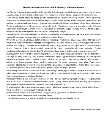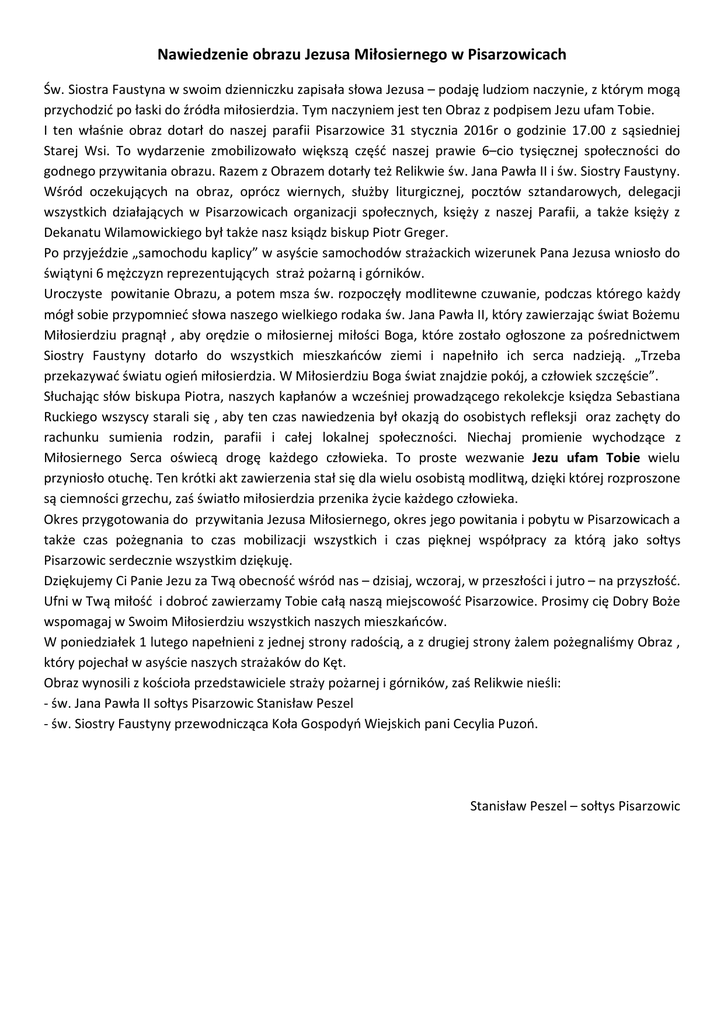 Nawiedzenie obrazu Jezusa Miłosiernego w Pisarzowicach Św. Siostra Faustyna w swoim dzienniczku zapisała słowa Jezusa – podaję ludziom naczynie, z którym mogą przychodzić po łaski do źródła miłosierdzia. Tym naczyniem jest ten Obraz z podpisem Jezu ufam Tobie. I ten właśnie obraz dotarł do naszej parafii Pisarzowice 31 stycznia 2016r o godzinie 17.00 z sąsiedniej Starej Wsi. To wydarzenie zmobilizowało większą część naszej prawie 6–cio tysięcznej społeczności do godnego przywitania obrazu. Razem z Obrazem dotarły też Relikwie św. Jana Pawła II i św. Siostry Faustyny. Wśród oczekujących na obraz, oprócz wiernych, służby liturgicznej, pocztów sztandarowych, delegacji wszystkich działających w Pisarzowicach organizacji społecznych, księży z naszej Parafii, a także księży z Dekanatu Wilamowickiego był także nasz ksiądz biskup Piotr Greger. Po przyjeździe „samochodu kaplicy” w asyście samochodów strażackich wizerunek Pana Jezusa wniosło do świątyni 6 mężczyzn reprezentujących straż pożarną i górników. Uroczyste powitanie Obrazu, a potem msza św. rozpoczęły modlitewne czuwanie, podczas którego każdy mógł sobie przypomnieć słowa naszego wielkiego rodaka św. Jana Pawła II, który zawierzając świat Bożemu Miłosierdziu pragnął , aby orędzie o miłosiernej miłości Boga, które zostało ogłoszone za pośrednictwem Siostry Faustyny dotarło do wszystkich mieszkańców ziemi i napełniło ich serca nadzieją. „Trzeba przekazywać światu ogień miłosierdzia. W Miłosierdziu Boga świat znajdzie pokój, a człowiek szczęście”. Słuchając słów biskupa Piotra, naszych kapłanów a wcześniej prowadzącego rekolekcje księdza Sebastiana Ruckiego wszyscy starali się , aby ten czas nawiedzenia był okazją do osobistych refleksji oraz zachęty do rachunku sumienia rodzin, parafii i całej lokalnej społeczności. Niechaj promienie wychodzące z Miłosiernego Serca oświecą drogę każdego człowieka. To proste wezwanie Jezu ufam Tobie wielu przyniosło otuchę. Ten krótki akt zawierzenia stał się dla wielu osobistą modlitwą, dzięki której rozproszone są ciemności grzechu, zaś światło miłosierdzia przenika życie każdego człowieka. Okres przygotowania do przywitania Jezusa Miłosiernego, okres jego powitania i pobytu w Pisarzowicach a także czas pożegnania to czas mobilizacji wszystkich i czas pięknej współpracy za którą jako sołtys Pisarzowic serdecznie wszystkim dziękuję. Dziękujemy Ci Panie Jezu za Twą obecność wśród nas – dzisiaj, wczoraj, w przeszłości i jutro – na przyszłość. Ufni w Twą miłość i dobroć zawierzamy Tobie całą naszą miejscowość Pisarzowice. Prosimy cię Dobry Boże wspomagaj w Swoim Miłosierdziu wszystkich naszych mieszkańców. W poniedziałek 1 lutego napełnieni z jednej strony radością, a z drugiej strony żalem pożegnaliśmy Obraz , który pojechał w asyście naszych strażaków do Kęt. Obraz wynosili z kościoła przedstawiciele straży pożarnej i górników, zaś Relikwie nieśli: - św. Jana Pawła II sołtys Pisarzowic Stanisław Peszel - św. Siostry Faustyny przewodnicząca Koła Gospodyń Wiejskich pani Cecylia Puzoń. Stanisław Peszel – sołtys Pisarzowic