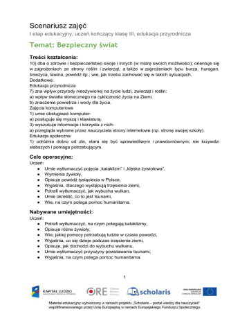 Scenariusz zajęć I etap edukacyjny, uczeń kończący klasę III, edukacja przyrodnicza Temat: Bezpieczny świat Treści kształcenia: 10) dba o zdrowie i bezpieczeństwo swoje i innych (w miarę swoich możliwości); orientuje się w zagrożeniach ze strony roślin i zwierząt, a także w zagrożeniach typu burza, huragan, śnieżyca, lawina, powódź itp.; wie, jak trzeba zachować się w takich sytuacjach. Dodatkowe: Edukacja przyrodnicza 7) zna wpływ przyrody nieożywionej na życie ludzi, zwierząt i roślin: a) wpływ światła słonecznego na cykliczność życia na Ziemi. b) znaczenie powietrza i wody dla życia. Zajęcia komputerowe 1) umie obsługiwać komputer: a) posługuje się myszą i klawiaturą. 3) wyszukuje informacje i korzysta z nich: a) przegląda wybrane przez nauczyciela strony internetowe (np. stronę swojej szkoły). Edukacja społeczna 1) odróżnia dobro od zła, stara się być sprawiedliwym i prawdomównym; nie krzywdzi słabszych i pomaga potrzebującym. Cele operacyjne: Uczeń: ● Umie wytłumaczyć pojęcia „kataklizm” i „klęska żywiołowa”, ● Wymienia żywioły, ● Opisuje powódź tysiąclecia w Polsce, ● Wyjaśnia, dlaczego występują trzęsienia ziemi, ● Potrafi wytłumaczyć, jak wybucha wulkan, ● Umie określić, co to jest tsunami, ● Wie, na czym polega pomoc humanitarna. Nabywane umiejętności: Uczeń: ● Potrafi wytłumaczyć, na czym polegają kataklizmy, ● Opisuje różne żywioły, ● Wie, jakiej pomocy potrzebują ludzie w czasie powodzi, ● Wyjaśnia, co się dzieje podczas trzęsienia ziemi, ● Opisuje, jak dochodzi do wybuchu wulkanu, ● Umie wytłumaczyć przyczyny powstawania tsunami, ● Wyjaśnia, na czym polega pomoc humanitarna. 1 Kompetencje kluczowe: ● ● ● ● Porozumiewanie się w języku ojczystym, Kompetencje informatyczne, Umiejętność uczenia się, Kompetencje społeczne i obywatelskie. Środki dydaktyczne: ● ● ● ● ● ● ● Tablica, Mapa Polski, Mapka obszarów na Ziemi objętych wstrząsami sejsmicznymi (np. atlasy geograficzne), Schemat budowy wulkanu1, Atlasy geograficzne (po jednym dla grupy uczniów), Komputery, rzutnik multimedialny, Zasoby multimedialne: ilustracja („Katastrofa naturalna”), prezentacja multimedialna („Polska i zagrożenia naturalne”). Metody nauczania: ● ● ● ● Podająca: wyjaśnienia, Problemowa: rozmowa kierowana, Praktyczna: pokaz, Programowana: z użyciem komputera. Formy pracy: ● ● Zbiorowa jednolita, Grupowa jednolita. Przebieg zajęć: Etap wstępny Nauczyciel wita dzieci i rozpoczyna rozmowę; zadaje pytania: ● Co to jest kataklizm? ● Jak inaczej nazywamy kataklizm? ● Dlaczego mowa jest o żywiołach? ● Co to są żywioły? Uczniowie przy pomocy prowadzącego wymieniają żywioły i zapisują je na tablicy. Etap realizacji Dzieci wymieniają klęski żywiołowe, a nauczyciel zapisuje je na tablicy i uzupełnia – w pierwszej kolejności podaje te, które mogą wystąpić w Polsce, a później na świecie (powódź, lawina śnieżna, pożar, huragan, tornado, trzęsienie ziemi, wybuch wulkanu, tsunami). Prowadzący zajęcia pyta, kogo dotyka klęska żywiołowa, czy tylko jedną osobę, na jakim obszarze występują kataklizmy, małym czy dużym. Uczniowie korzystają z ilustracji 1 Proponowane źródło: http://pl.wikipedia.org/wiki/Wulkan. Autor: MesserWoland. 2 z zasobów multimedialnych z definicją katastrofy naturalnej według polskiego prawa i głośno odczytują różne działania sił natury, które mogą spowodować kataklizm. Nauczyciel podejmuje dyskusję, tłumacząc każde zdarzenie (wstrząsy sejsmiczne, ekstremalne temperatury, osuwiska ziemi itp.). Warto zapoznać dzieci z cytatem aktu prawnego, bo pojęcia w nim zawarte pojawiają się w życiu codziennym, np. w wiadomościach, komunikatach władz lokalnych itp. Prowadzący pyta, czy w Polsce była kiedyś powódź, jakie miasta zalała woda z rzek. Wyjaśnia, że największa powódź w Polsce była w 1997 roku i nazwana została powodzią tysiąclecia. Dzieci podają, ile lat ma tysiąclecie. Prowadzący zajęcia pokazuje na mapie zasięg powodzi. Tłumaczy, dlaczego powódź dotyka naraz kilka państw – rzeki nie płyną na terenie tylko jednego kraju, łączą się ze sobą. Uczniowie, korzystając z internetu, oglądają zdjęcia i filmy z powodzi w Polsce2 i odpowiadają na pytania: ● Co powoduje powódź? ● Czy deszcz może padać nad jednym miastem, czy jest to zjawisko pogodowe, które utrzymuje się na dużym obszarze? ● Kto pomaga powodzianom? ● Czego brakuje im najbardziej? ● Co dzieje się ze zwierzętami w czasie powodzi? ● Jakie choroby grożą ludziom i dlaczego? ● Co to jest epidemia? Nauczyciel uzupełnia ich wiadomości. Dzieci oglądają prezentację z zasobów multimedialnych. Następnie uczniowie wypowiadają się na temat, w jakich rejonach świata najczęściej zdarzają się trzęsienia ziemi, na czym polega to zjawisko, co dzieje się z domami i ludźmi w trakcie wstrząsów, czy można temu zapobiec. Nauczyciel prezentuje dzieciom mapkę z zaznaczonym obszarem występowania wstrząsów na kuli ziemskiej, aby zobaczyły ogrom terenów objętych tym kataklizmem. Korzystając z internetu, pokazuje zdjęcia obrazujące zniszczenia w trakcie trzęsienia ziemi. Omawia zasadę działania sejsmografu i sposoby zachowania podczas trzęsienia ziemi. Uczniowie podczas rozmowy starają się określić, co to jest wulkan, wymienić nazwy wulkanów, wyjaśnić, w jakich miejscach one występują, co wydostaje się z wulkanu na powierzchnię ziemi, co to jest magma. Oglądają schemat budowy wulkanu, a nauczyciel opisuje poszczególne etapy erupcji. Następnie klasa zostaje podzielona na grupy, każda otrzymuje atlas i dzieci samodzielnie odnajdują wulkany na kuli ziemskiej. Odczytują z mapy, na jakich kontynentach lub wyspach na oceanach jest najwięcej wulkanów. Z pomocą nauczyciela podają nazwy państw, które są n
