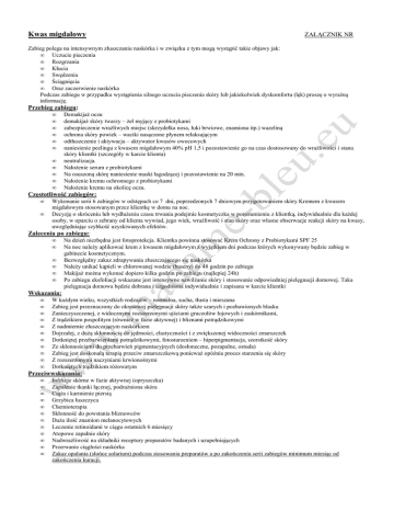 Kwas migdałowy ZAŁĄCZNIK NR Zabieg polega na intensywnym złuszczaniu naskórka i w związku z tym mogą wystąpić takie objawy jak: • Uczucie pieczenia • Rozgrzania • Kłucia • Swędzenia • Ściągnięcia • Oraz zaczerwienie naskórka Podczas zabiegu w przypadku wystąpienia silnego uczucia pieczenia skóry lub jakiekolwiek dyskomfortu (lęk) proszę o wyraźną informację. Przebieg zabiegu: • • • • • • • • • • • Demakijaż oczu demakijaż skóry twarzy – żel myjący z probiotykami zabezpieczenie wrażliwych miejsc (skrzydełka nosa, łuki brwiowe, znamiona itp.) wazeliną ochrona skóry powiek – waciki nasączone płynem relaksującym odtłuszczenie i aktywacja – aktywator kwasów owocowych naniesienie peelingu z kwasem migdałowym 40% pH 1,5 i pozostawienie go na czas dostosowany do wrażliwości i stanu skóry klientki (szczegóły w karcie klienta) neutralizacja. Nałożenie serum z probiotykami Na osuszoną skórę naniesienie maski łagodzącej i pozostawienie na 20 min. Nałożenie kremu ochronnego z probiotykami Nałożenie kremu na okolicę oczu. Częstotliwość zabiegów: • • Wykonanie serii 6 zabiegów w odstępach co 7 dni, poprzedzonych 7 dniowym przygotowaniem skóry Kremem z kwasem migdałowym stosowanym przez klientkę w domu na noc. Decyzję o skróceniu lub wydłużeniu czasu trwania podejmie kosmetyczka w porozumieniu z klientką, indywidualnie dla każdej osoby, w oparciu o zebrany od klienta wywiad, jego wiek, wrażliwość i stan skóry oraz własne obserwacje reakcji skóry na kwasy, uwzględniając szybkość uzyskiwanych efektów. Zalecenia po zabiegu: • • • • • • Na dzień niezbędna jest fotoprotekcja. Klientka powinna stosować Krem Ochrony z Probiotykami SPF 25 Na noc należy aplikować krem z kwasem migdałowym z wyjątkiem dni podczas których wykonywany będzie zabieg w gabinecie kosmetycznym. Bezwzględny zakaz zdrapywania złuszczającego się naskórka Należy unikać kąpieli w chlorowanej wodzie (baseny) do 48 godzin po zabiegu Makijaż można wykonać dopiero kilka godzin po zabiegu (najlepiej 24h) Po zabiegu eksfoliacji wskazane jest intensywne nawilżanie skóry i stosowanie odpowiedniej pielęgnacji domowej. Taka pielęgnacja domowa będzie dobrana i uzgodniona indywidualnie i zapisana w karcie klientki Wskazania: • • • • • • • • • • • W każdym wieku, wszystkich rodzajów – normalna, sucha, tłusta i mieszana Zabieg jest przeznaczony do okresowej pielęgnacji skóry także szarych i pozbawionych blasku Zanieczyszczonej, z widocznymi rozszerzonymi ujściami gruczołów łojowych i zaskórnikami, Z trądzikiem pospolitym (również w fazie aktywnej) i bliznami potrądzikowymi Z nadmiernie złuszczającym naskórkiem Dojrzałej, z dużą skłonnością do jędrności, elastyczności i z zwiększonej widoczności zmarszczek Dotkniętej przebarwieniami potrądzikowymi, fotostarzeniem – hiperpigmentacja, szorstkość skóry Ze skłonnościami do przebarwień pigmentacyjnych (dosłoneczne, pozapalne, ostuda) Zabieg jest doskonałą terapią przeciw zmarszczkową ponieważ opóźnia proces starzenia się skóry Z rozszerzonymi naczyniami krwionośnymi Dotkniętych trądzikiem różowatym Przeciwwskazania: • • • • • • • • • • • • Infekcje skórne w fazie aktywnej (opryszczka) Zapalenie tkanki łącznej, podrażniona skóra Ciąża i karmienie piersią Grzybica łuszczyca Chemioterapia Skłonność do powstania bliznowców Duża ilość znamion melanocytowych Leczenie retinoidami w ciągu ostatnich 6 miesięcy Atopowe zapalnie skóry Nadwrażliwość na składniki receptury preparatów badanych i uzupełniających Przerwanie ciągłości naskórka Zakaz opalania (słońce solarium) podczas stosowania preparatów a po zakończeniu serii zabiegów minimum miesiąc od zakończenia kuracji.