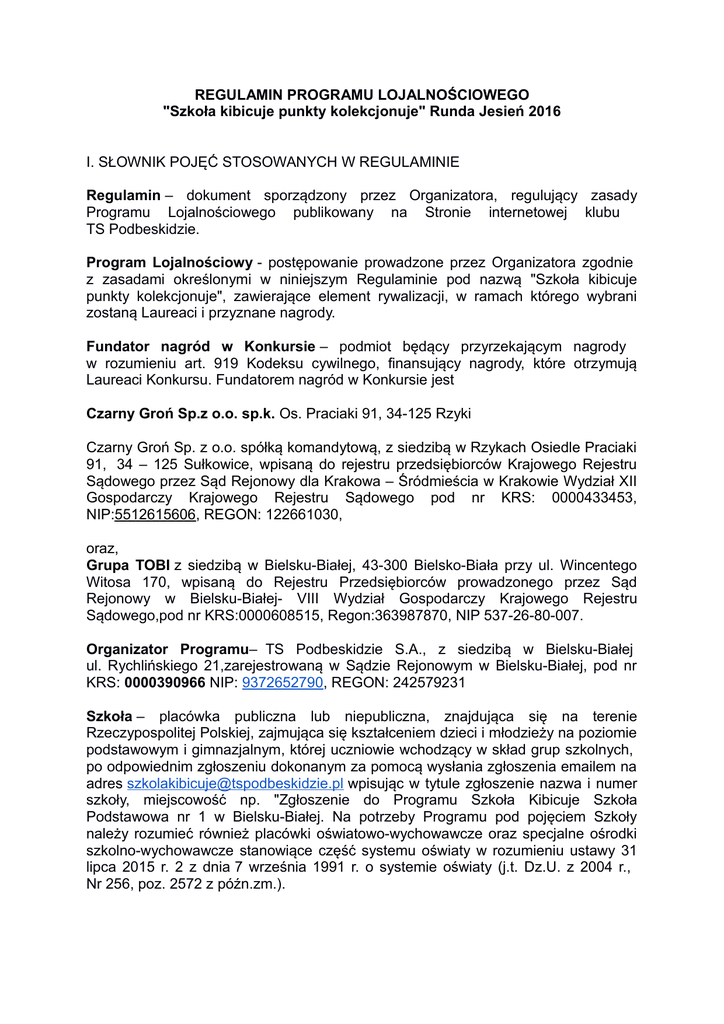 REGULAMIN PROGRAMU LOJALNOŚCIOWEGO "Szkoła kibicuje punkty kolekcjonuje" Runda Jesień 2016 I. SŁOWNIK POJĘĆ STOSOWANYCH W REGULAMINIE Regulamin – dokument sporządzony przez Organizatora, regulujący zasady Programu Lojalnościowego publikowany na Stronie internetowej klubu TS Podbeskidzie. Program Lojalnościowy - postępowanie prowadzone przez Organizatora zgodnie z zasadami określonymi w niniejszym Regulaminie pod nazwą "Szkoła kibicuje punkty kolekcjonuje", zawierające element rywalizacji, w ramach którego wybrani zostaną Laureaci i przyznane nagrody. Fundator nagród w Konkursie – podmiot będący przyrzekającym nagrody w rozumieniu art. 919 Kodeksu cywilnego, finansujący nagrody, które otrzymują Laureaci Konkursu. Fundatorem nagród w Konkursie jest Czarny Groń Sp.z o.o. sp.k. Os. Praciaki 91, 34-125 Rzyki Czarny Groń Sp. z o.o. spółką komandytową, z siedzibą w Rzykach Osiedle Praciaki 91, 34 – 125 Sułkowice, wpisaną do rejestru przedsiębiorców Krajowego Rejestru Sądowego przez Sąd Rejonowy dla Krakowa – Śródmieścia w Krakowie Wydział XII Gospodarczy Krajowego Rejestru Sądowego pod nr KRS: 0000433453, NIP:5512615606, REGON: 122661030, oraz, Grupa TOBI z siedzibą w Bielsku-Białej, 43-300 Bielsko-Biała przy ul. Wincentego Witosa 170, wpisaną do Rejestru Przedsiębiorców prowadzonego przez Sąd Rejonowy w Bielsku-Białej- VIII Wydział Gospodarczy Krajowego Rejestru Sądowego,pod nr KRS:0000608515, Regon:363987870, NIP 537-26-80-007. Organizator Programu– TS Podbeskidzie S.A., z siedzibą w Bielsku-Białej ul. Rychlińskiego 21,zarejestrowaną w Sądzie Rejonowym w Bielsku-Białej, pod nr KRS: 0000390966 NIP: 9372652790, REGON: 242579231 Szkoła – placówka publiczna lub niepubliczna, znajdująca się na terenie Rzeczypospolitej Polskiej, zajmująca się kształceniem dzieci i młodzieży na poziomie podstawowym i gimnazjalnym, której uczniowie wchodzący w skład grup szkolnych, po odpowiednim zgłoszeniu dokonanym za pomocą wysłania zgłoszenia emailem na adres [email protected] wpisując w tytule zgłoszenie nazwa i numer szkoły, miejscowość np. "Zgłoszenie do Programu Szkoła Kibicuje Szkoła Podstawowa nr 1 w Bielsku-Białej. Na potrzeby Programu pod pojęciem Szkoły należy rozumieć również placówki oświatowo-wychowawcze oraz specjalne ośrodki szkolno-wychowawcze stanowiące część systemu oświaty w rozumieniu ustawy 31 lipca 2015 r. 2 z dnia 7 września 1991 r. o systemie oświaty (j.t. Dz.U. z 2004 r., Nr 256, poz. 2572 z późn.zm.). Uczestnik Programu – Szkoła, która za pośrednictwem Opiekuna grupy szkolnej, dokonała w terminach wynikających z niniejszego Regulaminu zgłoszenia co najmniej jednej grupy szkolnej w Programie. Opiekun Uczestników Programu – Dyrektor Szkoły lub pedagog/nauczyciel sprawujący z upoważnienia Szkoły opiekę nad grupą szkolną, odpowiedzialny za zgłoszenie grupy, odbiór biletów oraz kontakt z Organizatorem. Laureat Programu – Szkoła, która ukończyła Program z największą ilością punktów na koncie i której Przedstawiciel zamienił uzyskane punkty na dostępne nagrody. Moderator Strony internetowej Programu – osoba wyznaczona przez Organizatora Programu posiadająca dostęp do narzędzi technicznych dających możliwość kontroli treści znajdującej się na stronie internetowej www.tspbodbeskidzie.pl oraz możliwość zarządzania panelem Programu Lojalnościowego. Publikowani na stronie internetowej klubu punktacji oraz prowadzenie rankingu szkół. II. ZASADY OGÓLNE KONKURSU 1. Konkurs rozpoczyna się dnia 12.09.2016 r., a kończy dnia 30.11.2016 r., obejmuje mecze od 9 do 19 kolejki rozgrywane na Stadionie Miejskim w Bielsku-Białej. 2. Celem Programu jest propagowanie wiedzy o Klubie TS Podbeskidzie wśród dzieci i młodzieży oraz promowanie wśród uczniów pozytywnych postaw w zakresie kulturalnego dopingu na meczach piłki nożnej, a także propagowanie oglądania meczów na żywo jako jedna z alternatywnych form rozrywki. 3. Sposób przyznawania punktów 1) Punkty za frekwencje na meczach Punktowane będą bilety dzieci do 18 roku życia, zakupione na dany mecz dla danej grupy, które przeliczane są według następującego wzoru. Bilety dorosłych opiekunów nie są przeliczane na punkty. Liczba biletów x 1 pkt = liczba punktów, np Szkoła Podstawowa nr 2 , która zamówiła 80 biletów dla uczniów, otrzyma na konto w Programie 80 punktów. Przeliczane na punkty są tylko bilety dzieci nieletnich. Punkty publikowane będą w rankingu na stronie www.tspodbeskidzie.pl do 5 dni roboczych po meczu. 4. Cennik biletów Bilet dziecko – 1 zł przysługuje dzieciom i opiekunom grupy (dla 3 opiekunów na grupę 10 nieletnich, w cenie 1 zł). Bilet szkolny – 5 zł przysługuje pozostałym opiekunom/rodzicom/osobom towarzyszącym grupie szkolnej. 5. Nagrody: Wyłonione zostaną 3 szkoły w 3 kategoriach Kategoria I - Szkoła do 200 uczniów Kategoria II - Szkoła od 201 do 300 Kategoria III - Szkoła od 301 6. Przed zarejestrowaniem zarówno Szkoła jak i Użytkownicy mają możliwość zapoznania się z treścią niniejszego Regulaminu oraz zaakceptowania jego treści lub rezygnacji. Dalsze uczestnictwo w Programie jest zależne od zaakceptowania treści niniejszego Regulaminu. Uczestnictwo w Programie jest całkowicie dobrowolne. Szkoła może w każdym czasie zrezygnować z Programu bez podawania powodu rezygnacji, powiadamiając Organizatora na piśmie o swojej decyzji na adres emailowy, przesyłając rezygnację za pośrednictwem poczty elektronicznej, z adresu podanego podczas rejestracji, na adres [email protected]. III. OGÓLNE ZASADY UCZESTNICTWA W KONKURSIE 1. Warunkiem udziału Szkoły w Programie jest zebranie grupy zorganizowanej (min 15 osób) i wysłanie zgłoszenia udziału w Programie "Szkoła kibicuje, punkty kolekcjonuje". Zgłoszenie chęci wzięcia udziału w Programie jest jednorazowe. W zgłoszeniu należy podać, w jakiej 