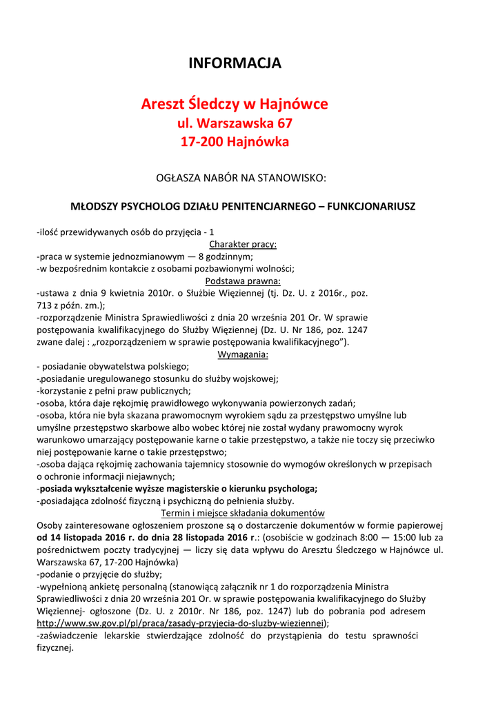 INFORMACJA Areszt Śledczy w Hajnówce ul. Warszawska 67 17-200 Hajnówka OGŁASZA NABÓR NA STANOWISKO: MŁODSZY PSYCHOLOG DZIAŁU PENITENCJARNEGO – FUNKCJONARIUSZ -ilość przewidywanych osób do przyjęcia - 1 Charakter pracy: -praca w systemie jednozmianowym — 8 godzinnym; -w bezpośrednim kontakcie z osobami pozbawionymi wolności; Podstawa prawna: -ustawa z dnia 9 kwietnia 2010r. o Służbie Więziennej (tj. Dz. U. z 2016r., poz. 713 z późn. zm.); -rozporządzenie Ministra Sprawiedliwości z dnia 20 września 201 Or. W sprawie postępowania kwalifikacyjnego do Służby Więziennej (Dz. U. Nr 186, poz. 1247 zwane dalej : „rozporządzeniem w sprawie postępowania kwalifikacyjnego”). Wymagania: - posiadanie obywatelstwa polskiego; - posiadanie uregulowanego stosunku do służby wojskowej; -korzystanie z pełni praw publicznych; -osoba, która daje rękojmię prawidłowego wykonywania powierzonych zadań; -osoba, która nie była skazana prawomocnym wyrokiem sądu za przestępstwo umyślne lub umyślne przestępstwo skarbowe albo wobec której nie został wydany prawomocny wyrok warunkowo umarzający postępowanie karne o takie przestępstwo, a także nie toczy się przeciwko niej postępowanie karne o takie przestępstwo; - osoba dająca rękojmię zachowania tajemnicy stosownie do wymogów określonych w przepisach o ochronie informacji niejawnych; -posiada wykształcenie wyższe magisterskie o kierunku psychologa; - posiadająca zdolność fizyczną i psychiczną do pełnienia służby. Termin i miejsce składania dokumentów Osoby zainteresowane ogłoszeniem proszone są o dostarczenie dokumentów w formie papierowej od 14 listopada 2016 r. do dnia 28 listopada 2016 r.: (osobiście w godzinach 8:00 — 15:00 lub za pośrednictwem poczty tradycyjnej — liczy się data wpływu do Aresztu Śledczego w Hajnówce ul. Warszawska 67, 17-200 Hajnówka) -podanie o przyjęcie do służby; -wypełnioną ankietę personalną (stanowiącą załącznik nr 1 do rozporządzenia Ministra Sprawiedliwości z dnia 20 września 201 Or. w sprawie postępowania kwalifikacyjnego do Służby Więziennej- ogłoszone (Dz. U. z 2010r. Nr 186, poz. 1247) lub do pobrania pod adresem http://www.sw.gov.pl/pl/praca/zasady-przyjecia-do-sluzby-wieziennei); -zaświadczenie lekarskie stwierdzające zdolność do przystąpienia do testu sprawności fizycznej. W przypadku podjęcia przez kierownika jednostki decyzji o wszczęciu postępowania kwalifikacyjnego, kandydat zobowiązany jest do dostarczenia w wyznaczonym terminie pozostałych dokumentów: -kserokopie świadectw pracy lub służby; -kserokopie dokumentów potwierdzających posiadane wykształcenie ogólne, kwalifikacje zawodowe i specjalistyczne; -kserokopie odpisów skróconych aktu urodzenia; własnego, małżonka , dzieci oraz odpis aktu małżeństwa; -1 fotografię; -kserokopie książeczki wojskowej; -kserokopie dowodu osobistego; (wymienione wyżej dokumenty należy przedstawić w oryginale do wglądu). Miejsce uzyskania szczegółowych informacji odnośnie postępowania kwalifikacyjnego: Areszt Śledczy w Hajnówce, ul. Warszawska 67, 17-200 Hajnówka, od poniedziałku do piątku w godz. 12.00- 15.00 lub telefonicznie: 085- 683-20-07 w. 125 Postępowanie kwalifikacyjne składa się z następujących etapów: 1) oceny złożonych dokumentów; 2) przeprowadzenie jednej lub kilku rozmów kwalifikacyjnych; 3) uzyskanie informacji o kandydacie w rejestrach skazanych i ukaranych, 4) testu sprawności fizycznej; 5) ustalenie zdolności fizycznej i psychicznej do służby w Służbie Więziennej; 6) sporządzenie arkusza predyspozycji kandydata; 7) zatwierdzenie listy kandydatów przez kierownika jednostki organizacyjnej. Dyrektor Aresztu Śledczego w Hajnówce podejmie decyzję o wszczęciu postępowania lub jego odmowie po dokonaniu oceny złożonych dokumentów. Kandydaci zakwalifikowani do kolejnego etapu postępowania kwalifikacyjnego zostaną powiadomieni drogą telefoniczną lub listowną. Dyrektor Aresztu Śledczego w Hajnówce przerywa postępowanie w przypadku: 1) niezłożenia dokumentów w wyznaczonym terminie lub nieusunięcia braków w wyznaczonym dodatkowo terminie; 2) niepoddania się przez kandydata czynnościom lub badaniom przewidzianym w postępowaniu kwalifikacyjnym; 3) niespełnienia wymagań określonych w art. 38 ustawy z dnia 9 kwietnia 2010r. o Służbie Więziennej; 4) negatywnego wyniku choćby jednego z etapów postępowania kwalifikacyjnego; 5) gdy nie znajduje to uzasadnienia w potrzebach kadrowych Służby Więziennej. Inne informacje: Pozytywne zakończenie procedury postępowania kwalifikacyjnego nie gwarantuje przyjęcia do służby w Areszcie Śledczym w Hajnówce.