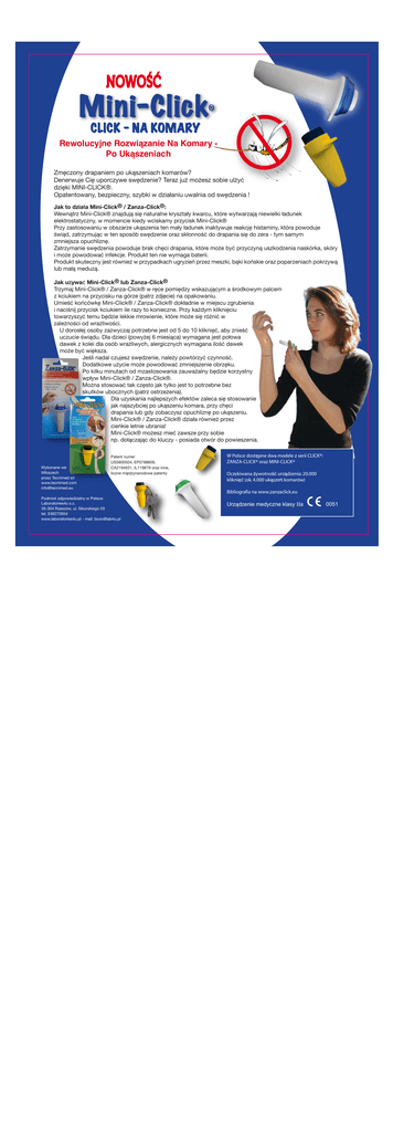 Rewolucyjne Rozwiązanie Na Komary Po Ukąszeniach Zmęczony drapaniem po ukąszeniach komarów? Denerwuje Cię uporczywe swędzenie? Teraz już możesz sobie ulżyć dzięki MINI-CLICK®. Opatentowany, bezpieczny, szybki w działaniu uwalnia od swędzenia ! Jak to działa Mini-Click® / Zanza-Click®: Wewnątrz Mini-Click® znajdują się naturalne kryształy kwarcu, które wytwarzają niewielki ładunek elektrostatyczny, w momencie kiedy wciskamy przycisk Mini-Click® Przy zastosowaniu w obszarze ukąszenia ten mały ładunek inaktywuje reakcję histaminy, która powoduje świąd, zatrzymując w ten sposób swędzenie oraz skłonność do drapania się do zera - tym samym zmniejsza opuchliznę. Zatrzymanie swędzenia powoduje brak chęci drapania, które może być przyczyną uszkodzenia naskórka, skóry i może powodować infekcje. Produkt ten nie wymaga baterii. Produkt skuteczny jest również w przypadkach ugryzień przez meszki, bąki końskie oraz poparzeniach pokrzywą lub małą meduzą. Jak używać Mini-Click® lub Zanza-Click® Trzymaj Mini-Click® / Zanza-Click® w ręce pomiędzy wskazującym a środkowym palcem z kciukiem na przycisku na górze (patrz zdjęcie) na opakowaniu. Umieść końcówkę Mini-Click® / Zanza-Click® dokładnie w miejscu zgrubienia i naciśnij przycisk kciukiem ile razy to konieczne. Przy każdym kliknięciu towarzyszyć temu będzie lekkie mrowienie, które może się różnić w zależności od wrażliwości. U dorosłej osoby zazwyczaj potrzebne jest od 5 do 10 kliknięć, aby znieść uczucie świądu. Dla dzieci (powyżej 6 miesiąca) wymagana jest połowa dawek z kolei dla osób wrażliwych, alergicznych wymagana ilość dawek może być większa. Jeśli nadal czujesz swędzenie, należy powtórzyć czynność. Dodatkowe użycie może powodować zmniejszenie obrzęku. Po kilku minutach od mzastosowania zauważalny będzie korzystny wpływ Mini-Click® / Zanza-Click®. Można stosować tak często jak tylko jest to potrzebne bez skutków ubocznych (patrz ostrzeżenia). Dla uzyskania najlepszych efektów zaleca się stosowanie jak najszybciej po ukąszeniu komara, przy chęci drapania lub gdy zobaczysz opuchliznę po ukąszeniu. Mini-Click® / Zanza-Click® działa również przez cieńkie letnie ubrania! Mini-Click® możesz mieć zawsze przy sobie np. dołączając do kluczy - posiada otwór do powieszenia. Wykonane we Włoszech przez Tecnimed srl www.tecnimed.com [email protected] Patent numer US5800504, EP0788809, CA2194631, IL119879 oraz inne, liczne międzynarodowe patenty Podmiot odpowiedzialny w Polsce: Laboratories4u s.c. 35-304 Rzeszów, ul. Sikorskiego 29 tel. 536272654 www.laboratories4u.pl - mail: [email protected] W Polsce dostępne dwa modele z serii CLICK®: ZANZA-CLICK® oraz MINI-CLICK® Oczekiwana żywotność urządzenia: 20.000 kliknięć (ok. 4.000 ukąszeń komarów) Bibliografia na www.zanzaclick.eu Urządzenie medyczne klasy IIa 0051