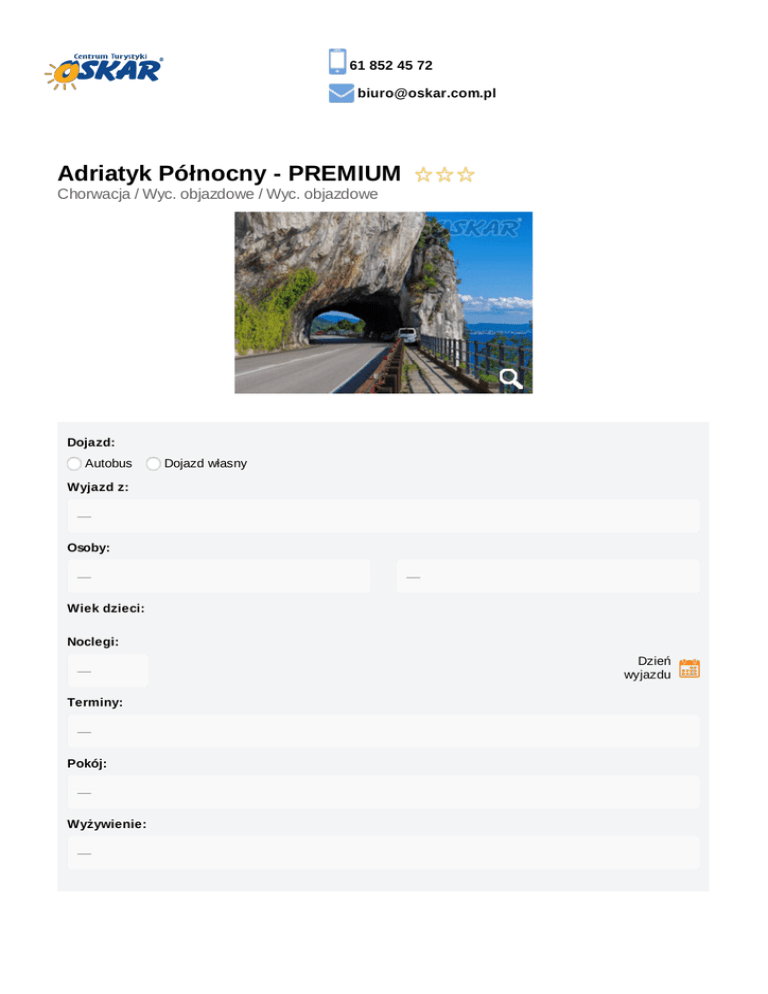 61 852 45 72 [email protected] Adriatyk Północny - PREMIUM Chorwacja / Wyc. objazdowe / Wyc. objazdowe Dojazd: Autobus Dojazd własny Wyjazd z: Osoby: Wiek dzieci: Noclegi: Dzień wyjazdu Terminy: Pokój: Wyżywienie: Najtańsza oferta First Minute cena katalogowa do 6 marca 2017: 959,40 zł do 6 marca 2017: 959,40 zł do 31 sierpnia 2017: 2238,60 zł do 31 sierpnia 2017: 2238,60 zł Suma:3198,00 Suma: zł 3198,00 zł Opis oferty Miejscowość Przejazd autokarem PREMIUM autokar-premium-oskar-tablet-gniazdko-usb-wygodne-fotele Opinie Realizacja imprezy autokarami PREMIUM to gwarancja: transportu autokarami z roczników 2015 i 2016 produkcji Irizar i VDL Rozkład jazdy indywidualnego, multimedialnego systemu rozrywki - tablet z dotykowym ekranem w każdym zagłówku (filmy, gry, muzyka itp.). Możliwość podłączenia własnego nośnika danych poprzez wejście AUX lub USB. najwyższej klasy skórzanych lub półskórzanych foteli z możliwością regulacji oparcia lub/i zagłówka największej w Polsce przestrzeni między siedzeniami małej półki przed każdym siedzeniem + siateczki na czasopisma, książki czy telefon bezpłatnego dostępu do sieci WiFi na terenie Polski* gniazdek elektrycznych 230V wydajnej klimatyzacji sterowanej indywidualnie bogato wyposażonego barku udostępnionego w czasie jazdy WC na pokładzie autokaru Idealna i komfortowa podróż… ZAWSZE! Na ternie Polski GWARANTUJEMY, że wszystkie przejazdy realizowane są autobusem, busem lub samochodem osobowym. Zapewnimy komfortowy transport na każdym etapie podróży. Ważne: Autokar Premium jest autokarem docelowym. *jakość usług internetowych może różnić się w zależności od jakości sygnału TOUR GUIDE oprowadzanie z indywidualnym systemem nagłośnieniowym Mobilny zestaw audio: indywidulany zestaw słuchawkowy połączony bezprzewodowo z mikrofonem pilota/przewodnika. Zakwaterowanie Hotele ***/****. Wszystkie pokoje wyposażone są w łazienkę, natomiast w części hoteli również telewizja oraz dostęp do Internetu Wi-Fi. Większość pokoi posiada balkon. Niektóre hotele posiadają basen. Przykładowe zakwaterowanie, które może różnić się w poszczególnych terminach: Domzale (1) – Ambient Hotel, Koper (1) – Hotel Koper, Duga Uvala (2) - Hotel Croatia, Karlovac (1) – Hotel Europa, Podcetrtek (1) - Terme Olimia Hotel Breza Dostępne opcje zakwaterowania: pokój 2 - osobowy pokój 3 - osobowy dokwaterowanie (bez dopłat*) lub pokój 1 - osobowy (dopłata) Dostępne opcje wyżywienia wyżywienie BB: 6 śniadań wyżywienie HB: 6 śniadań + 6 obiadokolacji; możliwość dokonania rezerwacji w wersji HB lub + opcjonalna dopłata do obiadokolacji 50 €/os. (płatne u pilota w autokarze) śniadania kontynentalne: pieczywo, dżem, masło, kawa, herbata lub bufet: pieczywo, ser, szynka, jajka lub parówki itp., napoje: kawa, herbata, sok obiadokolacje serwowane: zupa, danie główne, sałatka, deser, owoc; napoje do obiadokolacji dodatkowo płatne Pakiet KOMFORT gwarancja wyboru miejsca w autokarze napoje w autokarze w cenie (6 x do wyboru: kawa, herbata, zimny napój 0,2l) cena: 50 zł/os Pakiet PRESTIGE gwarancja wyboru miejsca w autokarze napoje w autokarze w cenie (6 x do wyboru: kawa, herbata, zimny napój 0,2l) pierwszeństwo wejścia na pokład autokaru nadbagaż 5 kg w cenie napoje do obiadokolacji (0,2l) cena: 100 zł/os Karta Dużej Rodziny www.oskar.com.pl/zalaczniki/karta_duzej_rodziny Warunki promocji FIRST MINUTE www.oskar.com.pl/zalaczniki/warunki_promocji Ubezpieczenie Warunki ubezpieczenia Bezpieczne Podróże Signal Iduna dokument do pobrania www.oskar.com.pl/zalaczniki/owu Warunki ubezpieczenia Kosztów Imprezy Turystycznej Signal Iduna dokument do pobrania www.oskar.com.pl/zalaczniki/owurg Turystyczny Fundusz Gwarancyjny W związku z powołaniem do życia w dniu 26.11.2016 Turystycznego Funduszu Gwarancyjnego każdy klient Biura Podróży Oskar zobowiązany jest do zapłaty kwoty w wysokości 10zł/os. przy każdorazowej rezerwacji imprezy turystycznej (obowiązuje od dnia 26.11.2016). Kwota przeznaczona na Turystyczny Fundusz Gwarancyjny zostanie automatycznie doliczona do wartości rezerwacji (w momencie jej dokonania). Wyjątkiem są imprezy turystyczne odbywające się w krajach posiadających granicę z Rzeczpospolitą Polską. Składka nie jest przychodem biura. Udogodnienia Klimatyzacja Regulowane fotele Tacki Multimedia Nowoczesna flota Zawodowy kierowca Pasy bezpieczeństwa Toaleta w autokarze Podnóżki Wi-Fi Bez paszportu Premium Elite Tour guide Program ramowy DZIEŃ 1 (sobota) Wyjazd z Polski zgodnie z rozkładem jazdy autokarów. Przejazd przez Czechy, Austrię i Słowenię. (Trasa ok. 690 km) DZIEŃ 2 (niedziela) Przyjazd do Słowenii. Bled to niewątpliwie jedna z tutejszych atrakcji - spokojne jezioro z jedyną wyspą w kraju, na której znajduje się kościółek Wniebowzięcia NMP, a nad wszystkim, na szarej skale, góruje zamek, z dziedzińców którego roztacza się widok na majestatyczne Alpy i najwyższy szczyt Triglav. Miejscowość była znana jako rezydencja królów Jugosławii, a także miejsce, w którym dyktator J.B. Tito przyjmował zagranicznych gości. Wąwóz Vintgar - 2-kilometrowy parów, wyrzeźbiony przez wody rzeki Radovny. Przepiękne miejsce, które nie było znane aż do końca XIX wieku, kiedy to zostało odkryte. Został tutaj zbudowany system kładek, dzięki któremu można przejść nad załomami, wirami oraz bulgoczącą wodą i dotrzeć do 16-metrowego wodospadu Szum. W programie zwiedzanie średniowiecznego miasteczka Skofja Loka (pol. "Biskupia Łąka"), które zostało przebudowane w duchu wczesnobarokowym, po tym, jak miało tutaj miejsce trzęsienie ziemi. Główną atrakcją tego miejsca jest festiwal rycerski (bezpłatny), odbywający się pod koniec czerwca. Przejazd do hotelu. Obiadokolacja. Nocleg. (Trasa ok. 115 km) DZIEŃ 3 (poniedziałek) Śniadanie. Ljubljana czyli stolica Słowenii, która uchodzi za najbardzi