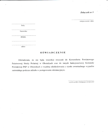 Załączltik ltr 5 n]iejsco\\,ośći data PESEL OŚWI ADCZENlE powiatowego oświadczanr, że nie będę wnosił(a) roszczeń do komerrdanta państwowej straży pożamej w obomikaclr oraz do irlnych funkcjonariuszy komendy powiatowej psp w obomikach o w}płatę odszkodowania z tl,tułu ewentualr-rego wypadku zaish-riałego podczas udziału w postępowaniu rekrutacyjnym. !l),1ttlty po(lpis \kllldtlitle.go oś\,iild.l§ric