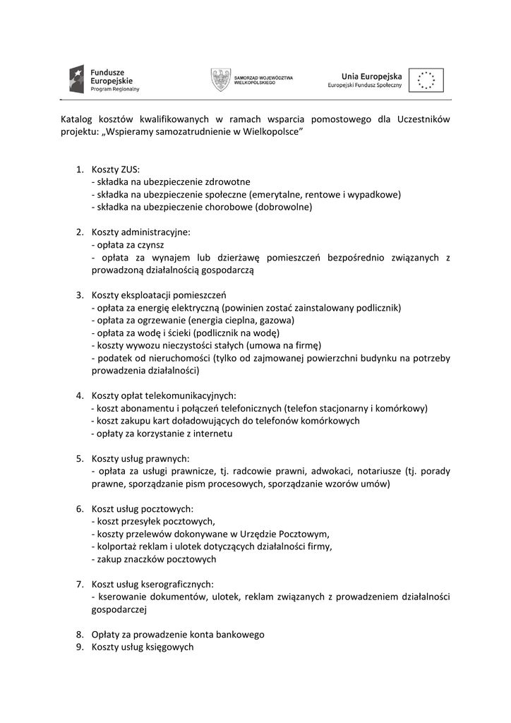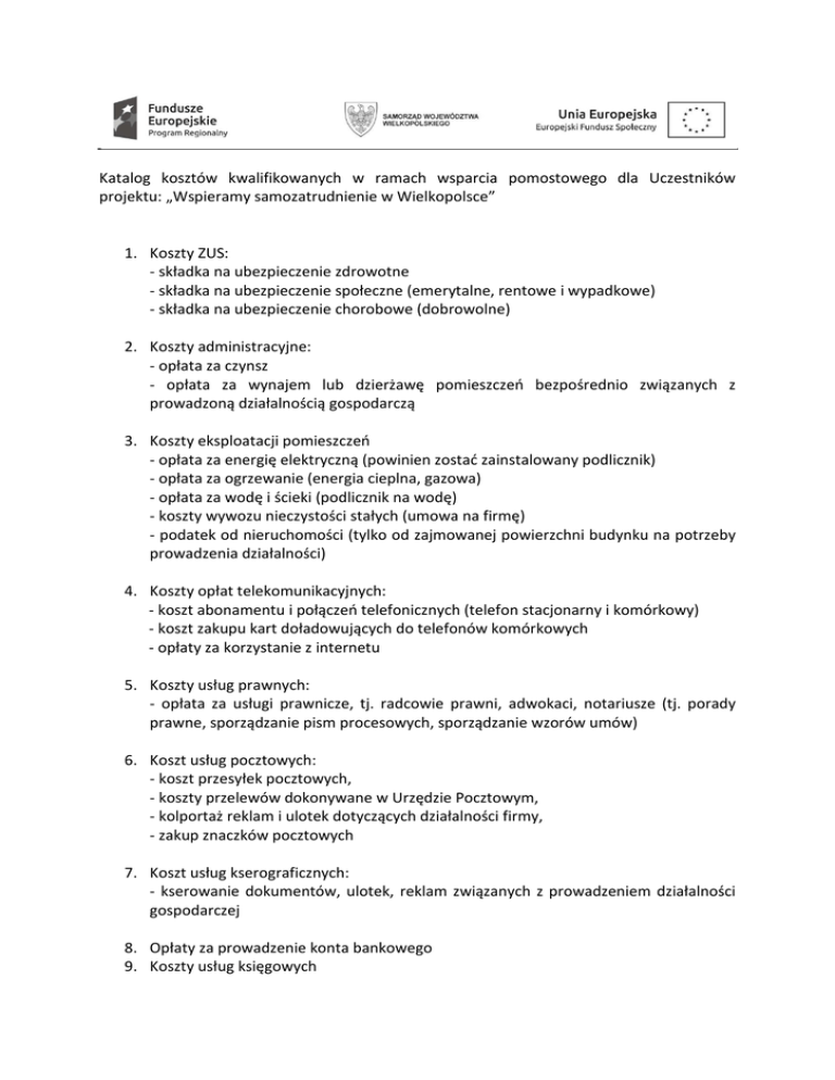 Katalog kosztów kwalifikowanych w ramach wsparcia pomostowego dla Uczestników projektu: „Wspieramy samozatrudnienie w Wielkopolsce” 1. Koszty ZUS: - składka na ubezpieczenie zdrowotne - składka na ubezpieczenie społeczne (emerytalne, rentowe i wypadkowe) - składka na ubezpieczenie chorobowe (dobrowolne) 2. Koszty administracyjne: - opłata za czynsz - opłata za wynajem lub dzierżawę pomieszczeń bezpośrednio związanych z prowadzoną działalnością gospodarczą 3. Koszty eksploatacji pomieszczeń - opłata za energię elektryczną (powinien zostać zainstalowany podlicznik) - opłata za ogrzewanie (energia cieplna, gazowa) - opłata za wodę i ścieki (podlicznik na wodę) - koszty wywozu nieczystości stałych (umowa na firmę) - podatek od nieruchomości (tylko od zajmowanej powierzchni budynku na potrzeby prowadzenia działalności) 4. Koszty opłat telekomunikacyjnych: - koszt abonamentu i połączeń telefonicznych (telefon stacjonarny i komórkowy) - koszt zakupu kart doładowujących do telefonów komórkowych - opłaty za korzystanie z internetu 5. Koszty usług prawnych: - opłata za usługi prawnicze, tj. radcowie prawni, adwokaci, notariusze (tj. porady prawne, sporządzanie pism procesowych, sporządzanie wzorów umów) 6. Koszt usług pocztowych: - koszt przesyłek pocztowych, - koszty przelewów dokonywane w Urzędzie Pocztowym, - kolportaż reklam i ulotek dotyczących działalności firmy, - zakup znaczków pocztowych 7. Koszt usług kserograficznych: - kserowanie dokumentów, ulotek, reklam związanych z prowadzeniem działalności gospodarczej 8. Opłaty za prowadzenie konta bankowego 9. Koszty usług księgowych - zlecenie obsługi księgowej firmy 10. Koszty drobnych materiałów biurowych niezbędnych do prowadzenia działalności gospodarczej np. druki akcydensowe (tj. druki, rachunków, faktur, umów), segregatory, zszywacz, dziurkacz, nożyczki, korektor, klej, papier ksero, papier kolorowy do wykonania reklam i ulotek, koperty, tusze, tonery, długopisy, zeszyty, notesy, , spinacze, zszywki, flamastry itp. 11. Koszty związane z ubezpieczeniem osób i/lub mienia związane bezpośrednio z prowadzoną działalnością gospodarczą: 1) Przedmiotem ubezpieczenia może być mienie: - będące własnością przedsiębiorcy i znajdujące się w jego posiadaniu na podstawie tytułu prawnego - nie będące własnością przedsiębiorcy lecz znajdujące się w jego posiadaniu na podstawie tytułu prawnego: a) użytkowane przez przedsiębiorcę do prowadzenia działalności gospodarczej b) przejęte przez przedsiębiorcę do sprzedaży lub w celu wykonania usługi. 2) Odpowiedzialność cywilna w związku z prowadzoną działalnością lub posiadanym mieniem 3) Określone koszty ponoszone przez przedsiębiorcę , w związku z zajściem zdarzenia objętego ubezpieczeniem 4) Ubezpieczenie przedsiębiorcy od następstw i nieszczęśliwych wypadków Wsparcie pomostowe może być przeznaczone wyłącznie na pokrycie związanych z prowadzeniem działalności gospodarczej (w pierwszej kolejności pokrywane są płatności obowiązkowe, czyli m.in. składki na ubezpieczenie społeczne, ubezpieczenie zdrowotne oraz fundusze pozaubezpieczeniowe, czynsz, opłaty za media. Pozostałe środki można przeznaczyć na np. usługi księgowe, usługi pocztowe, usługi prawne, usługi promocyjne i inne niezbędne do prowadzenia działalności gospodarczej w danej branży). Środki pieniężne otrzymywane w ramach wsparcia pomostowego nie mogą być przeznaczone na zakup: środków trwałych, materiałów do produkcji, materiałów z przeznaczeniem na sprzedaż.