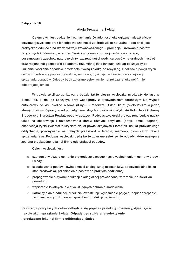 Załącznik 18 Akcja Sprzątanie Świata Celem akcji jest budzenie i wzmacnianie świadomości ekologicznej mieszkańców powiatu łęczyckiego oraz ich odpowiedzialności za środowisko naturalne. Ideą akcji jest praktyczna edukacja na rzecz rozwoju zrównoważonego – promocja i kreowanie postaw przyjaznych środowisku, w szczególności w zakresie: rozwoju zrównoważonego, poszanowania zasobów naturalnych (w szczególności wody, surowców naturalnych i lasów) oraz racjonalnej gospodarki odpadami, rozumianej jako łańcuch działań począwszy od unikania tworzenia odpadów, przez selektywną zbiórkę po recykling. Realizacja powyższych celów odbędzie się poprzez prelekcję, rozmowy, dyskusje w trakcie dorocznej akcji sprzątania odpadów. Odpady będą zbierane selektywnie i przekazane lokalnej firmie odbierającej śmieci W trakcie akcji zorganizowana będzie także piesza wycieczka młodzieży do lasu w Błoniu (ok. 3 km. od Łęczycy), przy współpracy z przewodnikiem terenowym lub wyjazd autokarowy do lasu okolice Witowa k/Piątku – rezerwat „Silne Błota” (około 25 km w jedną stronę, przy współpracy szkół ponadgimnazjalnych z osobami z Wydziału Rolnictwa i Ochrony Środowiska Starostwa Powiatowego w Łęczycy. Podczas wycieczki prowadzony będzie nacisk także na obserwacje i rozpoznawanie drzew różnymi zmysłami (dotyk, smak, zapach), obserwacja życia zwierząt z użyciem szkieł powiększających i lornetek, nauka prawidłowego oddychania, pokonywanie naturalnych przeszkód w terenie, rozmowy, dyskusje w trakcie sprzątania lasu. Podczas wycieczki będą także zbierane selektywnie odpady, które następnie zostaną przekazane lokalnej firmie odbierającej odpadów Celem wycieczki jest: • szerzenie wiedzy o ochronie przyrody ze szczególnym uwzględnieniem ochrony drzew i wody, • kształtowanie postaw i świadomości ekologicznej uczestników, odpowiedzialności za stan środowiska, przeniesienie postaw na praktykę codzienną, • propagowanie aktywnej edukacji ekologicznej prowadzonej w terenie, na świeżym powietrzu, • wspieranie lokalnych inicjatyw służących ochronie środowiska. • uatrakcyjnianie edukacji przez ciekawostki np. wyjaśnienie pojęcia "papier czerpany", zapoznanie się z domowym sposobem produkcji papieru itp. Realizacja powyższych celów odbędzie się poprzez prelekcję, rozmowy, dyskusje w trakcie akcji sprzątania świata. Odpady będą zbierane selektywnie i przekazane lokalnej firmie odbierającej śmieci. KARTA WYCIECZKI/IMPREZY Cele i założenia programowe wycieczki …..zebranie śmieci, podwyższenie świadomości ekologicznej uczestników akcji, zapoznanie się ze środowiskiem naturalnym Trasa wycieczki /imprezy punkt spotkania uczestników wycieczki – ul. Szkolna, przy budynku Zespołu Szkół im. Jadwigi Grodzkiej w Łęczycy. Przemarsz ulicami: Szkolną, Dominikańską, Popiełuszki do lasku w Błoniu i z powrotrem ……………………………………………………………………………………………………………………… ……... Termin……………14 września 2012……………..ilość dni………1…………klasa…………uczniowie szkół ponadgimnazjalnych wraz z opiekunami. Liczba uczestników……………do 30 osób ……………………………………………………………………………….…….…. Kierownik (imię i nazwisko)………Maciej Pabin …………………………………………………………………………..………... Liczba opiekunów……1 opiekun na 10 uczniów …………………………………………………………………………………………..……... Środek lokomocji…………………wycieczka piesza ………………………………………………………………………………..……. OŚWIADCZENIE Zobowiązuję się do przestrzegania przepisów dotyczących zasad bezpieczeństwa na wycieczkach i imprezach dla dzieci i młodzieży. Opiekunowie wycieczki /imprezy Kierownik wycieczki / imprezy (imię i nazwisko oraz podpis) …………………………………. ………………………………... HARMONOGRAM WYCIECZKI / IMPREZY……………………………………………………………………………. Data godzina km Miejscowość Program…………………………………………….. ……………………………. Adres punktu noclegowego i żywieniowego……………………………………………………………….. ……. Zatwierdzam ………………………….. ……………………………………. (pieczęć i podpis) (podłużna pieczątka szkoły) LISTA NR………….. uczestników zespołu wycieczkowego (kierownik, wychowawcy, uczestnicy) L.p. Nazwisko i imię Data urodzenia Nr dowodu osobistego legitymacji szkolnej 1. 2. 3. 4. 5. 6. 7. 8. 9. 10. 11. 12. 13. 14. 15. (…) …………………………………… Razem osób……….w tym płci………………………………………………... (kierownik zespołu wycieczkowego) męskiej……………………………………………………. ………………. żeńskiej……………………… Data………………………………. ……………………………… (dyrektor szkoły)