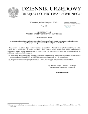 DZIENNIK URZĘDOWY URZĘDU LOTNICTWA CYWILNEGO Warszawa, dnia 6 listopada 2015 r. Elektronicznie podpisany przez: Anna Kajczuk; Urząd Lotnictwa Cywilnego Data: 2015-11-06 14:54:48 Poz. 62 KOMUNIKAT Nr 2 PREZESA URZĘDU LOTNICTWA CYWILNEGO z dnia 6 listopada 2015 r. w sprawie dokonania przez Rzeczypospolitą Polską notyfikacji w zakresie zastosowania odstępstw wynikających z rozporządzenia Komisji (UE) nr 2015/340 Na podstawie art. 23 ust. 2 pkt 5 ustawy z dnia 3 lipca 2002 r. – Prawo lotnicze (Dz. U. z 2013 r. poz. 1393, z późn. zm.1)) w związku z art. 12 ust. 2 ustawy z dnia 20 lipca 2000 r. o ogłaszaniu aktów normatywnych i niektórych innych aktów prawnych (Dz. U. z 2011 r. Nr 197, poz. 1172 i Nr 232, poz. 1378) podaje się do publicznej wiadomości informację o: 1) „Notyfikacji Rzeczypospolitej Polskiej w zakresie zastosowania planowanych odroczeń wynikających z rozporządzenia Komisji (UE) nr 2015/340”, stanowiącej załącznik nr 1 do komunikatu; 2) „Programie wdrażania rozporządzenia nr 2015/340”, stanowiącym załącznik nr 2 do komunikatu. wz. Prezesa Urzędu Lotnictwa Cywilnego Wiceprezes ds. Standardów Lotniczych Maciej Kozłowski 1) Zmiany tekstu jednolitego wymienionej ustawy zostały ogłoszone w Dz. U. z 2014 r. poz. 768 oraz z 2015 r. poz. 978, 1221 i 1586. Dziennik Urzędowy Urzędu Lotnictwa Cywilnego –2– Poz. 62 _______________________________________________________________________________________________________________ Załączniki do komunikatu Nr 2 Prezesa Urzędu Lotnictwa Cywilnego z dnia 6 listopada 2015 r. Załącznik 1 Notyfikacja Rzeczypospolitej Polskiej w zakresie zastosowania planowanych odroczeń wynikających z rozporządzenia Komisji (UE) nr 2015/340 Zgodnie z art. 11 ust. 2 rozporządzenia Komisji (UE) nr 2015/340 z dnia 20 lutego 2015 r. ustanawiającego wymagania techniczne i procedury administracyjne dotyczące licencji i certyfikatów kontrolerów ruchu lotniczego zgodnie z rozporządzeniem Parlamentu Europejskiego i Rady (WE) nr 216/2008, zmieniające rozporządzenie wykonawcze Komisji (UE) nr 923/2012 i uchylającego rozporządzenie Komisji (UE) nr 805/2011 (Dz. Urz. UE L 63 z 6.3.2015, str. 1), zwanego dalej „rozporządzeniem nr 2015/340”, Rzeczypospolita Polska pragnie zgłosić Komisji Europejskiej oraz Europejskiej Agencji Bezpieczeństwa Lotniczego (EASA) zamiar wykorzystania niżej wymienionych odstępstw, jednocześnie załączając do niniejszej notyfikacji program wdrażania nowych wymagań i ich harmonogram. Konieczność zastosowania wymienionych w notyfikacji odroczeń spowodowana jest potrzebą zapewnienia odpowiedniego czasu na dostosowanie się zarówno zewnętrznych podmiotów w postaci organizacji szkolących kontrolerów ruchu lotniczego, instytucji zapewniających służby żeglugi powietrznej i centrów medycyny lotniczej oraz lekarzy orzeczników, jak i nadzoru krajowego do nowych lub zmienionych wymagań w zakresie szkolenia, egzaminowania, licencjonowania, utrzymania kompetencji, badań lotniczo-lekarskich oraz certyfikacji organizacji szkolących kontrolerów ruchu lotniczego oraz centrów medycyny lotniczej i lekarzy orzeczników. I. Odstępstwa 1. Ogólne odroczenie stosowania wymagań zawartych w załącznikach I–IV do rozporządzenia nr 2015/340 w celu zapewnienia niezbędnego czasu ministrowi właściwemu do spraw transportu, Prezesowi Urzędu Lotnictwa Cywilnego, organizacjom szkolącym kontrolerów ruchu lotniczego, instytucjom zapewniającym służby żeglugi powietrznej, centrom medycyny lotniczej i lekarzom orzecznikom na przygotowanie się do spełnienia wymogów zawartych w ww. załącznikach. Zgodnie z art. 11 ust. 2 rozporządzenia nr 2015/340 przepisy zawarte w załącznikach I–IV nie będą stosowane przed dniem 31 grudnia 2016 r. Powody: 1.1. Umożliwienie ministrowi właściwemu do spraw transportu dokonania zmian w: − rozporządzeniu Ministra Transportu, Budownictwa i Gospodarki Morskiej z dnia 12 kwietnia 2013 r. w sprawie licencji i świadectw kwalifikacji personelu służb ruchu lotniczego (Dz. U. z 2013 r. poz. 471, z późn. zm.), − rozporządzeniu Ministra Transportu, Budownictwa i Gospodarki Morskiej z dnia 4 czerwca 2013 r. w sprawie badań lotniczo-lekarskich (Dz. U. z 2013 r. poz. 637, z późn. zm.), 1 Dziennik Urzędowy Urzędu Lotnictwa Cywilnego –3– Poz. 62 _______________________________________________________________________________________________________________ − − rozporządzeniu Ministra Transportu, Budownictwa i Gospodarki Morskiej z dnia 15 marca 2013 r. w sprawie wymagań w zakresie sprawności psychicznej i fizycznej osób ubiegających się o świadectwo kwalifikacji członka personelu lotniczego lub posiadających świadectwo kwalifikacji członka personelu lotniczego (Dz. U. z 2013 r. poz. 372, z późn. zm.), rozporządzeniu Ministra Transportu, Budownictwa i Gospodarki Morskiej z dnia 19 marca 2013 r. w sprawie wymagań w zakresie sprawności psychicznej i fizycznej kandydatów na członków personelu lotniczego oraz członków personelu lotniczego i kandydatów na członków personelu pokładowego oraz członków personelu pokładowego (Dz. U. z 2013 r. poz. 373, z późn. zm.) oraz uchylenia: − 1.2. 1.3. 1.4. 1.5. rozporządzenia Ministra Infrastruktury z dnia 18 lutego 2010 r. w sprawie wprowadzenia do stosowania Specyfikacji EUROCONTROL do szkolenia wstępnego kontrolerów ruchu lotniczego (Dz. U. z 2010 r. Nr 32, poz. 173), − rozporządzenia Ministra Transportu, Budownictwa i Gospodarki Morskiej z dnia 12 marca 2013 r. w sprawie wprowadzenia do stosowania Wymagań EUROCONTROL dotyczących europejskiego orzeczenia lekarskiego klasy 3 dla kontrolerów ruchu lotniczego (Dz. U. z 2013 r. poz. 371) w celu wyeliminowania podwójnej regulacji. Umożliwienie właściwemu organowi (Prezes Urzędu Lotnictwa Cywilnego) wprowadzenia niezbędnych zmian administracyjnych (w zakresie personelu, w procedurach i systemach informat