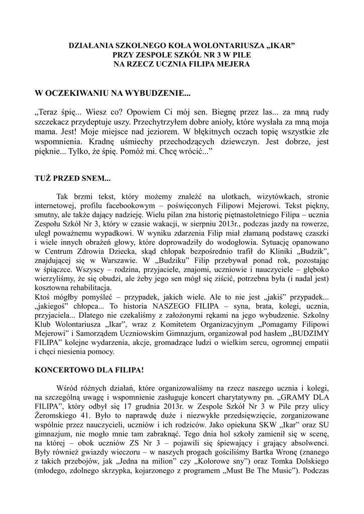 DZIAŁANIA SZKOLNEGO KOŁA WOLONTARIUSZA „IKAR” PRZY ZESPOLE SZKÓŁ NR 3 W PILE NA RZECZ UCZNIA FILIPA MEJERA W OCZEKIWANIU NA WYBUDZENIE... „Teraz śpię... Wiesz co? Opowiem Ci mój sen. Biegnę przez las... za mną rudy szczekacz przydeptuje uszy. Przechytrzyłem dobre anioły, które wysłała za mną moja mama. Jest! Moje miejsce nad jeziorem. W błękitnych oczach topię wszystkie złe wspomnienia. Kradnę uśmiechy przechodzących dziewczyn. Jest dobrze, jest pięknie... Tylko, że śpię. Pomóż mi. Chcę wrócić...” TUŻ PRZED SNEM... Tak brzmi tekst, który możemy znaleźć na ulotkach, wizytówkach, stronie internetowej, profilu facebookowym – poświęconych Filipowi Mejerowi. Tekst piękny, smutny, ale także dający nadzieję. Wielu pilan zna historię piętnastoletniego Filipa – ucznia Zespołu Szkół Nr 3, który w czasie wakacji, w sierpniu 2013r., podczas jazdy na rowerze, uległ poważnemu wypadkowi. W wyniku zdarzenia Filip miał złamaną podstawę czaszki i wiele innych obrażeń głowy, które doprowadziły do wodogłowia. Sytuację opanowano w Centrum Zdrowia Dziecka, skąd chłopak bezpośrednio trafił do Kliniki „Budzik”, znajdującej się w Warszawie. W „Budziku” Filip przebywał ponad rok, pozostając w śpiączce. Wszyscy – rodzina, przyjaciele, znajomi, uczniowie i nauczyciele – głęboko wierzyliśmy, że się obudzi, ale żeby jego sen mógł się ziścić, potrzebna była (i nadal jest) kosztowna rehabilitacja. Ktoś mógłby pomyśleć – przypadek, jakich wiele. Ale to nie jest „jakiś” przypadek... „jakiegoś” chłopca... To historia NASZEGO FILIPA – syna, brata, kolegi, ucznia, przyjaciela... Dlatego nie czekaliśmy z założonymi rękami na jego wybudzenie. Szkolny Klub Wolontariusza „Ikar”, wraz z Komitetem Organizacyjnym „Pomagamy Filipowi Mejerowi” i Samorządem Uczniowskim Gimnazjum, organizował pod hasłem „BUDZIMY FILIPA” kolejne wydarzenia, akcje, gromadzące ludzi o wielkim sercu, ogromnej empatii i chęci niesienia pomocy. KONCERTOWO DLA FILIPA! Wśród różnych działań, które organizowaliśmy na rzecz naszego ucznia i kolegi, na szczególną uwagę i wspomnienie zasługuje koncert charytatywny pn. „GRAMY DLA FILIPA”, który odbył się 17 grudnia 2013r. w Zespole Szkół Nr 3 w Pile przy ulicy Żeromskiego 41. Było to naprawdę duże i niezwykłe przedsięwzięcie, zorganizowane wspólnie przez nauczycieli, uczniów i ich rodziców. Jako opiekuna SKW „Ikar” oraz SU gimnazjum, nie mogło mnie tam zabraknąć. Tego dnia hol szkoły zamienił się w scenę, na której – obok uczniów ZS Nr 3 – pojawili się śpiewający i grający absolwenci. Były również gwiazdy wieczoru – w naszych progach gościliśmy Bartka Wronę (znanego z takich przebojów, jak „Jedna na milion” czy „Kolorowe sny”) oraz Tomka Dolskiego (młodego, zdolnego skrzypka, kojarzonego z programem „Must Be The Music”). Podczas koncertu miały miejsce: licytacje prac plastycznych i cennych przedmiotów ofiarowanych przez licznych darczyńców, loteria fantowa, sprzedaż ciast oraz inne atrakcje. Zarówno koncert, jak i towarzyszące mu działania, wymagały kilkutygodniowych przygotowań, podczas których nie zabrakło oczywiście naszego koła. Tego wieczoru wolontariusze z SKW „Ikar” byli niezastąpieni w rolach kelnerów, asystentów, opiekunów poszczególnych stanowisk. Niezwykle wzruszającym momentem było połączenie telefoniczne z Filipem i jego Mamą, znajdującymi się w Klinice „Budzik”, podczas którego głośno krzyczeliśmy: „Filip, czekamy na Ciebie!”. Niesamowita atmosfera podczas koncertu była zasługą zarówno artystów, jak i wspaniałej publiczności, która absolutnie dopisała tego wieczoru. Bawiąc się i chłonąc to, co dzieje się wokół, pamiętaliśmy, że robimy to dla Filipa i że w ten sposób kibicujemy Mu w trudnej drodze do powrotu do zdrowia. Podczas koncertu udało się zebrać dwadzieścia cztery tysiące złotych na rehabilitację chłopca. Nie byłoby to możliwe, gdyby nie życzliwi ludzie, zarówno darczyńcy, jak i wolontariusze, którzy bezwarunkowo angażują się we wszelkie działania i formy pomocy. Po raz kolejny ludzkie serca okazały się gorące i wypełnione dobrem i życzliwością. Z MYŚLAMI PRZY FILIPIE W PRZEDŚWIĄTECZNEJ ATMOSFERZE Na tydzień przed wspomnianym wyżej koncertem, 12 grudnia 2013r., odbył się w naszej szkole kiermasz ozdób świątecznych oraz prac wykonanych przez uczniów pilskich placówek oświatowych. Wraz z wolontariuszami z SKW „Ikar” od początku uczestniczyliśmy w tej akcji, nagłaśniając ją wśród rodziców i uczniów, gromadząc liczne przedmioty, „odświętnie” je pakując. Stawiliśmy się również silną grupą 12 grudnia, podczas spotkań z rodzicami, obsługując poszczególne kramiki. Ponadto w dniach 5-7 grudnia oraz 12-14 grudnia 2013r. wolontariusze ZS Nr 3 pakowali zakupy klientom sklepów „Intermarche” i „Lewiatan”, zbierając pieniądze do puszek kwestarskich z przeznaczeniem na pomoc dla Filipa. Warto wspomnieć, że przez cały rok szkolny 2013/2014 trwała zbiórka nakrętek i puszek na dalszą rehabilitację chłopca. DLA FILIPA – NA SPORTOWO! 10 kwietnia 2014r. w hali MOSiR przy ul. Żeromskiego w Pile miało miejsce kolejne wydarzenie wspierające akcję wybudzania Filipa Mejera. Tym razem zagraliśmy na sportowo – w piłkę siatkową. Podczas meczu charytatywnego, po dwóch stronach siatki, stanęli uczniowie i nauczyciele Zespołu Szkół Nr 3 i I Liceum Ogólnokształcącego w Pile. W kolejnych setach spotkały się dziewczęta, następnie drużyny chłopców i wreszcie nauczyciele z obu szkół, wspierani przez braci Lach, prowadzących w Pile Akademię Siatkówki. We wszystkich trzech starciach zwyciężyły drużyny z I LO. Jednak nie wynik rozegranego 10 kwietnia meczu był najważniejszy. Tu liczył się cel oraz naprawdę świetna zabawa na