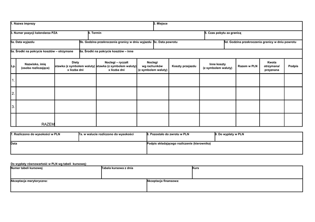 1. Nazwa imprezy 2. Miejsce 3. Numer pozycji kalendarza PZA 4. Termin 5. Czas pobytu za granicą 5a. Data wyjazdu 5b. Godzina przekroczenia granicy w dniu wyjazdu 5c. Data powrotu 6a. Środki na pokrycie kosztów – otrzymane 6a. Środki na pokrycie kosztów – inne Lp. Nazwisko, imię (osoba rozliczająca) Diety Noclegi – ryczałt Noclegi stawka (z symbolem waluty) stawka (z symbolem waluty) wg rachunków x liczba dni x liczba dni (z symbolem waluty) 5d. Godzina przekroczenia granicy w dniu powrotu Koszty przejazdu Inne koszty (z symbolem waluty) Razem w PLN 1. 2. 3. RAZEM 7. Rozliczono do wysokości w PLN 7a. w walucie rozliczono do wysokości Data Do wypłaty równowartość w PLN wg tabeli kursowej: Numer tabeli kursowej Akceptacja merytoryczna: 8. Pozostało do zwrotu w PLN 9. Do wypłaty w PLN Podpis składającego rozliczenie (kierownika) Tabela kursowa z dnia Kurs Akceptacja finansowa: Kwota otrzymana/ przyznana Podpis UWAGI: 1. W pozycji „Czas pobytu” wpisuje się liczbę pełnych dób od chwili przekroczenia granicy RP (wyjazd) do chwili przekroczenia granicy (powrót). Jedną dodatkową dobę można doliczyć, jeżeli pozostały (po odjęciu pełnych dób) czas pobytu za granicą przekracza 12 godzin. 2. Maksymalna wysokość diety oraz ryczałt za noclegi – ¼ limitu na wszystkie imprezy, zgodnie z limitem dla danego kraju (wysokość obowiązujących stawek diet i limitów hotelowych na poszczególne kraje na str. 4-8). 3. W przypadku posiadania rachunku za hotel, pełną kwotę z rachunku należy wpisać w rubryce „Noclegi wg rachunków” (pozostawiając w takim przypadku pustą rubrykę „Noclegi-ryczałt”). 4. W pozycji „Inne koszty” wpisuje się koszty udokumentowane rachunkami lub fakturami. Musi być na nich umieszczona kwota zapłacona; jeśli jest to rachunek lub faktura bez kwoty (jak to bywa np. w przypadku winiet na autostrady), to ten wydatek należy rozliczyć w dietach lub ryczałtem za hotel ew. kartą drogową. 5. W pozycji „Kurs waluty” należy wpisać kurs średni kurs z tabeli NBP obowiązującej w dniu powrotu (Uwaga! Każda tabela NBP obowiązuje od następnego dnia roboczego po jej ogłoszeniu – tzn., że jeśli np. powrót następuje w dniu 8.II należy stosować kurs z tabeli ogłoszonej w dniu 7.II, lub, jeśli w tym dniu tabela nie była ogłoszona – z dnia poprzedniego (informacja o kursach NBP: http://www.money.pl/pieniądze/nbparch/srednie). Numer tabeli, dzień jej ogłoszenia i kurs waluty należy wpisać pod opisem ,,Do wypłaty równowartość w PLN wg tabeli kursowej”. 6. W rubryce „Razem w PLN” – wpisuje się sumę poniesionych kosztów. 7. W rubryce „Kwota otrzymana/dotacja” – wpisuje się kwotę faktycznie przyznaną do rozliczenia lub faktycznie przekazaną zawodnikowi przez kierownika wyjazdu. 8. Pozycjach 7, 7a, 8 i 9 pozostają nie wypełnione. 9. Rozlicza się zawsze osoba, która otrzymała zaliczkę. 10. Załączone rachunki (faktury) powinny być opisane na odwrocie wg schematu: a) impreza + numer pozycji kalendarza PZA, b) termin, c) podpis osoby rozliczającej. 11. Jeżeli na zawody jedzie kilka osób to praktyczniej jest rozliczać się na jednym druku i napisać jedno sprawozdanie. W czasie imprezy (na zawodach, zgrupowaniu) można zebrać podpisy, a resztę druku uzupełnić po powrocie. 12. Do rozliczenia należy dołączyć sprawozdanie merytoryczne z imprezy. 13. Przykład wypełniania rozliczenia znajduje się na stronie 3. W razie pytań/wątpliwości prosimy o kontakt z biurem – telefon 022 875 85 05 lub mail [email protected]. Rozliczenie kosztów imprezy zagranicznej (przykład wypełniania) 1. Nazwa imprezy 2. Miejsce Mistrzostwa Europy we wspinaczce sportowej 2. Numer pozycji kalendarza PZA (wypełnia PZA) Chamonix, Francja 3. Termin 5. Czas pobytu za granicą: 12-13 lipca 2003 r. 4 dni 5a. Data wyjazdu 5b. Godz. przekroczenia granicy w dniu wyjazdu 5c. Data powrotu 5d. Godz. przekroczenia granicy w dniu powrotu 11 lipca 2003 9:00 14 lipca 2003 22:00 6a. Środki na pokrycie kosztów – otrzymane 6a. Środki na pokrycie kosztów – inne Lp. Nazwisko, imię (osoba rozliczająca) 1. Artur Kowalski Razem w PLN: 7. Rozliczono do wysokości Diety Noclegi – ryczałt stawka x liczba dni stawka x liczba dni Noclegi wg rachunków Koszty przejazdu Inne koszty 45 EUR x 4 dni x 3,8882 25 EUR x 4 dni x 3,8882 = 699,88 PLN = 388,82 PLN 699,88 388,82 7a. w walucie rozliczono do wysokości 8. Pozostało do zwrotu Razem w PLN Kwota otrzymana/ przyznana Podpis 1 088,70 1 000,00 (podpis) 1088,7 1000 9. Do wypłaty Data Podpis składającego rozliczenie (kierownika) 16 lipca 2003 r. (podpis) Do wypłaty równowartość w PLN wg tabeli kursowej: Numer tabeli kursowej Tabela kursowa z dnia 235/2003 14 lipca 2003 r. Akceptacja merytoryczna: Kurs 1 EUR = 3,882 PLN Akceptacja finansowa: Diety zagraniczne Wysokość diety za dobę podróży oraz limitu na nocleg w hotelu. Państwo Afganistan Albania Algieria Andora Angola Arabia Saudyjska Argentyna Armenia Australia Austria Azerbejdżan Bangladesz Belgia Białoruś Bośnia i Hercegowina Brazylia Bułgaria Chile Chiny Chorwacja Cypr Czechy Dania Egipt Ekwador Estonia Etiopia Finlandia Waluta Kwota diety Kwota limitu na nocleg USD EUR EUR EUR USD USD USD USD AUD EUR USD USD EUR USD EUR USD EUR USD USD EUR EUR EUR DKK USD USD EUR USD EUR 41.00 36.00 42.00 48.00 51.00 46.00 47.00 41.00 87.00 45.00 45.00 40.00 45.00 45.00 39.00 50.00 36.00 42.00 46.00 36.00 33.00 33.00 324.00 49.00 44.00 39.00 49.00 42.00 100.00 90.00 100.00 120.00 150.00 110.00 100.00 80.00 190.00 100.00 150.00 120.00 160.00 80.00 80.00 120.00 80.00 80.00 110.00 100.00 70.00 80.00 800.00 110.00 110.00 90.00 95.00 135.00 Francja Gibraltar Grecja Gruzja Hiszpania Hongkong Indie Indonezja Irak Iran Irlandia Islandia Izrael Japonia Jemen Jordania Kambodża Kanada Kazachstan Kenia Kirgistan Kolumbia Kongo, Demokratyczna Republika Konga Korea Południowa Koreańska Republika Ludowo-Demokr