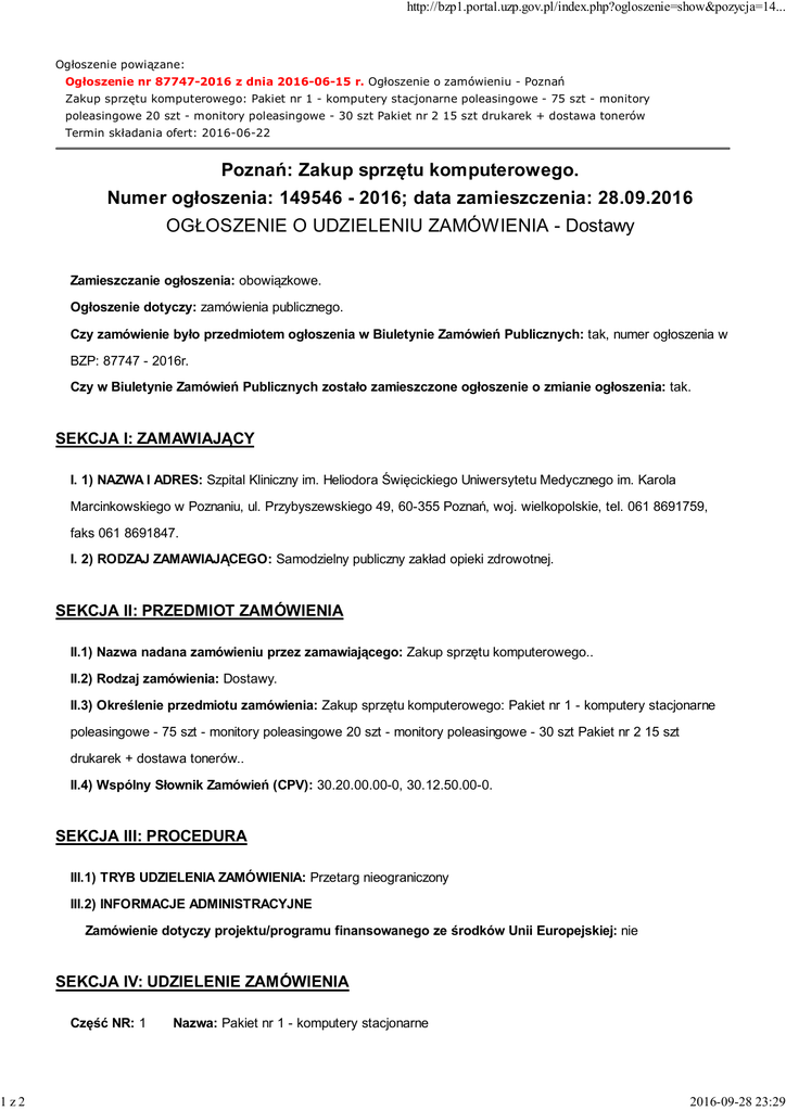 1z2 http://bzp1.portal.uzp.gov.pl/index.php?ogloszenie=show&pozycja=14... Ogłoszenie powiązane: Ogłoszenie nr 87747-2016 z dnia 2016-06-15 r. Ogłoszenie o zamówieniu - Poznań Zakup sprzętu komputerowego: Pakiet nr 1 - komputery stacjonarne poleasingowe - 75 szt - monitory poleasingowe 20 szt - monitory poleasingowe - 30 szt Pakiet nr 2 15 szt drukarek + dostawa tonerów Termin składania ofert: 2016-06-22 Poznań: Zakup sprzętu komputerowego. Numer ogłoszenia: 149546 - 2016; data zamieszczenia: 28.09.2016 OGŁOSZENIE O UDZIELENIU ZAMÓWIENIA - Dostawy Zamieszczanie ogłoszenia: obowiązkowe. Ogłoszenie dotyczy: zamówienia publicznego. Czy zamówienie było przedmiotem ogłoszenia w Biuletynie Zamówień Publicznych: tak, numer ogłoszenia w BZP: 87747 - 2016r. Czy w Biuletynie Zamówień Publicznych zostało zamieszczone ogłoszenie o zmianie ogłoszenia: tak. SEKCJA I: ZAMAWIAJĄCY I. 1) NAZWA I ADRES: Szpital Kliniczny im. Heliodora Święcickiego Uniwersytetu Medycznego im. Karola Marcinkowskiego w Poznaniu, ul. Przybyszewskiego 49, 60-355 Poznań, woj. wielkopolskie, tel. 061 8691759, faks 061 8691847. I. 2) RODZAJ ZAMAWIAJĄCEGO: Samodzielny publiczny zakład opieki zdrowotnej. SEKCJA II: PRZEDMIOT ZAMÓWIENIA II.1) Nazwa nadana zamówieniu przez zamawiającego: Zakup sprzętu komputerowego.. II.2) Rodzaj zamówienia: Dostawy. II.3) Określenie przedmiotu zamówienia: Zakup sprzętu komputerowego: Pakiet nr 1 - komputery stacjonarne poleasingowe - 75 szt - monitory poleasingowe 20 szt - monitory poleasingowe - 30 szt Pakiet nr 2 15 szt drukarek + dostawa tonerów.. II.4) Wspólny Słownik Zamówień (CPV): 30.20.00.00-0, 30.12.50.00-0. SEKCJA III: PROCEDURA III.1) TRYB UDZIELENIA ZAMÓWIENIA: Przetarg nieograniczony III.2) INFORMACJE ADMINISTRACYJNE Zamówienie dotyczy projektu/programu finansowanego ze środków Unii Europejskiej: nie SEKCJA IV: UDZIELENIE ZAMÓWIENIA Część NR: 1 Nazwa: Pakiet nr 1 - komputery stacjonarne 2016-09-28 23:29 2z2 http://bzp1.portal.uzp.gov.pl/index.php?ogloszenie=show&pozycja=14... IV.1) DATA UDZIELENIA ZAMÓWIENIA: 19.07.2016. IV.2) LICZBA OTRZYMANYCH OFERT: 6. IV.3) LICZBA ODRZUCONYCH OFERT: 2. IV.4) NAZWA I ADRES WYKONAWCY, KTÓREMU UDZIELONO ZAMÓWIENIA: IT Tronic Tomasz Kostecki,, Rogaszyce 82p,, 63-500 Ostrzeszów, kraj/woj. wielkopolskie. IV.5) Szacunkowa wartość zamówienia (bez VAT): 86382,11 PLN. IV.6) INFORMACJA O CENIE WYBRANEJ OFERTY ORAZ O OFERTACH Z NAJNIŻSZĄ I NAJWYŻSZĄ CENĄ Cena wybranej oferty: 95280,00 Oferta z najniższą ceną: 94623,90 / Oferta z najwyższą ceną: 118018,50 Waluta: PLN . Część NR: 2 Nazwa: Pakiet nr 2 15 szt drukarek + dostawa tonerów IV.1) DATA UDZIELENIA ZAMÓWIENIA: 19.07.2016. IV.2) LICZBA OTRZYMANYCH OFERT: 2. IV.3) LICZBA ODRZUCONYCH OFERT: 0. IV.4) NAZWA I ADRES WYKONAWCY, KTÓREMU UDZIELONO ZAMÓWIENIA: SUNTAR Sp. z o.o., Ul. Boya Żeleńskiego 5B, 33-100 Tarnów, kraj/woj. małopolskie. IV.5) Szacunkowa wartość zamówienia (bez VAT): 81036,95 PLN. IV.6) INFORMACJA O CENIE WYBRANEJ OFERTY ORAZ O OFERTACH Z NAJNIŻSZĄ I NAJWYŻSZĄ CENĄ Cena wybranej oferty: 28413,00 Oferta z najniższą ceną: 28413,00 / Oferta z najwyższą ceną: 31272,75 Waluta: PLN . 2016-09-28 23:29