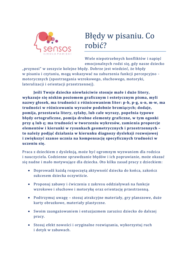 Błędy w pisaniu. Co robić? Wiele niepotrzebnych konfliktów i napięć emocjonalnych rodzi się, gdy nasze dziecko „przynosi” w zeszycie kolejne błędy. Dobrze jest wiedzieć, że błędy w pisaniu i czytaniu, mogą wskazywać na zaburzenia funkcji percepcyjno motorycznych (spostrzegania wzrokowego, słuchowego, motoryki, lateralizacji i orientacji przestrzennej). Jeśli Twoje dziecko niewłaściw ie stosuje małe i duże litery, wykazuje się niskim poziomem graficznym i estetycznym pisma, myli nazwy głosek, ma trudności z różnicowaniem liter: p-b, p-g, u-n, m-w, ma trudności w różnicowaniu wyrazów podobnie brzmiących ; dodaje, pomija, przestawia litery, sylaby, lub całe wyrazy, popełnia typowe błędy ortograficzne, pomija drobne elementy graficzne, w tym ogonki przy ą lub ę; ma trudności w tworzeniu wykresów, zamie nia proporcje elementów i kierunki w rysunkach geometrycznych i przestrzennych – to należy podjąć działania w kierunku diagnozy dysleksji rozwojowej i zwiększyć szanse ucznia na kompensację specyficznych trudności w uczeniu się. Praca z dzieckiem z dysleksją, może być ogromnym wyzwaniem dla rodzica i nauczyciela. Codzienne sprawdzanie błędów i ich poprawianie, może okazać się nudne i mało motywujące dla dziecka. Oto kilka zasad pracy z dzieckiem: Doprowadź każdą rozpoczętą aktywność dziecka do końca, zakończ sukcesem dziecka oczywiście. Proponuj zabawy i ćwiczenia z zakresu oddziaływań na funkcje wzrokowe i słuchowe i motorykę oraz orientację przestrzenną. Podtrzymuj uwagę – stosuj atrakcyjne materiały, gry planszowe, duże karty obrazkowe, materiały plastyczne. Swoim zaangażowaniem i entuzjazmem zarazisz dziecko do dalszej pracy. Stosuj efekt nowości i oryginalne rozwiązania, wykorzystuj ruch i dotyk w zabawach. Odwołuj się do wcześniejszych doświadczeń dziecka, koniecznie załóżcie Rejestr osiągnięć dziecka – to buduje jego poczucie własnej wartości i wiarę w swoje zdolności. Z własnego doświadczenia w pracy z dziećmi, wiem jak bardzo ważne jest indywidualne podejście do każdego dziecka. Każdy z nas preferuje indywidualny sposób przyswajania wiedzy. Jednym z takich sposobów jest kojarzenie przedm iotów, zjawisk czy zdarzeń. Wykorzystujemy do tego opowiadania, bajki czy wizualizacje. Na przykład prosimy dziecko o wspólne wymyślanie i wyobrażanie literki „n”, która postanowiła wykąpać się w rzece. Dalej poruszając się w sferze wyobraźni , ta sama literka „n” nurkuje, tak, że nogi literki „n” znalazły się na górze, a głowa wita się z falami. W ten sposób literka „n” przemieniła się w literkę „u”. Podczas opowiadania, kierujemy uwagę dziecka na wrażenia sensoryczne (słuchowe, wzrokowe, węchowe, czuciowe, smakowe). Po takim wstępie, możemy przejść do uzupełniania diagramów, rozwiązywania rebusów, porównywania wyrazów, np. „zima -zimna”, kolorowanie szablonów, lepienie literek z plasteliny, itp. Oto kilka pouczających gier i zabaw do zorganizowania poza szkołą: Spacer ortograficzny – wystarczy podczas spaceru, jazdy samochodem, tramwajem, wyłapać szyldy i reklamy oraz tablice z nazwami ulic. Pokaż je dziecku i głośno odczytaj. Jeśli kilkanaście razy zobaczy „żabkę" lub „różę", z pewnością zapamięta ich pisownię. Od ciebie zależy, czy skierujesz uwagę dziecka na napis i przeczytasz go. Karty wyrazowe – należy zrobić w programie (PowerPoint) slajdy z wyrazami o różnej trudności ortograficznej. Wyświetlaj je dziecku raz wolno, raz szybko, 2-3 razy dziennie. Można je odczytywać cicho, głośno lub śpiewająco, w rytm muzyki lub skacząc na skakance. Rysowanie w mące lub w piasku. Zabawa wyzwala pozytywne emocje. Memo/pary wyrazowe. Wystarczy wyciąć z kolorowego papieru kilkanaście „kafelek”. Wypisać podwójnie wyrazy, które sprawiają dziecku trudność ortograficzną. Wspaniała zabawa dla całej rodziny. Paski wyrazowe – pociąć kartkę A4 na cztery paski. Napisz kolorem czerwonym wyrazy i przyklej na rzeczy i przedmioty znajdujące się w domu, np. pasek z wyrazem „Lodówka” przyklej na lodówkę. Przechodząc kilka razy koło lodówki, dziecko mimo woli zapamięta, że lodówka pisze się przez „ó”. Własne programy multimedialne na koordynację wzrokowo -ruchową. Zrób slajdy w PowerPoint – kilka slajdów z grubą kreskę poziomą i kilka slajdów z pionową. Wyświetlaj w chaosie lub na przemian w różnym tempie. Dziecko na widok zmieniającego się obrazu porusza rękę raz w pionie raz w poziomie. Sokole oko – to nic innego jak zabawy na wyłapywanie różnic, dobieranie par jednakowych obrazków, układanie szeregów wg kryterium wielkości (malejąco-rosnąco), wg kryterium koloru (jasne – ciemne), klasyfikowanie i segregowanie figur ze względu na kształt, kolor; układanie relacji, poszukiwanie ukrytych literek w obrazkach. Kodowanie – dekodowanie. Zróbmy szalony alfabet - kartka A4, na której zapisujemy w chaosie kilkanaście wybranych literek („u”, „n”, „m”, „w”) . Nadajemy kod poszczególnym literkom: „u” to klaśnięcie, „n” to tupnięcie, ”m” to podskok, a „w” to obrót. Dzieci muszą dobrze opanować kod. Kartkę z napisanymi literkami umieszczamy na ścianie, biurku. Zabawa polega na rozszyfrowaniu wiadomości wizualnej i nadaniu jej ruchu – klaśnięcia czy tupnięcia. Zachęcam do nauki przez zabawę. Uśmiech i radość Waszych dzieci będzie dla Was największym sukcesem. Chwalcie swoje dzieci za drobne sukcesy, zamieńcie wady w zalety. Wytłumaczcie dziecku, że z dysleksją borykali się też sławni – Walt Disney i Thomas Edison. Z uwagi na złożoność problemów w nauce czytania i pisania, zachęcam do skorzystania z porad pedagoga lub psychologa. Uw zględniając zainteresowania dziecka oraz indywidualny styl uczenia się, na pewno zostanie dobrany odpowiedni zestaw pomocy dydaktycznych o