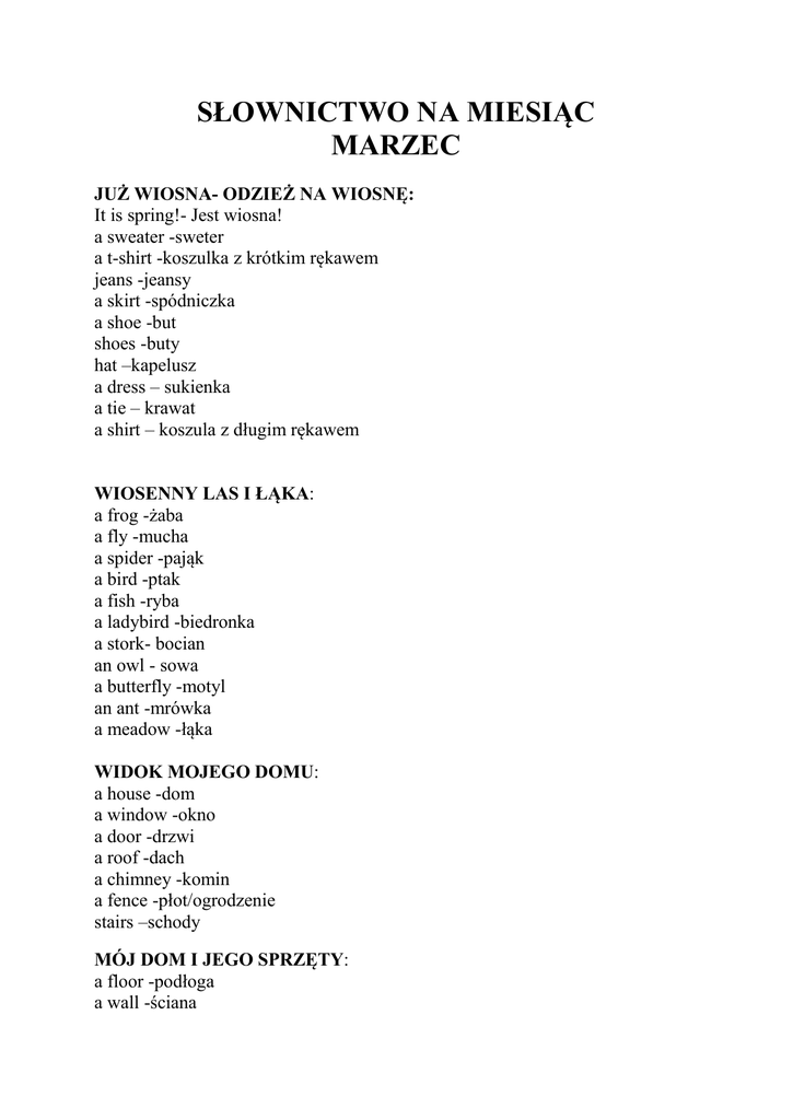 SŁOWNICTWO NA MIESIĄC MARZEC JUŻ WIOSNA- ODZIEŻ NA WIOSNĘ: It is spring!- Jest wiosna! a sweater -sweter a t-shirt -koszulka z krótkim rękawem jeans -jeansy a skirt -spódniczka a shoe -but shoes -buty hat –kapelusz a dress – sukienka a tie – krawat a shirt – koszula z długim rękawem WIOSENNY LAS I ŁĄKA: a frog -żaba a fly -mucha a spider -pająk a bird -ptak a fish -ryba a ladybird -biedronka a stork- bocian an owl - sowa a butterfly -motyl an ant -mrówka a meadow -łąka WIDOK MOJEGO DOMU: a house -dom a window -okno a door -drzwi a roof -dach a chimney -komin a fence -płot/ogrodzenie stairs –schody MÓJ DOM I JEGO SPRZĘTY: a floor -podłoga a wall -ściana a TV -telewizor a computer -komputer I can see- ja widzę a radio -radio a ceiling -sufit a lamp -lampa a picture -obraz a table -stół a chair -krzesło a carpet -dywan a curtain -zasłona a frying-pan -patelnia a fridge -lodówka a plate -talerz a tablespoon -duża łyżka a fork -widelec a washing-machine- zmywarka do naczyń a bed -łóżko a sofa -sofa a clock -zegar an armchair -fotel a desk -deska a cooker -piekarnik a bookcase –biblioteczka CZAS ŚWIĄT WIELKANOCNYCH: Easter Time -Wielkanoc Happy Easter! -Wesołego Świąt Wielkanocnych! an Easter egg -jajko wielkanocne an Easter rabbit -wielkanocny zając an Easter lamb -wielkanocny baranek an Easter chick wielkanocne piskle an Easter basket wielkanocny koszyk