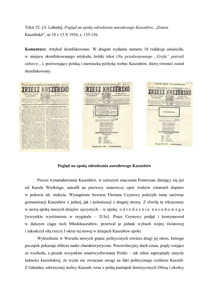 Tekst 52: [A. Labuda], Pogląd na epokę odrodzenia narodowego Kaszubów, „Zrzesz Kaszëbskô”, nr 18 z 15 X 1934, s. 135-136. Komentarz: Artykuł skonfiskowano. W drugim wydaniu numeru 18 redakcja umieściła, w miejscu skonfiskowanego artykułu, krótki tekst (Na przedwojennego „Gryfa” patrzeli zaborcy…), porównujący polską i niemiecką politykę wobec Kaszubów, który również został skonfiskowany. Pogląd na epokę odrodzenia narodowego Kaszubów Proces wynaradawiania Kaszubów, w szerszym znaczeniu Pomorzan, datujący się już od Karola Wielkiego, natrafił na pierwszy stanowczy opór wieków ostatnich dopiero w połowie ub. stulecia. Wystąpienie bowiem Floriana Ceynowy położyło tamę zarówno germanizacji Kaszubów z jednej, jak i polonizacji z drugiej strony. Z chwilą tą wkraczamy w nową epokę naszych dziejów ojczystych – w epokę o d r o d z e n i a n a r o d o w e g o [wszystkie wyróżnienia w oryginale – D.Sz]. Prace Ceynowy podjął i kontynuował w dalszym ciągu ruch Młodokaszubów, przerwał je jednak wybuch wojny światowej i zakończył siłą rzeczy I okres tej nowej w dziejach Kaszubów epoki. Wykreślenie w Wersalu nowych granic politycznych otwiera drugi jej okres, którego początek pokazuje oblicze nader charakterystyczne. Porewolucyjny duch czasu, prądy wiejące ze wschodu, a przede wszystkim zmartwychwstanie Polski – tak silnie zaprzątnęły umysły ludności kaszubskiej, że wcale nie zwracano uwagi na fakt politycznego rozbioru Kaszub: Z Gdańska, odwiecznej stolicy Kaszub, wraz z pełną pamiątek historycznych Oliwą i okolicy utworzono Wolne Miasto, część Kaszub przyłączono do Polski, a część do Niemiec. Charakterystycznym jest to, że rozbioru Kaszub dokonano właśnie w chwili, kiedy Europa stanęła pod sztandarem idei humanitarności, a zastępcy zwycięskich narodów wykreślali granice pod hasłem samostanowienia narodów. Nie mniej charakterystycznym jest to, że ludność kaszubska, wprawdzie nie uświadomiona i zupełnie zdezorientowana, zachowywała się w tym właśnie czasie tak ważnym dla spraw narodowych nie tylko biernie, ale po prostu tak, jak niemowlę, z którego majątkiem obcy dowolnie się dzielą, dając mu w zamian zabawkę do ręki. Kaszubom wystarczały przecież obiecanki przeróżnych agitatorów z Krakowa i Poznania o używaniu „złotej wolności” i o jadaniu „pszennego chleba” w Polsce, aby stać się przedmiotem targów międzynarodowych i bez protestu przyjąć do wiadomości dokonany rozbiór odwiecznej swej ziemi! W tym to czasie każdy, ktokolwiek zdobył się na odwagę pouczyć lud w kierunku narodowym kaszubskim, musiał z mównicy uchodzić przez okno, ratując swe życie. Fakta są powszechnie na Kaszubach znane. W takich warunkach, rzecz oczywista, nie mogło być ani nawet mowy o stworzeniu jakiegokolwiek bądź ośrodka narodowo-kaszubskiego, wychodzący w latach 1921. i –22 „Gryf”, nie znalazłszy wśród Kaszubów należytego zrozumienia, przestał wychodzić. Niemal zupełnie niepostrzeżenie przeszła drukowana w tychże rocznikach „Gryfa” źródłowa i gruntowna praca, owoc starannych studiów, obszerna monografia o Ceynowie – Wosia Budzisza [Wòs Bùdzysz – D.Sz.]1. Wskrzeszono wprawdzie „Gryfa” w roku 1925 – niestety, wyszedł tylko jeden zeszyt. Próby więc wskrzeszenia ruchu Młodokaszubów spełzły na niczym. Wobec tego należało odczekać czasu [sic!] i pozwolić ludności kaszubskiej na własną rękę posmakować obiecanego – „pszennego chleba”. Przede wszystkim zaś należało postawić nowy program ruchu kaszubskiego. Program bowiem przedwojenny siłą rzeczy przestał być aktualnym. Nowego programu przywódcy przedwojennego ruchu kaszubskiego nie zdołali już postawić; trudno bowiem jest zawsze dla ludzi, którzy się zżyli z pewną ideą, tyle w nią pracy z samozaparciem siebie włożyli, zmienić chociażby tylko drogę do wytkniętego celu. Należy zdać sobie sprawę, że Młodokaszubi dążyli do odrodzenia Kaszub przez Polskę – jako podcel, który osiągnięto. Przyłączenie bowiem części Kaszub do Polski jest w wielkiej mierze owocem prac Młodokaszubów i wielką ich zasługą: R o c z n i k i b o w i e m „G r y f a” l e ż a ł y n a s t o l e o b r a d w W e r s a l u j a k o d o k u m e n t a, stwierdzające wolę inteligencji kaszubskiej przyłączenia K a s z u b d o P o l s k i. Młodokaszubi spodziewali się w wolnej Polsce w nierównie lepszych warunkach kontynuować pracę ideową na Kaszubami. Niestety! Ruch kaszubski nie znalazł spodziewanego poparcia w Warszawie, ani należytego zrozumienia w Polsce. W ciasnych bowiem umysłach przeczulonych narodowo jednostek i w przystępie furii unifikatorskiej jest – nawet regionalizm kaszubski czymś „niebezpiecznym”! Z tej to głównie przyczyny przywódcy ruchu młodokaszubskiego usunęli się w cień. Zdawało się, że sprawę kaszubską już pogrzebano. W istocie rzeczy jednak pracowali Młodokaszubi nadal, oczywiście w odosobnieniu: D r A l e k s a n d e r M a j k o w s k i pracował nad stworzeniem prozy literackiej, której brak dawał się silnie odczuwać, i ukończył trzytomowe podstawowe dzieło pt. „Żëcé i przigòdë Remùsa”. Oprócz tego „Historią Kaszubów czyli Pomorzan” wypełnił brak podręcznej historii ojczystej, traktującej przedmiot z punktu widzenia kaszubskiego. Również ks. dr L e o n H e y k e pracował intensywnie. Napisał obszerne dzieło epiczne „Dobrogost i Miłosława”, drukiem wydał „Kaszëbsczi spiéwë” oraz piękne „Podania kaszubskie”, obok wielu innych rzeczy, znajdujących się dotąd w rękopisie. Tak samo i K a r n o w s k i J a n nie odłożył pióra. Zajmował się głównie krytyką, publikując swe prace w „Mestwinie”. Napisał również ważny przyczynek do historii kaszubskiej pt. „Udział Pomorza w walkach Polski o niepodległość”, oraz sztuczki sceniczn