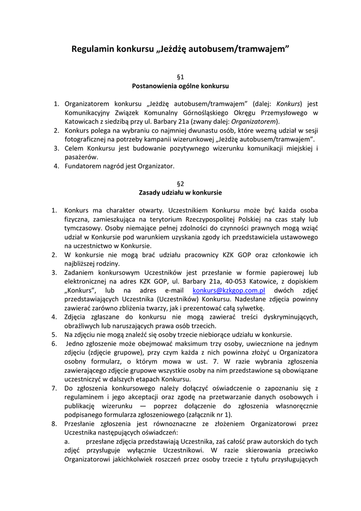 Regulamin konkursu „Jeżdżę autobusem/tramwajem” §1 Postanowienia ogólne konkursu 1. Organizatorem konkursu „Jeżdżę autobusem/tramwajem” (dalej: Konkurs) jest Komunikacyjny Związek Komunalny Górnośląskiego Okręgu Przemysłowego w Katowicach z siedzibą przy ul. Barbary 21a (zwany dalej: Organizatorem). 2. Konkurs polega na wybraniu co najmniej dwunastu osób, które wezmą udział w sesji fotograficznej na potrzeby kampanii wizerunkowej „Jeżdżę autobusem/tramwajem”. 3. Celem Konkursu jest budowanie pozytywnego wizerunku komunikacji miejskiej i pasażerów. 4. Fundatorem nagród jest Organizator. §2 Zasady udziału w konkursie 1. 2. 3. 4. 5. 6. 7. 8. Konkurs ma charakter otwarty. Uczestnikiem Konkursu może być każda osoba fizyczna, zamieszkująca na terytorium Rzeczypospolitej Polskiej na czas stały lub tymczasowy. Osoby niemające pełnej zdolności do czynności prawnych mogą wziąć udział w Konkursie pod warunkiem uzyskania zgody ich przedstawiciela ustawowego na uczestnictwo w Konkursie. W konkursie nie mogą brać udziału pracownicy KZK GOP oraz członkowie ich najbliższej rodziny. Zadaniem konkursowym Uczestników jest przesłanie w formie papierowej lub elektronicznej na adres KZK GOP, ul. Barbary 21a, 40-053 Katowice, z dopiskiem „Konkurs”, lub na adres e-mail [email protected] dwóch zdjęć przedstawiających Uczestnika (Uczestników) Konkursu. Nadesłane zdjęcia powinny zawierać zarówno zbliżenia twarzy, jak i prezentować całą sylwetkę. Zdjęcia zgłaszane do konkursu nie mogą zawierać treści dyskryminujących, obraźliwych lub naruszających prawa osób trzecich. Na zdjęciu nie mogą znaleźć się osoby trzecie niebiorące udziału w konkursie. Jedno zgłoszenie może obejmować maksimum trzy osoby, uwiecznione na jednym zdjęciu (zdjęcie grupowe), przy czym każda z nich powinna złożyć u Organizatora osobny formularz, o którym mowa w ust. 7. W razie wybrania zgłoszenia zawierającego zdjęcie grupowe wszystkie osoby na nim przedstawione są obowiązane uczestniczyć w dalszych etapach Konkursu. Do zgłoszenia konkursowego należy dołączyć oświadczenie o zapoznaniu się z regulaminem i jego akceptacji oraz zgodę na przetwarzanie danych osobowych i publikację wizerunku — poprzez dołączenie do zgłoszenia własnoręcznie podpisanego formularza zgłoszeniowego (załącznik nr 1). Przesłanie zgłoszenia jest równoznaczne ze złożeniem Organizatorowi przez Uczestnika następujących oświadczeń: a. przesłane zdjęcia przedstawiają Uczestnika, zaś całość praw autorskich do tych zdjęć przysługuje wyłącznie Uczestnikowi. W razie skierowania przeciwko Organizatorowi jakichkolwiek roszczeń przez osoby trzecie z tytułu przysługujących 9. 10. 11. 12. 13. im praw autorskich do zdjęć Organizator zawiadomi o tym fakcie Uczestnika, który obowiązany jest do pełnego i terminowego zaspokojenia powyższych roszczeń. b. Uczestnik upoważnia Organizatora do nieodpłatnego korzystania z nadesłanych zdjęć w czasie trwania Konkursu, jak również wyraża zgodę na ich publikację w materiałach Organizatora. Materiały powstałe na cele kampanii będą mogły być wykorzystywane we wszystkich materiałach promocyjnych i informacyjnych KZK GOP. Organizator nie ponosi odpowiedzialności za zgłoszenia utracone, uszkodzone, niewłaściwie złożone lub przesłane po upływie określonego terminu. Organizator nie zwraca nadesłanych zgłoszeń. Zgłoszenia do udziału w konkursie będą przyjmowane w dniach od 23 marca 2014 r. do 15 maja 2014 r. (w przypadku zgłoszeń dostarczanych listownie liczy się data stempla pocztowego). Każda osoba może nadesłać tylko jedno zgłoszenie. §3 Sposób rozstrzygnięcia konkursu 1. 2. 3. 4. 5. Spośród zdjęć nadesłanych przez Uczestników Konkursu Jury powołane przez Organizatora wybierze do 40 zgłoszeń, które zakwalifikowane zostaną do 2 etapu konkursu. Wybrani Uczestnicy zostaną zaproszeni na casting, podczas którego wezmą udział w zdjęciach próbnych. W trzecim etapie konkursu Jury wybierze finalistów konkursu — minimum 12 osób, które otrzymają zaproszenie do profesjonalnej sesji zdjęciowej. Wybrani finaliści konkursu wezmą udział w profesjonalnej sesji zdjęciowej. W razie rezygnacji finalisty z udziału w sesji Organizator może wybrać kolejną osobę spośród Uczestników biorących udział w castingu. Uczestnicy podczas castingu mają obowiązek posiadać dowód tożsamości/legitymację szkolną, a Organizator ma prawo zażądać w każdej chwili ich okazania. Nieokazanie takiego dokumentu może spowodować wykluczenie Uczestnika z dalszego udziału w Konkursie. Wszystkie dane oraz informacje otrzymane przez Organizatora od każdego z Uczestników muszą być prawdziwe, dokładne oraz nie mogą wprowadzać w błąd. Organizator zastrzega sobie prawo do zwiększenia lub zmniejszenia liczby osób zakwalifikowanych do castingu albo do finału. §4 Nagrody 1. 2. 3. 4. Wszyscy Uczestnicy, których fotografie trafią do drugiego etapu konkursu, zostaną nagrodzeni biletami miesięcznymi o wartości 150 zł każdy (bilet miesięczny autobusowo-tramwajowy, normalny, sieciowy). Warunkiem odbioru nagrody będzie udział w castingu. Nagrody wręczone zostaną po wykonaniu zdjęć próbnych. Osoby, które nie zgłoszą się na casting, rezygnują z przyznanej nagrody. O dacie i miejscu castingu wybrani uczestnicy zostaną powiadomieni indywidualnie poprzez e-mail lub telefonicznie. Bilety nie podlegają wymianie na ich równowartość finansową. 5. 6. 7. 8. Nagrodą dla finalistów trzeciego etapu konkursu będzie kwota 1 500 zł dla każdej osoby. Warunkiem odbioru nagrody będzie udział w sesji fotograficznej i podpisanie z Organizatorem odpowiedniej umowy (załącznik nr 2). W przypadku zgłoszenia grupowego wartość nagrody zostanie zwiększona proporcjonalnie do liczby zakwalifikowanych osób. W przypadku grupy dwuosobowej wartość nagro