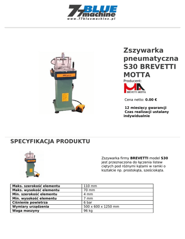 Zszywarka pneumatyczna S30 BREVETTI MOTTA Producent: Cena netto: 0.00 € 12 miesięcy gwarancji Czas realizacji ustalany indywidualnie SPECYFIKACJA PRODUKTU Zszywarka firmy BREVETTI model S30 jest przeznaczona do łączenia listew ciętych pod różnymi kątami w ramki o kształcie np. prostokąta, sześciokąta. Maks. szerokość elementu Maks. wysokość elementu Min. szerokość elementu Min. wysokość elementu Ciśnienie powietrza Wymiary urządzenia Waga maszyny 110 mm 70 mm 4 mm 7 mm 6 bar 500 x 600 x 1250 mm 96 kg MOCNE STRONY • Łączenie wykonywane jest za pomocą zszywek podczas jednej operacji. • Maszyna ta może osadzać zszywki dwóch typów do wyboru: PV (do drewna miękkiego i średnio twardego) i zszywek NP (do drewna twardego i bardzo twardego oraz do MDF-u). • Urządzenie jest szczególnie przydatne przy średniej i dużej produkcji ramek i podobnych elementów do mebli, drzwi, obrazów i luster. • W zszywarce S 30 istnieje możliwość ręcznego ustawienia dwóch różnych pozycji wbijania zszywek, w zależności od szerokości elementu. • Urządzenie zostało wyposażone w docisk pionowy (górny) i docisk poziomy elementu oraz reduktor do regulacji mocy wbijania zszywek.