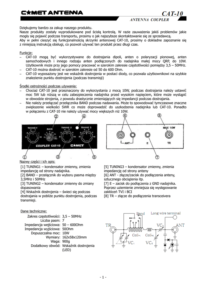 Dziękujemy bardzo za zakup naszego produktu. Nasze produkty zostały wyprodukowane pod ścisłą kontrolą. W razie zauważenia jakiś problemów jakie mogły się pojawić podczas transportu, prosimy o jak najszybsze skontaktowanie się ze sprzedawcą. Aby w pełni cieszyć się funkcjonalnością skrzynki antenowej CAT-10, prosimy o dokładne zapoznanie się z niniejszą instrukcją obsługi, co pozwoli używać ten produkt przez długi czas. Funkcje: – CAT-10 mogą być wykorzystywane do dostrajania dipoli, anten o polaryzacji pionowej, anten samochodowych i innego rodzaju anten podłączonych do nadajnika małej mocy QRP, do 10W. Użytkownik może przy jego pomocy pracować w szerokim zakresie częstotliwości pomiędzy 3,5 – 50MHz. – CAT-10 można dostroić w szerokim zakresie od 50 do 600 Ohm. – CAT-10 wyposażony jest we wskaźnik dostrojenia w postaci diody, co pozwala użytkownikowi na szybkie znalezienie punktu dostrojenia (podczas transmisji) Środki ostrożności podczas używania: – Chociaż CAT-10 jest przeznaczony do wykorzystania z mocą 10W, podczas dostrajania należy ustawić moc 5W lub niższą w celu zabezpieczenia nadajnika przed wysokim napięciem, które może wystąpić w obwodzie strojenia, z powodu drastycznie zmieniających się impedancji podczas dostrajania. – Nie należy przełączać przełącznika BAND podczas nadawania. Może to spowodować tymczasowe znaczne zwiększenie wielkości SWR co może doprowadzić do uszkodzenia nadajnika lub CAT-10. Ponadto w połączeniu z CAT-10 nie należy używać mocy większych niż 10W. Nazwy części i ich opis: [1] TUNING1 – kondensator zmienny, zmienia impedancję od strony nadajnika. [2] BAND – przełącznik do wyboru pasma między 3,5MHz i 50MHz [3] TUNING2 – kondensator zmienny do zmiany dopasowania [4] Wskaźnik dostrojenia – świeci się podczas dostrajania w pobliże punktu dostrojenia, podczas transmisji. Dane techniczne: Zakres częstotliwości: Liczba pasm: Impedancja wejściowa: Impedancja wyjściowa: Dopuszczalna moc: Wymiary: Waga: Dodatkowy obwód: [5] TUNING3 – kondensator zmienny, zmienia impedancję od strony anteny [6] ANT - złącze/zacisk do podłączenia anteny, sztucznego obciążenia itp. [7] E – zacisk do podłączenia z GND nadajnika. Poprzez uziemienie zmniejsza się występowanie zakłóceń TVI i BCI [8] TR – złącze do podłączenia transceivera 3,5 – 50MHz 7 50 – 600Ohm 50Ohm 10W 162x58x120mm 900g Wskaźnik dostrojenia (LED) -1- Podłączenie: Podłączeń CAT-10 do radiotelefonu lub do radiotelefonu i miernika SWR należy dokonać za pomocą kabla koncentrycznego 50Ohm 3D2V, 5D2V lub innego. Jeśli antena jest typu LONG WIRE, należy ją podłączyć za pomocą zacisku ANT. Uziemienie należy podłączyć do zacisku E. Procedura strojenia: Aby korzystać z CAT-10 wyłącznie do odbioru należy ustawić odpowiedni zakres za pomocą przełącznika BAND oraz pokrętła TUNING1/2/3 tak, aby S-meter w odbiorniku miał maksymalne wskazanie, lub żeby odsłuch był najlepszy. Do wstępnego dostrojenia użyj tabeli znajdującej się niżej. Aby skorzystać z CAT-10 do transmisji, działaj z procedurami poniżej: 1. Obniż moc nadajnika do 5W lub mniejszej. 2. Ustaw pasmo przy pomocy przełącznika BAND oraz ustaw pokrętła TUNING1/2/3 na wartości według poniższej tabeli: Częstotliwość (MHz) BAND TUNING1 TUNING2 TUNING3 3,5 3MHz 3,5 0,3 8,5 3,8 3MHz 2,0 0,6 7,0 7 7MHz 4,2 0,5 9,0 10 14MHz 0,5 4,1 6,0 14 14MHz 3,8 1,3 3,2 18 14MHz 4,0 1,0 1,5 21 28MHz 4,7 2,0 3,0 24 28MHz 4,6 1,8 1,5 28 28MHz 5,4 1,1 1,6 0,9 1,3 50 50MHz 7,0 Uwaga: Dane powyższe odnoszą się do obciążenia o impedancji 50Ohm 3. Ustaw moc, która będzie powodowała wychylanie się wskazówki podłączonego miernika SWR podczas transmisji CW, AM lub FM. 4. Obracaj pokrętło TUNING1 aż do uzyskania najmniejszego wychylenia wskazówki SWR metra. Aby skorzystać ze wskaźnika dostrojenia LED, należy ustawić pokrętło w miejscu, gdzie wskaźnik dostrojenia będzie świecił najjaśniej. 5. Następnie obracaj pokrętło TUNING2 tak, żeby SWR metr wskazywał wartość niższą od wartości uzyskanej podczas wykonywania czynności z punktu 4. 6. Powyższą czynność należy powtórzyć przy pomocą pokrętła TUNING3 w celu dalszego zmniejszenia wartości SWR. 7. Powtarzaj czynności z punktów 4-6 aż do uzyskania najniższej wartości SWR. 8. Jeśli nie można uzyskać niskiego SWR, przerwij transmisję, przełącz przełącznik BAND o stopień niżej i powtórz czynności dostrajania od punktu 3. 9. Włączenie maksymalnej mocy 10W jest możliwe dopiero po uzyskaniu niskiej wartości SWR. Comet Co., LTD 4-18-2 Tsuji, Minami-ku, Saitama City, Saitama 336-0026 eNka s.c. - [email protected] www.comet-ant.pl Wygląd produktu i dane techniczne mogą ulec zmianie bez powiadomienia w celu polepszenia jego właściwości -2-
