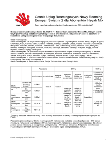 Cennik Usług Roamingowych Nowy Roaming – Europa i Świat nr 2 dla Abonentów Heyah Mix Ceny za usługi podane w kwotach brutto, zawierają 23% podatek VAT Niniejszy cennik jest ważny od dnia 30.04.2016 r. i dotyczy tych Abonentów Heyah Mix, których cennik taryfy (cennik usług podstawowych) bezpośrednio przed działem „Objaśnienia” zawiera odesłanie w kwestii cen usług roamingowych do niniejszego dokumentu. Strefy roamingowe: Strefa roamingowa 1A: kraje Unii Europejskiej oraz inne wybrane kraje i terytoria: Austria, Azory, Belgia, Bułgaria, Chorwacja, Cypr, Czechy, Dania, Estonia, Finlandia, Francja, Gibraltar, Grecja, Gujana Francuska, Gwadelupa, Hiszpania, Holandia, Irlandia, Islandia, Liechtenstein, Litwa, Luksemburg, Łotwa, Madera, Malta, Martynika, Niemcy, Norwegia, Portugalia, Reunion, Rumunia, Słowacja, Słowenia, Szwecja, Watykan, Węgry, Wielka Brytania, Włochy, Wyspy Kanaryjskie Strefa roamingowa 1B: pozostałe kraje europejskie z wykluczeniem krajów ze Strefy roamingowej 3: Albania, Andora, Białoruś, Bośnia i Hercegowina, Czarnogóra, Kosowo, Macedonia, Mołdawia, Monako, San Marino, Serbia, Szwajcaria, Turcja, Ukraina, Wyspa Guernsey, Wyspa Jersey, Wyspa Man, Wyspy Owcze Strefa roamingowa 2: operatorzy satelitarni i reszta świata z wykluczeniem krajów: Strefy roamingowej 1A, Strefy roamingowej 1B i Strefy roamingowej 3 Strefa roamingowa 3: Kazachstan, Kuba, Rosja, Turkmenistan oraz Promy i Statki Połączenia SMS-y wysłanie wychodzące przychodzące SMS-a Strefa roamingowa 1A Do strefy 1A (w tym do 1) Polski) wysłanie SMS-a specjalnego wysłanie SMS-a na stacjonarny MMS-y odebranie SMS-a 0,53 zł za każdą wiadomość MMS (maksymalni e do 300 kB) 0,54 zł 0,05 zł Do pozostałych stref 0,95 zł Strefa roamingowa 1B Do pozostałych stref 6,05 zł Strefa roamingowa 2 Do wszystkich stref 12,10 zł Strefa roamingowa 3 Do wszystkich stref 18,14 zł 6,05 zł 0,23 zł 1,97 zł opłata za wysłanie SMS-a w Roamingu zgodna z taryfą + opłata za SMS specjalny zgodna z taryfą opłata za wysłanie SMS-a w Roamingu zgodna z taryfą + opłata za SMS na stacjonarny zgodna z taryfą wysłanie lub odebranie wiadomości MMS w Roamingu bezpłatne 4,03 zł za każde 100 kB 1) dotyczy połączeń na terenie strefy 1A na numery operatorów ze Strefy 1A oraz połączeń roamingowych do Polski Połączenia przychodzące w Strefie roamingowej 1A naliczane są za każdą sekundę połączenia - 1/60 stawki minutowej. Połączenia wychodzące w Strefie roamingowej 1A naliczane są za pierwsze rozpoczęte 30 sekund połowa stawki minutowej, a następnie za każdą sekundę - 1/60 stawki minutowej. Połączenia przychodzące i wychodzące w Strefach roamingowych 1B, 2 i 3 naliczane są za każdą rozpoczętą minutę. Cennik obowiązuje od 30.04.2016 r. 1 Cennik Usług Roamingowych Nowy Roaming – Europa i Świat nr 2 dla Abonentów Heyah Mix Podane opłaty za połączenia dotyczą także transmisji danych (z wyłączeniem pakietowej transmisji danych). W usłudze roaming opłaty za połączenia z Pocztą głosową +48888001111 naliczane są jak za połączenie do Polski zgodnie z niniejszym cennikiem. Maksymalna wielkość pojedynczej wiadomości MMS w roamingu wynosi 300 kB. Pakietowa transmisja danych za granicą (APN: internet lub inny APN udostępniony przez Operatora przeznaczony do połączeń z Internetem ogólnego użytku) Strefa roamingowa 0,46 zł za 1 MB 1A Pakietowa transmisja danych za granicą Strefa roamingowa 1B Strefa roamingowa 2 4,03 zł za każde 100 kB Strefa roamingowa 3 W Strefie roamingowej 1A opłaty naliczane są za każdy 1 kB, oddzielnie za dane wysłane i odebrane na poziomie protokołu internetowego (IP). W pozostałych strefach roamingowych opłaty naliczane są za każde rozpoczęte 100 kB, oddzielnie za dane wysłane i odebrane na poziomie protokołu internetowego (IP); 1 kB = 1024 B. Po zakończeniu połączenia dane są zaokrąglane w górę, do pełnej jednostki taryfikacyjnej. Korzystanie z Pakietowej transmisji danych za granicą wymaga posiadania aktywnej usługi Pakietowa transmisja danych w Polsce oraz aktywnej usługi Roaming. Szczegółowe informacje dotyczące listy sieci, w których można korzystać z usługi Pakietowa transmisja danych za granicą są dostępne na stronie www.heyah.pl. Obsługa konta w usłudze Roaming Uzupełnienie konta wysłanie Ekspresowego kodu: *109*14-cyfrowy kod uzupełniający# bezpłatne Sprawdzenie stanu konta wysłanie Ekspresowego kodu: *108# bezpłatne Przeniesienie połączenia do Poczty głosowej +48 888000011 na terenie Unii Europejskiej (Strefa 1A) bezpłatne Połączenie z numerem Biura Obsługi Klienta +48 888 00 2222 opłata jak za połączenie do Polski zgodna z cennikiem roamingowym Szczegółowe informacje są dostępne na www.heyah.pl oraz pod numerami: Biura Obsługi Klienta *2222 (koszt połączenia z numeru w Systemie Heyah Mix na terenie Polski, 1,00 zł za każdą rozpoczętą minutę), +48 888 00 2222 (koszt połączenia na terenie Polski zgodny z cennikiem operatora sieci, z której wykonywane jest połączenie) lub pod numerem Infolinii 0801222111 (na terenie Polski koszt połączenia zgodny z cennikiem operatora sieci, z której wykonywane jest połączenie). Objaśnienia Stan konta oraz wartość poszczególnych połączeń, SMS-ów i usług są wyliczane w oparciu o ceny netto. Przy informowaniu klienta o stanie konta podawana jest kwota obejmująca podatek VAT, zaokrąglona do pełnego grosza. Operator Operator – T-Mobile Polska S.A. Roaming Możliwość wykonywania połączeń i korzystania z innych usług w roamingu może być ograniczona. Opłaty z tytułu korzystania z usługi Roaming mogą być naliczane z opóźnieniem. Opłata za warunkowe przekierowanie połączeń (np. przeniesienie nieodebranych połączeń do Poczty głosowej) składa się z dwóch elementów: opłaty za roamingowe połączenie wykonywane do Polski oraz połączenie roamingowe odbierane w kraju,