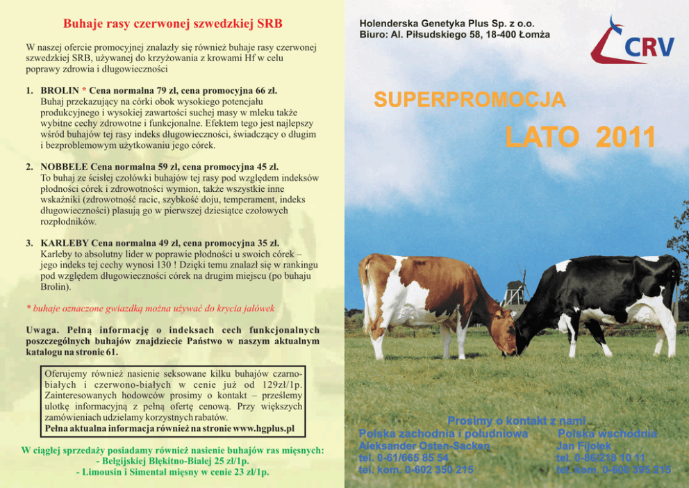 Buhaje rasy czerwonej szwedzkiej SRB Holenderska Genetyka Plus Sp. z o.o. Biuro: Al. Piłsudskiego 58, 18-400 Łomża W naszej ofercie promocyjnej znalazły się również buhaje rasy czerwonej szwedzkiej SRB, używanej do krzyżowania z krowami Hf w celu poprawy zdrowia i długowieczności 1. BROLIN * Cena normalna 79 zł, cena promocyjna 66 zł. Buhaj przekazujący na córki obok wysokiego potencjału produkcyjnego i wysokiej zawartości suchej masy w mleku także wybitne cechy zdrowotne i funkcjonalne. Efektem tego jest najlepszy wśród buhajów tej rasy indeks długowieczności, świadczący o długim i bezproblemowym użytkowaniu jego córek. SUPERPROMOCJA LATO 2011 2. NOBBELE Cena normalna 59 zł, cena promocyjna 45 zł. To buhaj ze ścisłej czołówki buhajów tej rasy pod względem indeksów płodności córek i zdrowotności wymion, także wszystkie inne wskaźniki (zdrowotność racic, szybkość doju, temperament, indeks długowieczności) plasują go w pierwszej dziesiątce czołowych rozpłodników. 3. KARLEBY Cena normalna 49 zł, cena promocyjna 35 zł. Karleby to absolutny lider w poprawie płodności u swoich córek – jego indeks tej cechy wynosi 130 ! Dzięki temu znalazł się w rankingu pod względem długowieczności córek na drugim miejscu (po buhaju Brolin). * buhaje oznaczone gwiazdką można używać do krycia jałówek Uwaga. Pełną informację o indeksach cech funkcjonalnych poszczególnych buhajów znajdziecie Państwo w naszym aktualnym katalogu na stronie 61. Oferujemy również nasienie seksowane kilku buhajów czarnobiałych i czerwono-białych w cenie już od 129zł/1p. Zainteresowanych hodowców prosimy o kontakt – prześlemy ulotkę informacyjną z pełną ofertę cenową. Przy większych zamówieniach udzielamy korzystnych rabatów. Pełna aktualna informacja również na stronie www.hgplus.pl W ciągłej sprzedaży posiadamy również nasienie buhajów ras mięsnych: - Belgijskiej Błękitno-Białej 25 zł/1p. - Limousin i Simental mięsny w cenie 23 zł/1p. Prosimy o kontakt z nami Polska zachodnia i południowa Polska wschodnia Aleksander Osten-Sacken tel. 0-61/665 85 54 tel. kom. 0-602 350 215 Jan Fijołek tel. 0-86/218 10 11 tel. kom. 0-600 395 215 SUPERPROMOCJA LATO 2011 r. Oferta promocyjna obejmuje wszystkie dostawy w okresie lipiec – wrzesień br. BUHAJE CZARNO – BIAŁE 1. GOLI * Cena normalna 89 zł, cena promocyjna 74 zł. Piękne, bardzo zdrowe wymiona. Doskonała długowieczność córek. 2. LINDBERG Cena normalna 89 zł, cena promocyjna 74 zł. Fantastyczne, bardzo zdrowe wymiona. Doskonała ocena ogólna pokroju córek. 3. MALAGA * Cena normalna 79 zł, cena promocyjna 66 zł. Wysoki potencjał produkcyjny, b. dobra długowieczność i zdrowotność wymion. 4. BERTIL Cena normalna 72 zł, cena promocyjna 62 zł. Doskonała zawartość białka w mleku, wysoka produkcja, zdrowe wymiona. 5. MAGNUM Cena normalna 56 zł, cena promocyjna 45 zł. Wysoka wydajność, bardzo dobry skład mleka. Poprawia szybkość doju. 6. MISTRAL Cena normalna 56 zł, cena promocyjna 45 zł. Bardzo dobre, zdrowe wymiona. Wydłuża strzyki, poprawia szybkość doju. BUHAJE CZERWONO – BIAŁE 1. IDEAL Cena normalna 79 zł, cena promocyjna 66 zł. Piękne, zdrowe wymiona. Doskonały skład mleka córek. 2. KODAK * Cena normalna 79 zł, cena promocyjna 66 zł. Rewelacyjny indeks długowieczności (lgv = 672 dni). Świetny skład mleka. 3. INTEGRO Cena normalna 70 zł, cena promocyjna 54 zł. Wysoka produkcja, piękne zdrowe wymiona. Wydłuża strzyki. 4. KLIMMER Cena normalna 65 zł, cena promocyjna 54 zł. Doskonale poprawia suchą masę w mleku, córki zdrowe i długowieczne. 5. SPENCER * Cena normalna 65 zł, cena promocyjna 50 zł. Rewelacyjnie poprawia % białka w mleku, najwyższy indeks NVI = 215 (buhaje czb) * buhaje oznaczone gwiazdką można używać do krycia jałówek (wycena kwiecień 2011r.) Poza tym z poprzedniej promocji Ferma Bydła pozostały w cenach promocyjnych buhaje MANITAS (cb) – 66 zł i AMISTAR (czb) – 66 zł/1p. Ta oferta ważna jest do wyczerpania zapasu nasienia w tańszej cenie. Chcielibyśmy zwrócić też Państwa uwagę na buhaje, których nasienie oferujemy w katalogu w całorocznych cenach promocyjnych, a jest ich razem kilkanaście. Wiele z nich to sprawdzone, wysoko wycenione rozpłodniki, o stabilnej lub nawet wzrastającej ocenie. Np. buhaj IMPULS (cb, 74 zł/1p.) w wycenie kwietniowej poprawił wszystkie wskaźniki produkcyjne, a także indeks długowieczności (lgv = 538) i syntetyczny indeks hodowlany NVI – aktualnie wynosi on 259 i jest to najwyższy indeks w Holandii. Na ostatniej stronie oferta promocyjna nasienia buhajów rasy czerwonej szwedzkiej SRB.