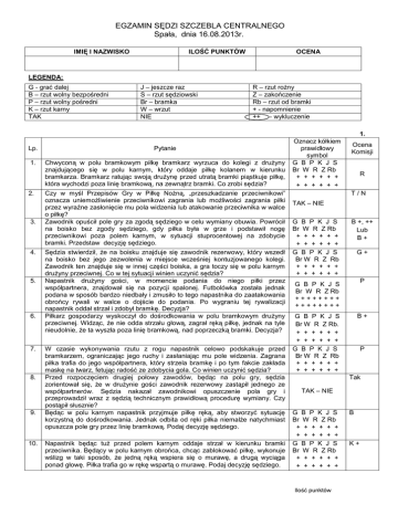 EGZAMIN SĘDZI SZCZEBLA CENTRALNEGO Spała, dnia 16.08.2013r. IMIĘ I NAZWISKO ILOŚĆ PUNKTÓW OCENA LEGENDA: G - grać dalej B – rzut wolny bezpośredni P – rzut wolny pośredni K – rzut karny TAK J – jeszcze raz S – rzut sędziowski Br – bramka W – wrzut NIE R – rzut rożny Z – zakończenie Rb – rzut od bramki + - napomnienie ++ - wykluczenie 1. Lp. Pytanie 1. Chwyconą w polu bramkowym piłkę bramkarz wyrzuca do kolegi z drużyny znajdującego się w polu karnym, który oddaje piłkę kolanem w kierunku bramkarza. Bramkarz ratując swoją drużynę przed utratą bramki piąstkuje piłkę, która wychodzi poza linię bramkową, na zewnątrz bramki. Co zrobi sędzia? 2. 3. 4. 5. 6. 7. 8. 9. 10. Czy w myśl Przepisów Gry w Piłkę Nożną, „przeszkadzanie przeciwnikowi” oznacza uniemożliwienie przeciwnikowi zagrania lub możliwości zagrania piłki przez wyraźne zasłonięcie mu pola widzenia lub atakowanie przeciwnika w walce o piłkę? Zawodnik opuścił pole gry za zgodą sędziego w celu wymiany obuwia. Powrócił na boisko bez zgody sędziego, gdy piłka była w grze i podstawił nogę przeciwnikowi poza polem karnym, w sytuacji stuprocentowej na zdobycie bramki. Przedstaw decyzję sędziego. Sędzia stwierdził, że na boisku znajduje się zawodnik rezerwowy, który wszedł na boisko bez jego zezwolenia w miejsce wcześniej kontuzjowanego kolegi. Zawodnik ten znajduje się w innej części boiska, a gra toczy się w polu karnym drużyny przeciwnej. Co w tej sytuacji winien uczynić sędzia? Napastnik drużyny gości, w momencie podania do niego piłki przez współpartnera, znajdował się na pozycji spalonej. Futbolówka została jednak podana w sposób bardzo niedbały i zmusiło to tego napastnika do zaatakowania obrońcy rywali w walce o dojście do podania. Po wygraniu tej rywalizacji napastnik oddał strzał i zdobył bramkę. Decyzja? Piłkarz gospodarzy wyskoczył do dośrodkowania w polu bramkowym drużyny przeciwnej. Widząc, że nie odda strzału głową, zagrał ręką piłkę, jednak na tyle nieudolnie, że ta wyszła poza linię bramkową, nad poprzeczką bramki. Decyzja? W czasie wykonywania rzutu z rogu napastnik celowo podskakuje przed bramkarzem, ograniczając jego ruchy i zasłaniając mu pole widzenia. Zagrana piłka trafia do jego współpartnera, który strzela bramkę i po tym fakcie zakłada maskę na twarz, fetując radość ze zdobycia gola. Co winien uczynić sędzia? Przed rozpoczęciem drugiej połowy zawodów, będąc na polu gry, sędzia zorientował się, że w drużynie gości zawodnik rezerwowy zastąpił jednego ze współpartnerów. Sędzia nakazał zawodnikowi opuszczenie pola gry i przeprowadził wraz z sędzią technicznym prawidłową procedurę wymiany. Czy postąpił słusznie? Będąc w polu karnym napastnik przyjmuje piłkę ręką, aby stworzyć sytuację korzystną do dośrodkowania. Jednak odbita od ręki piłka niemalże natychmiast opuszcza pole gry przez linię bramkową. Podaj decyzję sędziego. Napastnik będąc tuż przed polem karnym oddaje strzał w kierunku bramki przeciwnika. Będący w polu karnym obrońca, chcąc zablokować piłkę, wykonuje wślizg w taki sposób, że jedną ręką wspiera się o murawę, a drugą wyciąga ponad głowę. Piłka trafia go w rękę wspartą o murawę. Podaj decyzję sędziego. Oznacz kółkiem prawidłowy symbol G B P K J S Br W R Z Rb + + + + + + + + + + + + Ocena Komisji R T/N TAK – NIE G B P K J S Br W R Z Rb + + + + + + + + + + + + G B P K J S Br W R Z Rb + + + + + + + + + + + + B +, ++ Lub B+ G+ P G B P K J S Br W R Z Rb ++++++++ ++++++++ B+ G B P K J S Br W R Z Rb. + + + + + + + + + + + + G B P K J S Br W R Z Rb + + + + + + + + + + + + P Tak TAK – NIE G B P K J S Br W R Z Rb + + + + + + + + + + + + G B P K J S Br W R Z Rb + + + + + + + + + + + + Ilość punktów B K+ EGZAMIN SĘDZI SZCZEBLA CENTRALNEGO Spała, dnia 16.08.2013r. 2. Lp. Pytanie 11 W czasie gdy piłka była w grze w środkowej strefie boiska, zawodnik drużyny gości zmienił się funkcją z bramkarzem, nie informując o tym sędziego. Widział to kapitan drużyny gospodarzy, który zbliżył się do sędziego i grzecznie informuje: „Panie sędzio, co oni wyprawiają”. Co w tej sytuacji powinien uczynić sędzia? Zawodnik drużyny atakującej bez zgody sędziego w celu uniknięcia spalonego opuścił pole gry przez linię bramkową, sygnalizując tym samym, że nie zamierza brać udziału aktywnie w grze. Powrócił na nie również bez zgody sędziego, usiłując odebrać piłkę przejętą przez przeciwnika. Co na to sędzia? W środku pola bramkowego, w wyniku walki o górną piłkę, bramkarz i zawodnik z pola zderzyli się ze sobą i potrzebowali natychmiastowej pomocy. Sędzia widząc to przerwał grę. Proszę zaznaczyć odpowiedzi świadczące o właściwym postępowaniu sędziego: A. - noszowi wchodzą na boisko razem ze służbami medycznymi B. - pomoc jest udzielana na polu gry C. - zawodnicy po udzieleniu pomocy mogą pozostać na polu gry, D. - jest wznowiona rzutem sędziowskim z miejsca, gdzie znajdowała się piłka w chwili przerwania gry Sędzia zarządził wykonanie rzutu wolnego na sygnał gwizdkiem. Po odsunięciu muru i zajęciu przez sędziego dogodnej pozycji do obserwacji zdarzeń, wykonawca rzutu kopnął piłkę w ten sposób, że ta nie dotknięta przez żadnego zawodnika przekroczyła linię bramkową poza słupkami bramkowymi. Podaj decyzję sędziego. Drużyna która liczy siedmiu zawodników jest przy piłce i konstruuje korzystną dla siebie akcję . W tym czasie jeden z zawodników tej drużyny rozmyślnie opuszcza pole gry i idzie do szatni. Czy sędzia natychmiast zakończy zawody widząc całe zajście? Bramkarz wybił piłkę zmierzającą do bramki wprost w przeciwnika, który w momencie strzału nie był na pozycji spalonej i znajdował się w polu bramkowym. Przeciwnik zasłonił rękoma twarz przed silnie kopniętą piłką, a ta po odbiciu s