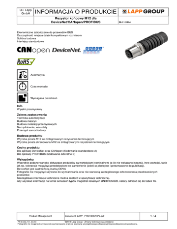 U.I. Lapp GmbH INFORMACJA O PRODUKCIE Rezystor końcowy M12 dla DeviceNet/CANopen/PROFIBUS 26.11.2014 Ekonomiczne zakończenie do przewodów BUS Oszczędność miejsca dzięki kompaktowym rozmiarom Solidna budowa Interfejsy standardowe Automatyka Czas montażu Wymagana przestrzeń Info W pełni przemysłowy Zakres zastosowania Technika automatyzacji Budowa maszyn Budowa instalacji przemysłowych Narzędziownie, warsztaty Przemysł samochodowy Budowa produktu Wtyczka prosta M12 ze zintegrowanym rezystorem terminującym Wtyczka prosta ekranowana M12 ze zintegrowanym rezystorem terminującym Cechy produktu Dla aplikacji DeviceNet oraz CANopen (Kodowanie standardowe A) Dla aplikacji PROFIBUS (kodowania odwrotne B) Wskazówka Wszystkie podane wartości dotyczące produktów są wartościami nominalnymi (o ile nie wskazano inaczej). Inne wartości, takie jak np. tolerancje mogą być przedstawione na zamówienie (jeżeli są dostępne i przeznaczone do publikacji). DeviceNet jest zastrzeżoną marką ODVA Fotografie nie mogą być używane do wymiarowania oraz nie stanowią szczegółowego odwzorowania przedstawionych produktów. Szczegółowe informacje techniczne można znaleźć w specyfikacji technicznej. Aby uzyskać informacje na temat oznaczeń typów magistrali lokalnych UNITRONIC®, należy odnieść się do tabeli T6. Product Management Dokument: LAPP_PRO149574PL.pdf ©2012 Lapp Group - Zmiany techniczne zastrzeżone PN 0486/01_03.10 Fotografie nie mogą być używane do wymiarowania oraz nie stanowią szczegółowego odwzorowania przedstawionych produktów. 1/4 U.I. Lapp GmbH INFORMACJA O PRODUKCIE Rezystor końcowy M12 dla DeviceNet/CANopen/PROFIBUS Dane techniczne 26.11.2014 Kodowanie: B - odwrotnie (PROFIBUS) A - CANopen/DeviceNet Materiał styku: CuSn Stopień ochrony: IP65/IP67/IP69K IP 67 (wersja ekranowana) Temperatura otoczenia (w trakcie pracy): od -25°C do +90°C (wersja nieekranowana) od -40°C do +85°C (wersja ekranowana) Product Management Dokument: LAPP_PRO149574PL.pdf ©2012 Lapp Group - Zmiany techniczne zastrzeżone PN 0486/01_03.10 Fotografie nie mogą być używane do wymiarowania oraz nie stanowią szczegółowego odwzorowania przedstawionych produktów. 2/4 Powered by TCPDF (www.tcpdf.org) Napięcie nominalne UN [V] Kodowanie Liczba styków Jednostka dostawy (PU) 22260722 AB-C4-M12MS-PB-TR 4 60 B - odwrotnie 4 5 32 B - odwrotnie 4 1 60 A-Standard 5 5 Dla aplikacji PROFIBUS (kodowanie odwrotne B, gniazdo, wersja ekranowana) 22261001 AB-C5-M12FS-PB-TRSH 4 Dla aplikacji DeviceNet oraz CANopen (Kodowanie standardowe A) AB-C5-M12MS-DN-TR 4 Dokument: LAPP_PRO149574PL.pdf Rezystor końcowy M12 dla DeviceNet/CANopen/PROFIBUS 22260766 INFORMACJA O PRODUKCIE Prąd nominalny IN [A] U.I. Lapp GmbH Oznaczenie wyrobu Dla aplikacji PROFIBUS (kodowania odwrotne B) Product Management 26.11.2014 ©2012 Lapp Group - Zmiany techniczne zastrzeżone PN 0486/01_03.10 Fotografie nie mogą być używane do wymiarowania oraz nie stanowią szczegółowego odwzorowania przedstawionych produktów. Numer artykułu 3/4 Powered by TCPDF (www.tcpdf.org) U.I. Lapp GmbH INFORMACJA O PRODUKCIE Rezystor końcowy M12 dla DeviceNet/CANopen/PROFIBUS Product Management 26.11.2014 Dokument: LAPP_PRO149574PL.pdf ©2012 Lapp Group - Zmiany techniczne zastrzeżone PN 0486/01_03.10 Fotografie nie mogą być używane do wymiarowania oraz nie stanowią szczegółowego odwzorowania przedstawionych produktów. 4/4