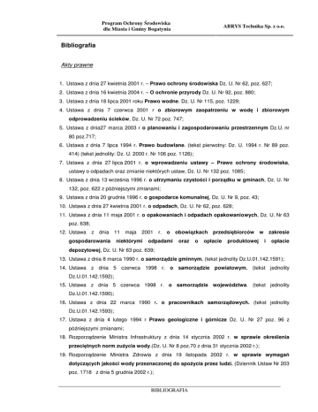 Program Ochrony Środowiska dla Miasta i Gminy Bogatynia ABRYS Technika Sp. z o.o. Bibliografia Akty prawne 1. Ustawa z dnia 27 kwietnia 2001 r. – Prawo ochrony środowiska Dz. U. Nr 62, poz. 627; 2. Ustawa z dnia 16 kwietnia 2004 r. – O ochronie przyrody Dz. U. Nr 92, poz. 880; 3. Ustawa z dnia 18 lipca 2001 roku Prawo wodne. Dz. U. Nr 115, poz. 1229; 4. Ustawa z dnia 7 czerwca 2001 r o zbiorowym zaopatrzeniu w wodę i zbiorowym odprowadzeniu ścieków, Dz. U. Nr 72 poz. 747; 5. Ustawa z dnia27 marca 2003 r o planowaniu i zagospodarowaniu przestrzennym Dz.U. nr 80 poz.717; 6. Ustawa z dnia 7 lipca 1994 r. Prawo budowlane. (tekst pierwotny: Dz. U. 1994 r. Nr 89 poz. 414) (tekst jednolity: Dz. U. 2000 r. Nr 106 poz. 1126); 7. Ustawa z dnia 27 lipca 2001 r. o wprowadzeniu ustawy – Prawo ochrony środowiska, ustawy o odpadach oraz zmianie niektórych ustaw, Dz. U. Nr 132 poz. 1085; 8. Ustawa z dnia 13 września 1996 r. o utrzymaniu czystości i porządku w gminach, Dz. U. Nr 132, poz. 622 z późniejszymi zmianami; 9. Ustawa z dnia 20 grudnia 1996 r. o gospodarce komunalnej, Dz. U. Nr 9, poz. 43; 10. Ustawa z dnia 27 kwietnia 2001 r. o odpadach, Dz. U. Nr 62, poz. 628; 11. Ustawa z dnia 11 maja 2001 r. o opakowaniach i odpadach opakowaniowych, Dz. U. Nr 63 poz. 638; 12. Ustawa z dnia 11 maja 2001 r. o obowiązkach przedsiębiorców gospodarowania niektórymi odpadami oraz o opłacie w produktowej zakresie i opłacie depozytowej, Dz. U. Nr 63 poz. 639; 13. Ustawa z dnia 8 marca 1990 r. o samorządzie gminnym. (tekst jednolity Dz.U.01.142.1591); 14. Ustawa z dnia 5 czerwca 1998 r. o samorządzie powiatowym. (tekst jednolity Dz.U.01.142.1592); 15. Ustawa z dnia 5 czerwca 1998 r. o samorządzie województwa. (tekst jednolity Dz.U.01.142.1590); 16. Ustawa z dnia 22 marca 1990 r. o pracownikach samorządowych. (tekst jednolity Dz.U.01.142.1593); 17. Ustawa z dnia 4 lutego 1994 r Prawo geologiczne i górnicze Dz. U. Nr 27 poz. 96 z późniejszymi zmianami; 18. Rozporządzenie Ministra Infrastruktury z dnia 14 stycznia 2002 r. w sprawie określenia przeciętnych norm zużycia wody.(Dz. U. Nr 8 poz.70 z dnia 31 stycznia 2002 r.); 19. Rozporządzenie Ministra Zdrowia z dnia 19 listopada 2002 r. w sprawie wymagań dotyczących jakości wody przeznaczonej do spożycia przez ludzi. (Dziennik Ustaw Nr 203 poz. 1718 z dnia 5 grudnia 2002 r.); BIBLIOGRAFIA Program Ochrony Środowiska dla Miasta i Gminy Bogatynia ABRYS Technika Sp. z o.o. 20. Rozporządzenie Ministra Zdrowia z dnia 16 października 2002 r. w sprawie wymagań, jakim powinna odpowiadać woda w kąpieliskach. (Dz. U. Nr 183 poz. 1530); 21. Rozporządzenie Ministra Środowiska z dnia 29 listopada 2002 r. w sprawie warunków, jakie należy spełnić przy wprowadzaniu ścieków do wód lub do ziemi oraz w sprawie substancji szczególnie szkodliwych dla środowiska wodnego. (Dz. U. Nr 212 poz.1799 z dnia 16 grudnia 2002 r.); 22. Rozporządzenie Ministra Infrastruktury z dnia 20 lipca 2002 r. w sprawie sposobu realizacji obowiązków dostawców ścieków przemysłowych oraz warunków wprowadzania ścieków do urządzeń kanalizacyjnych. (Dz. U. Nr 129. poz. 1108 z dnia 14 sierpnia 2002 r.); 23. Rozporządzenie Ministra Infrastruktury z dnia 17 października 2002 r. w sprawie warunków wprowadzania nieczystości ciekłych do stacji zlewnych. (Dz. U. z dnia 14 listopada 2002 r.) Dz.U.02.188. poz. 1576; 24. Rozporządzenie Ministra Infrastruktury z dnia 12 listopada 2002 r. w sprawie wymagań dla pojazdów asenizacyjnych. (Dz. U. Nr 193 poz.1617 z dnia 22 listopada 2002 r.); 25. Rozporządzenie Rady Ministrów z dnia 9 listopada 2004 r. w sprawie określenia rodzajów przedsięwzięć mogących znacząco oddziaływać na środowisko oraz szczegółowych kryteriów związanych z kwalifikowaniem przedsięwzięć do sporządzenia raportu oddziaływania na środowisko, Dz. U. Nr 257, poz. 2573; 26. Rozporządzenie Ministra Środowiska z dnia 27 września 2001 r. w sprawie katalogu odpadów, Dz. U. Nr 112, poz. 1206; 27. Rozporządzenie Rady Ministrów z dnia 21 października 1998 r. w sprawie szczegółowych zasad usuwania, wykorzystywania i unieszkodliwiania odpadów niebezpiecznych, Dz. U. Nr 145 poz. 942. z późniejszymi zmianami; 28. Rozporządzenie Ministra Środowiska z dnia 1 sierpnia 2002 r, w sprawie komunalnych osadów ściekowych, Dz. U. Nr 134 poz. 1140; 29. Rozporządzenie Ministra Środowiska z dnia 5 lipca 2002 r. w sprawie szczegółowych wymagań, jakim powinny odpowiadać programy ochrony powietrza. (Dz.U. 2002. Nr 115 poz.1003 z dnia 24 lipca 2002 r.); 30. Rozporządzenie Rady Ministrów z dnia 18 grudnia 2001 r. zmieniające rozporządzenie w sprawie opłat za korzystanie ze środowiska, Dz. U. Nr 151 poz. 1703; 31. Rozporządzenie Ministra Rolnictwa i Rozwoju Wsi z dnia 21 marca 2002 r, w sprawie dopuszczalnych stężeń metali ciężkich zanieczyszczających glebę, Dz. U. Nr 37 poz. 344; 32. Rozporządzenie Ministra Środowiska z dnia 21 lipca 2004 r. w sprawie obszarów specjalnej ochrony ptaków NATURA 2000, (Dz.U. Nr 229, poz. 2313); 33. Rozporządzenie Ministra Środowiska z dnia 9 lipca 2004 r. w sprawie gatunków dziko występujących grzybów objętych ochroną Dz.U. Nr 168, poz. 1765; BIBLIOGRAFIA Program Ochrony Środowiska dla Miasta i Gminy Bogatynia ABRYS Technika Sp. z o.o. 34. Rozporządzenie Ministra Środowiska z dnia 14 sierpnia 2001 r, w sprawie określenia rodzajów siedlisk przyrodniczych podlegających ochronie, Dz. U. Nr 92 poz. 1029; 35. Rozporządzenie Ministra Środowiska z dnia 11 września 2001 r, w sprawie listy gatunków roślin rodzimych dziko występujących objętych ochroną gatunkową ścisłą częściową oraz zakazów właściwych dla tych gatunków i odstępstw od tych zakazów, Dz. U. Nr 106 poz. 1167; 36. Rozporządzenie Ministra Środowiska w sprawie szczegółowych wymagań, jakim powinny odpowiadać programy działań mających na celu ograniczenie odpływu azotu ze źródeł rolnicz