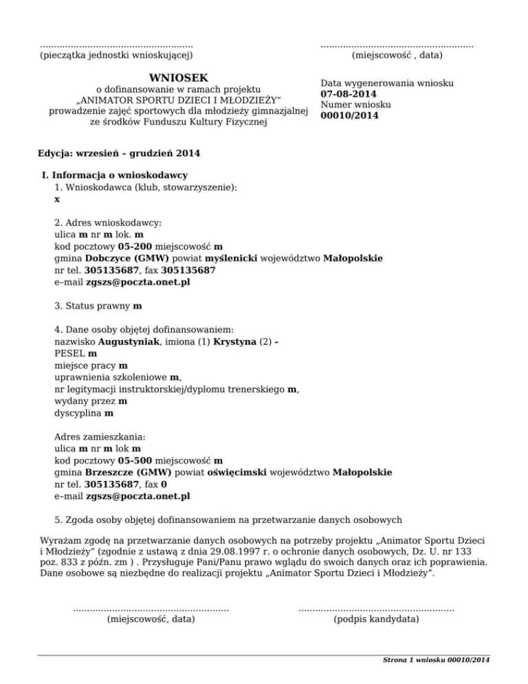 ....................................................... (pieczątka jednostki wnioskującej) ....................................................... (miejscowość , data) WNIOSEK o dofinansowanie w ramach projektu „ANIMATOR SPORTU DZIECI I MŁODZIEŻY” prowadzenie zajęć sportowych dla młodzieży gimnazjalnej ze środków Funduszu Kultury Fizycznej Data wygenerowania wniosku 07-08-2014 Numer wniosku 00010/2014 Edycja: wrzesień – grudzień 2014 I. Informacja o wnioskodawcy 1. Wnioskodawca (klub, stowarzyszenie): x 2. Adres wnioskodawcy: ulica m nr m lok. m kod pocztowy 05-200 miejscowość m gmina Dobczyce (GMW) powiat myślenicki województwo Małopolskie nr tel. 305135687, fax 305135687 e–mail [email protected] 3. Status prawny m 4. Dane osoby objętej dofinansowaniem: nazwisko Augustyniak, imiona (1) Krystyna (2) PESEL m miejsce pracy m uprawnienia szkoleniowe m, nr legitymacji instruktorskiej/dyplomu trenerskiego m, wydany przez m dyscyplina m Adres zamieszkania: ulica m nr m lok m kod pocztowy 05-500 miejscowość m gmina Brzeszcze (GMW) powiat oświęcimski województwo Małopolskie nr tel. 305135687, fax 0 e–mail [email protected] 5. Zgoda osoby objętej dofinansowaniem na przetwarzanie danych osobowych Wyrażam zgodę na przetwarzanie danych osobowych na potrzeby projektu „Animator Sportu Dzieci i Młodzieży” (zgodnie z ustawą z dnia 29.08.1997 r. o ochronie danych osobowych, Dz. U. nr 133 poz. 833 z późn. zm ) . Przysługuje Pani/Panu prawo wglądu do swoich danych oraz ich poprawienia. Dane osobowe są niezbędne do realizacji projektu „Animator Sportu Dzieci i Młodzieży”. ........................................................ (miejscowość, data) ........................................................ (podpis kandydata) Strona 1 wniosku 00010/2014 I. Uzasadnienie wniosku o dofinansowanie m ................................................ (podpis osoby uzasadniającej) II. Opinia właściwego samorządu terytorialnego ............................................................................................................................................................ ............................................................................................................................................................ ............................................................................................................................................................ ............................................................................................................................................................ ............................................................................................................................................................ ......................................................................... (pieczęć i podpis przedstawiciela samorządu) III. Oświadczenie o zapewnieniu środków w wysokości nie mniejszej niż dotacja ze środków Ministerstwa Sportu i Turystyki; (350 zł brutto x 4 miesiące = 1400 zł brutto); Wskazana kwota: 2000 zł brutto W związku z ubieganiem się Pana/i Augustyniak Krystyna o przyznanie dofinansowania ze środków Ministerstwa Sportu i Turystyki w ramach projektu pn. "ANIMATOR SPORTU DZIECI I MŁODZIEŻY" zobowiązuję się do zabezpieczenia środków finansowych niezbędnych do zapewnienia wymaganego wkładu własnego w wysokości nie mniejszej niż kwoty wskazanej w Dz. III ......................................................................... (pieczęć i podpis osoby-instytucji zapewniającej wynagrodzenie) Strona 2 wniosku 00010/2014 Osoby upoważnione do reprezentowania wnioskodawcy Imię i Nazwisko Funkcja / Stanowisko Pieczęć i podpis ............................................................................................................................................................ Wypełnia Komisja Wojewódzka Opinia o kandydacie: ............................................................................................................................................................ ............................................................................................................................................................ ............................................................................................................................................................ ............................................................................................................................................................ ............................................................................................................................................................ Kwalifikacja do programu TAK NIE Podpisy komisji: ................................................................................................ ................................................................................................ ................................................................................................ ................................................................................................ ................................................................................................ ................................................................................................ ................................................................................................ Strona 3 wniosku 00010/2014 Augustyniak Krystyna 05-500 m mm/m Oświadczenie Ja niżej podpisany oświadczam, że w trakcie realizacji Projektu ,,Animator Sportu Dzieci i Młodzieży” w 2014 roku nie będę otrzymywał innego wynagrodzenia za pracę - szkolenie sportowe, pochodzącego bezpośrednio lub pośrednio ze środków Ministerstwa Sportu i Turystyki. Jednocześnie zobowiązuję się do niezwłocznego powiadomienia o wszelkich zmianach wojewódzki Szkolny Związek Sportowy w ....................................