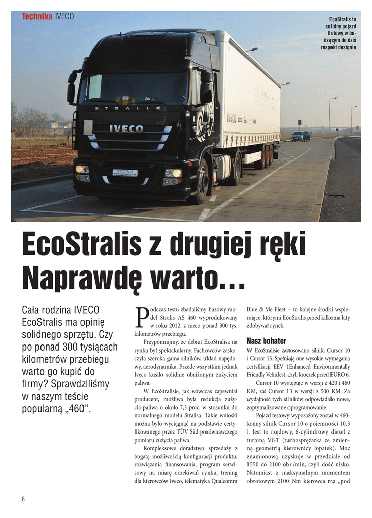 Technika IVECO EcoStralis to solidny pojazd flotowy w budzącym do dziś respekt designie EcoStralis z drugiej ręki Naprawdę warto… Cała rodzina IVECO EcoStralis ma opinię solidnego sprzętu. Czy po ponad 300 tysiącach kilometrów przebiegu warto go kupić do firmy? Sprawdziliśmy w naszym teście popularną „460”. P odczas testu zbadaliśmy bazowy model Stralis AS 460 wyprodukowany w roku 2012, z nieco ponad 300 tys. kilometrów przebiegu. Przypomnijmy, że debiut EcoStralisa na rynku był spektakularny. Fachowców zaskoczyła szeroka gama silników, układ napędowy, aerodynamika. Przede wszystkim jednak Iveco kusiło solidnie obniżonym zużyciem paliwa. W EcoStralisie, jak wówczas zapewniał producent, możliwa była redukcja zużycia paliwa o około 7,3 proc. w stosunku do normalnego modelu Stralisa. Takie wnioski można było wyciągnąć na podstawie certyfikowanego przez TÜV Süd porównawczego pomiaru zużycia paliwa. Kompleksowe doradztwo sprzedaży z bogatą możliwością konfiguracji produktu, rozwiązania finansowania, program serwisowy na miarę oczekiwań rynku, trening dla kierowców Iveco, telematyka Qualcomm Blue & Me Fleet – to kolejne środki wspierające, którymi EcoStralis przed kilkoma laty zdobywał rynek. Nasz bohater W EcoStralisie zastosowano silniki Cursor 10 i Cursor 13. Spełniają one wysokie wymagania certyfikacji EEV (Enhanced Environmentally Friendly Vehicles), czyli kroczek przed EURO 6. Cursor 10 występuje w wersji z 420 i 460 KM, zaś Cursor 13 w wersji z 500 KM. Za wydajność tych silników odpowiadało nowe, zoptymalizowane oprogramowanie. Pojazd testowy wyposażony został w 460konny silnik Cursor 10 o pojemności 10,3 l. Jest to rzędowy, 6-cylindrowy diesel z turbiną VGT (turbosprężarka ze zmienną geometrią kierownicy łopatek). Moc znamionową uzyskuje w przedziale od 1550 do 2100 obr./min, czyli dość nisko. Natomiast z maksymalnym momentem obrotowym 2100 Nm kierowca ma „pod IVECO ECOSTRALIS 460 nogą” w niskim zakresie obrotów od 1050 do 1550 obr./min. Dla 40-tonowego zestawu z ciągnikiem EcoStralis 460 stosunek mocy wynosi 11,5 KM/t, a maksymalny poziom momentu obrotowego 52,5 Nm/t. EcoStralis to solidny pojazd flotowy w budzącym do dziś respekt, lecz nieco opatrzonym designie. Respektu dodaje też malowanie kabiny testowej „używki”, z elementami graficznymi, przejętymi od nowozelandzkiej drużyny rugby „All Blacks”. Jednym słowem wytrzymałość, żywotność, dynamika i niezawodność. Testowy ciągnik był dobrze wyposażony. Na tzw. check liście był ECOFleet + skrzynia Eurotronic. Automatyczna, 12-biegowa skrzynia na bazie ZF AS Tronic to duży plus. Przekładnia cieszy się dobrą opinią wśród użytkowników i jest ważnym wsparciem całej koncepcji EcoStralis. Kierowca musi tylko dodawać gazu – w EcoStralisie funkcję sprzęgła, przełączanie i wybór biegów przy optymalnych obrotach przejmuje ECOFleet + Eurotronic. Gdyby jednak za kierownicą pojawił się niepokój, to „kolega komputer” po prostu efektywnie zajmie się zarządzaniem przełożeniami za pomocą oprogramowania Ecoswitch, które aktywuje program iECO, dostrajający technikę przełączania biegów i moc silnika do masy pojazdu. ECOFleet natomiast czuwa nad zużyciem paliwa, optymalizuje wybór biegu i redukuje w ten sposób błędy kierowcy. Czy mniej zużywa? Zachowanie pojazdu sprawdziliśmy podczas jazdy na autostradzie i po drogach lokalnych. Od razu nasuwa się pierwsze spostrzeżenie – ograniczenie prędkości w EcoStralisie do 85 km/h powoduje wyraźną redukcję zużycia paliwa. Po przekroczeniu tej granicy, za sprawą rosnącego do kwadratu oporu powietrza, znacząco wzrasta apetyt na paliwo. A przy tym korzyści czasowe są na tyle nieistotne, że nie można ich brać pod uwagę przy kalkulowaniu rachunku zysku i strat. Jak podaje Iveco, pomiędzy 85 a 90 km/h wystarczy redukcja prędkości o 2 km/ h, żeby zaoszczędzić 2 procent paliwa. EcoStralisowi trudno jest zejść poniżej magicznej granicy 30 litrów oleju napędowego na 100 km. Takie zużycie osiągają pojazdy wyposażone w silniki Euro 6. Trzeba jednak pamiętać, że w 2012 roku EcoStralis podczas testu ETC zdobył tytuł ,,Mistrza oszczędności”. Dlatego wynik nieznacznie powyżej 30 litrów również i dziś należy uznać za przyzwoity. W kwestii kosztów trzeba doliczyć zużycie AdBlue, ale do tego przez lata użytkownik zdążył się już przyzwyczaić. Do oszczędności przyczyni się na pewno aerodynamiczny szlif. Chodzi o spoilery kabiny oraz osłony boczne. Bez zmniejszenia oporów powietrza nie można osiągnąć wyraźnych oszczędności. Wrażenia z jazdy używanym EcoStralisem nie odbiegają od tych, jakich dostarczają nowe pojazdy włoskiego producenta. Kierowcę od razu ujmie łatwość, z jaką wejdzie do kabiny EcoStralisa. Pojazd znany jest z wzorcowej wręcz ergonomii – wszystkie elementy służące bezpośrednio prowadzeniu pojazdu znajdują się na wyciągnięcie ręki, w kokpicie umieszczono w sposób bardzo czytelny „zegary”. Łatwo przechodzi się przez tunel silnika na stronę pasażera. Kierowca doceni też wystarczającą liczbę głębokich schowków i bardzo wygodną leżankę. EcoStralis prowadzi się bardzo bezpiecznie, układ kierowniczy chodzi bardzo lekko, co w połączeniu z elastycznością jednostki napędowej i odpowiednim doborem przełożeń powoduje, że jazda jest bardzo harmonijna. Komfortowo dostrojone zawieszenie wpływa dodatkowo na wysoką stabilność jazdy. Pojazd znany jest z wzorcowej wręcz ergonomii – wszystkie elementy służące bezpośrednio prowadzeniu pojazdu znajdują się na wyciągnięcie ręki Ciągnik siodłowy 4x2 z kabiną dalekobieżną AS dla zestawu długości 16,5 m, szerokości 2,55 m i wysokości 4,0 m, z naczepą skrzyniową i 40 t masy całkowitej oraz aerodynamicznym wyposażeniem specjalnym. Długość: 6,25 m; szerokość: 2,55 m; wysokość (dach ka