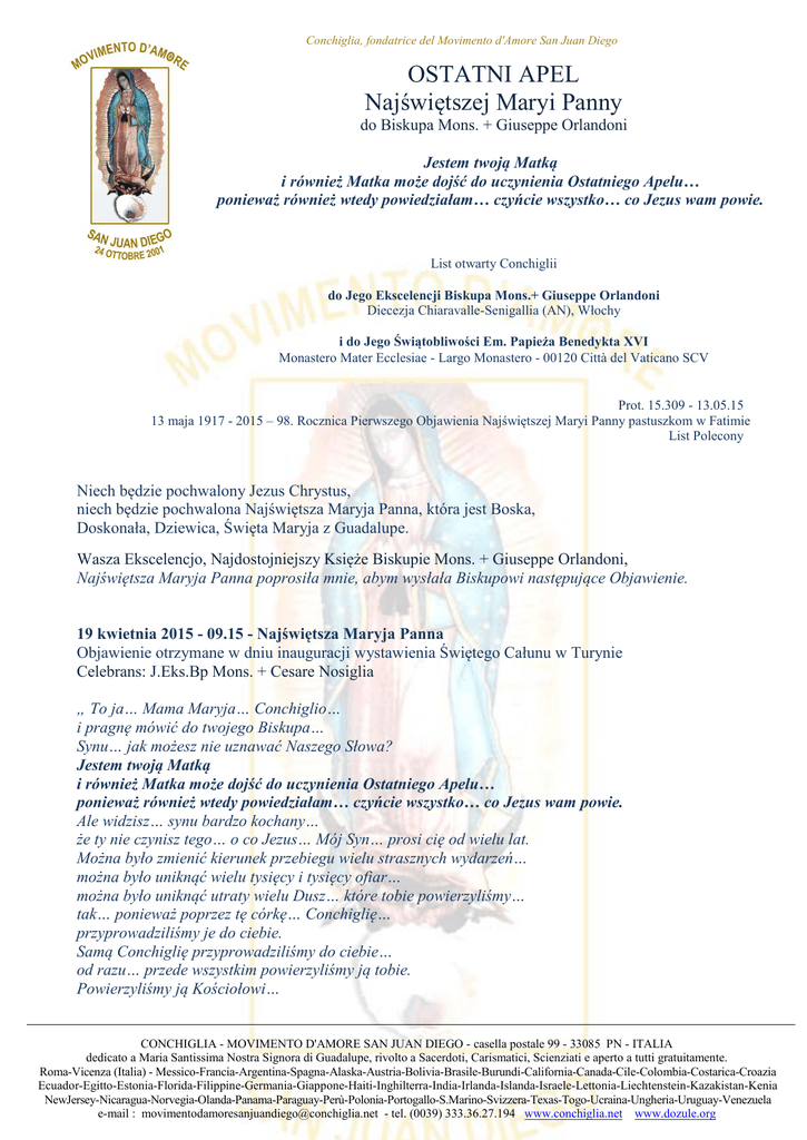 Conchiglia, fondatrice del Movimento d'Amore San Juan Diego OSTATNI APEL Najświętszej Maryi Panny do Biskupa Mons. + Giuseppe Orlandoni Jestem twoją Matką i również Matka może dojść do uczynienia Ostatniego Apelu… ponieważ również wtedy powiedziałam… czyńcie wszystko… co Jezus wam powie. List otwarty Conchiglii do Jego Ekscelencji Biskupa Mons.+ Giuseppe Orlandoni Diecezja Chiaravalle-Senigallia (AN), Włochy i do Jego Świątobliwości Em. Papieża Benedykta XVI Monastero Mater Ecclesiae - Largo Monastero - 00120 Città del Vaticano SCV Prot. 15.309 - 13.05.15 13 maja 1917 - 2015 – 98. Rocznica Pierwszego Objawienia Najświętszej Maryi Panny pastuszkom w Fatimie List Polecony Niech będzie pochwalony Jezus Chrystus, niech będzie pochwalona Najświętsza Maryja Panna, która jest Boska, Doskonała, Dziewica, Święta Maryja z Guadalupe. Wasza Ekscelencjo, Najdostojniejszy Księże Biskupie Mons. + Giuseppe Orlandoni, Najświętsza Maryja Panna poprosiła mnie, abym wysłała Biskupowi następujące Objawienie. 19 kwietnia 2015 - 09.15 - Najświętsza Maryja Panna Objawienie otrzymane w dniu inauguracji wystawienia Świętego Całunu w Turynie Celebrans: J.Eks.Bp Mons. + Cesare Nosiglia „ To ja… Mama Maryja… Conchiglio… i pragnę mówić do twojego Biskupa… Synu… jak możesz nie uznawać Naszego Słowa? Jestem twoją Matką i również Matka może dojść do uczynienia Ostatniego Apelu… ponieważ również wtedy powiedziałam… czyńcie wszystko… co Jezus wam powie. Ale widzisz… synu bardzo kochany… że ty nie czynisz tego… o co Jezus… Mój Syn… prosi cię od wielu lat. Można było zmienić kierunek przebiegu wielu strasznych wydarzeń… można było uniknąć wielu tysięcy i tysięcy ofiar… można było uniknąć utraty wielu Dusz… które tobie powierzyliśmy… tak… ponieważ poprzez tę córkę… Conchiglię… przyprowadziliśmy je do ciebie. Samą Conchiglię przyprowadziliśmy do ciebie… od razu… przede wszystkim powierzyliśmy ją tobie. Powierzyliśmy ją Kościołowi… CONCHIGLIA - MOVIMENTO D'AMORE SAN JUAN DIEGO - casella postale 99 - 33085 PN - ITALIA dedicato a Maria Santissima Nostra Signora di Guadalupe, rivolto a Sacerdoti, Carismatici, Scienziati e aperto a tutti gratuitamente. Roma-Vicenza (Italia) - Messico-Francia-Argentina-Spagna-Alaska-Austria-Bolivia-Brasile-Burundi-California-Canada-Cile-Colombia-Costarica-Croazia Ecuador-Egitto-Estonia-Florida-Filippine-Germania-Giappone-Haiti-Inghilterra-India-Irlanda-Islanda-Israele-Lettonia-Liechtenstein-Kazakistan-Kenia NewJersey-Nicaragua-Norvegia-Olanda-Panama-Paraguay-Perù-Polonia-Portogallo-S.Marino-Svizzera-Texas-Togo-Ucraina-Ungheria-Uruguay-Venezuela e-mail : [email protected] - tel. (0039) 333.36.27.194 www.conchiglia.net www.dozule.org który… macierzyński… powinien był przynajmniej wysłuchać jej. Natomiast nie tylko nie wysłuchaliście jej… ale znieważyliście ją… wzgardziliście nią… oszkalowaliście ją i oczerniliście ją. Streszczając… rzeczywiście zabiliście ją… a później zignorowaliście ją… ponieważ zabiliście Słowo… które wam dawała i nadal wam daje… Słowo Trójcy Przenajświętszej. Czy ja… Maryja… w szatach Naszej Pani z Guadalupe muszę przypominać Kościołowi… że z Woli Ojca Jestem wybrana… aby zmiażdżyć szatana? Czy muszę przypominać Kościołowi… że za Moim pośrednictwem dociera się do Mojego Syna Jezusa oraz wygrywa się wiele walk i wojen? Cóż… to jest Ostateczna Walka! Z tego powodu ruch Movimento d'Amore San Juan Diego… który reprezentuje Mój Płaszcz… ochroni tych… którzy uwierzyli we Mnie i Jezusa… Mojego Syna… który jest Bogiem… i który Żyje i Króluje Teraz oraz który Żyje i Króluje w sercu dzieci Bożych.” _____________________ wyjęte z: OBJAWIENIA danego Conchiglii Bentornato Mio Signore « Il Grande Libro della Vita » Witaj, Mój Panie « Wielka Księga Żywota » Nowy Testament Trzeciego Tysiąclecia Część Pierwsza © Copyright - LA RIVELAZIONE - Conchiglia della Santissima Trinità BENTORNATO MIO SIGNORE - Il Grande Libro della Vita 2 CONCHIGLIA - MOVIMENTO D'AMORE SAN JUAN DIEGO - casella postale 99 - 33085 PN - ITALIA dedicato a Maria Santissima Nostra Signora di Guadalupe, rivolto a Sacerdoti, Carismatici, Scienziati e aperto a tutti gratuitamente. Roma-Vicenza (Italia) - Messico-Francia-Argentina-Spagna-Alaska-Austria-Bolivia-Brasile-Burundi-California-Canada-Cile-Colombia-Costarica-Croazia Ecuador-Egitto-Estonia-Florida-Filippine-Germania-Giappone-Haiti-Inghilterra-India-Irlanda-Islanda-Israele-Lettonia-Liechtenstein-Kazakistan-Kenia NewJersey-Nicaragua-Norvegia-Olanda-Panama-Paraguay-Perù-Polonia-Portogallo-S.Marino-Svizzera-Texas-Togo-Ucraina-Ungheria-Uruguay-Venezuela e-mail : [email protected] - tel. (0039) 333.36.27.194 www.conchiglia.net www.dozule.org Wasza Ekscelencjo, Najdostojniejszy Księże Biskupie Mons. + Giuseppe Orlandoni, modlę się za Biskupa i pozostaję w pełnym szacunku posłuszeństwie Kościołowi, Jednemu, Świętemu, Katolickiemu, Apostolskiemu i Rzymskiemu tylko zgodnie z nauczaniem Jezusa, Syna Bożego, który sam jest Bogiem, w Świętej Ewangelii Niech Bóg Biskupa błogosławi i Boska Maryja, Nasza Pani z Guadalupe, Doskonała, niech ochrania Biskupa oraz niech ochrania cały świat w Imię Ojca Matki Syna i Ducha Świętego. Amen. Conchiglia della Santissima Trinità 3 CONCHIGLIA - MOVIMENTO D'AMORE SAN JUAN DIEGO - casella postale 99 - 33085 PN - ITALIA dedicato a Maria Santissima Nostra Signora di Guadalupe, rivolto a Sacerdoti, Carismatici, Scienziati e aperto a tutti gratuitamente. Roma-Vicenza (Italia) - Messico-Francia-Argentina-Spagna-Alaska-Austria-Bolivia-Brasile-Burundi-California-Canada-Cile-Colombia-Costarica-Croazia Ecuador-Egitto-Estonia-Florida-Filippine-Germania-Giappone-Haiti-Inghilterra-India-Irlanda-Islanda-Israele-Lettonia-Liechtenstein-Kazakistan-Kenia NewJersey-Nicaragua-