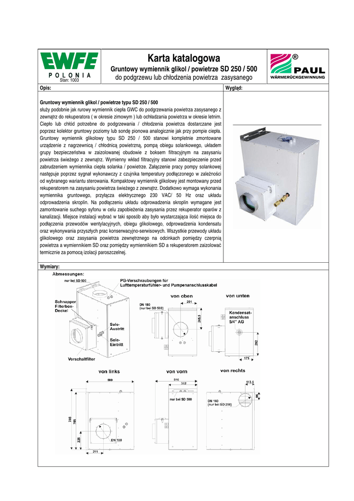 Karta katalogowa Stan: 1003 Gruntowy wymiennik glikol / powietrze SD 250 / 500 do podgrzewu lub chłodzenia powietrza zasysanego Opis: Gruntowy wymiennik glikol / powietrze typu SD 250 / 500 służy podobnie jak rurowy wymiennik ciepła GWC do podgrzewania powietrza zasysanego z zewnątrz do rekuperatora ( w okresie zimowym ) lub ochładzania powietrza w okresie letnim. Ciepło lub chłód potrzebne do podgrzewania / chłodzenia powietrza dostarczane jest poprzez kolektor gruntowy poziomy lub sondę pionowa analogicznie jak przy pompie ciepła. Gruntowy wymiennik glikolowy typu SD 250 / 500 stanowi kompletnie zmontowane urządzenie z nagrzewnicą / chłodnicą powietrzną, pompą obiegu solankowego, układem grupy bezpieczeństwa w zaizolowanej obudowie z boksem filtracyjnym na zasysaniu powietrza świeżego z zewnątrz. Wymienny wkład filtracyjny stanowi zabezpieczenie przed zabrudzeniem wymiennika ciepła solanka / powietrze. Załączenie pracy pompy solankowej następuje poprzez sygnał wykonawczy z czujnika temperatury podłączonego w zależności od wybranego wariantu sterowania. Kompaktowy wymiennik glikolowy jest montowany przed rekuperatorem na zasysaniu powietrza świeżego z zewnątrz. Dodatkowo wymaga wykonania wymiennika gruntowego, przyłącza elektrycznego 230 VAC/ 50 Hz oraz układu odprowadzenia skroplin. Na podłączeniu układu odprowadzenia skroplin wymagane jest zamontowanie suchego syfonu w celu zapobieżenia zasysania przez rekuperator oparów z kanalizacji. Miejsce instalacji wybrać w taki sposób aby było wystarczająca ilość miejsca do podłączenia przewodów wentylacyjnych, obiegu glikolowego, odprowadzenia kondensatu oraz wykonywania przyszłych prac konserwacyjno-serwisowych. Wszystkie przewody układu glikolowego oraz zasysania powietrza zewnętrznego na odcinkach pomiędzy czerpnią powietrza a wymiennikiem SD oraz pomiędzy wymiennikiem SD a rekuperatorem zaizolować termicznie za pomocą izolacji paroszczelnej. Wymiary: Wygląd: Schemat : przejście przez przegrodę zewnętrzną Budowa i rozmieszczenie podzespołów Sterowanie : Sterowanie pompą obiegu glikolowego może być realizowane w kilku wariantach w zależności od wyboru rekuperatora i jego typu sterowania : a) poprzez automatykę rekuperatora w przypadku rekuperatorów PAUL z wariantem sterowania pełnej automatyki ( sterowanie automatyczne) : multi 150 DC, climos 150 DC, campus 500 ( wymagane zastosowanie przekaźnika do sygnału wyjściowego na załączanie lub wyłączania pompy glikolowej 230V/0,5A) Konieczne jest fabryczne ustawienie parametrów pracy : Stan pracy pompy włączona wyłączona b) Funkcja ( temperatura powietrza zasysanego) Podgrzewanie Chłodzenie T < 0°C T > 25°C T > 2°C T < 23°C za pomocą samodzielnego sterowania – uniwersalnego termostatu z czujnikiem temperatury – pozostałe rekuperatory Dane techniczne: Typ urządzenia Wymiary obudowy : szer. x wys. x głęb. : Moc wymiennika : Maksymalna wydajność powietrza : Przepływ czynnika ( po stronie glikolu) : Straty ciśnienia przy max wydajności ( powietrze) : Straty ciśnienia przy wymaganym przepływie (po stronie glikolu) : Przyłącze po stronie obiegu glikolowego ( złączka konusowa) : Przyłącze – powietrze zasysane ( wejście ) : Przyłącze – powietrze zasysane ( wyjście ) : Podłączenie odprowadzenia kondensatu : Rodzaj filtra na zasysaniu świeżego powietrza : Ciężar ( bez glikolu) Przyłącze elektryczne / obciążenie Kolektor ziemny dolnego źródła ciepła ( dane dla wilgotnego piasku) : Zalecany rodzaj rury : Długość obwodu : Długość sond - głębinowe pionowe 40 x 3,7 Rodzaj izolacji wewnętrznej : Odstęp w gruncie od instalacji wod-kan, deszczowej, fundamentów Ilość czynnika – solanki, glikol etylenowy – stężenie 30% SD 250 SD 500 352 x 705 x 569 mm 516 x 705 x 569 mm 1,2 kW 2,4 kW 250 m³/h 500 m³/h 0,25 m³/h 0,5 m³/h 30 kPa 120 kPa 25 kPa 28 kPa 22 mm 22 mm DN 180 DN 180 DN 160 DN 180 5/4” gwint zewnętrzny - wykonać z zasyfonowaniem G 4 + siatka zabezpieczająca przed insektami 38 kg 46 kg 220 VAC / 0,5A PE 20 x 16 mm PE 25 x 20,4 mm 60 m 120 m 20m 50 m paroszczelna np. Armaflex AF-D-025 min 1m 12 l 40 l Napełnienie układu : 1. Napełnić układ wodą poprzez zawory V1 i V3 przy zamkniętym V2 oraz otwartym V4, następnie dobrze odpowietrzyć. 2. Spiąć krótkim szlauchem zawory V1 i V3, następnie dodać glikol etylenowy w ilości podanej w tabeli. 3. Przy otwartych zaworach V1 i V3 i zamkniętym V2 za pomocą pompy cyrkulacyjnej dobrze wymieszać roztwór ( ok. 15 – 20 min). 4. Zamknąć zawór V3 a następnie poprzez zawór V1 dobić ciśnienie w układzie na wartość ok. 1,5 bar. 5. Ponownie przez ok. 30 minut wymieszać i odpowietrzyć układ przy otwartym zaworze V2 oraz zamkniętych V1 i V3, w razie potrzeby skorygować ciśnienie w układzie.