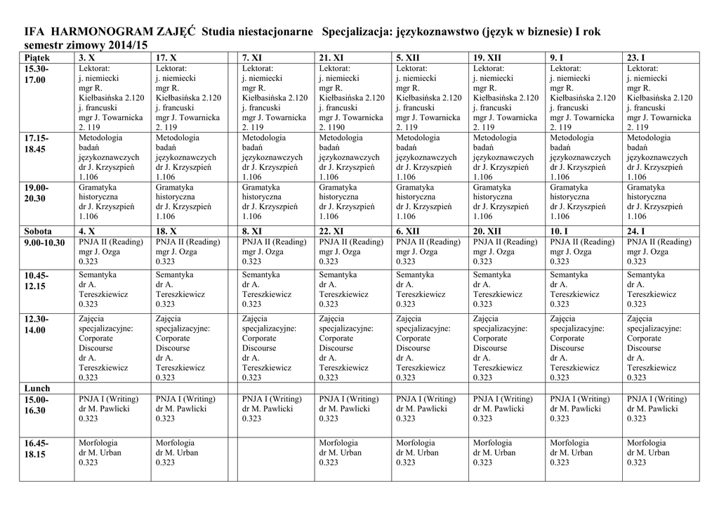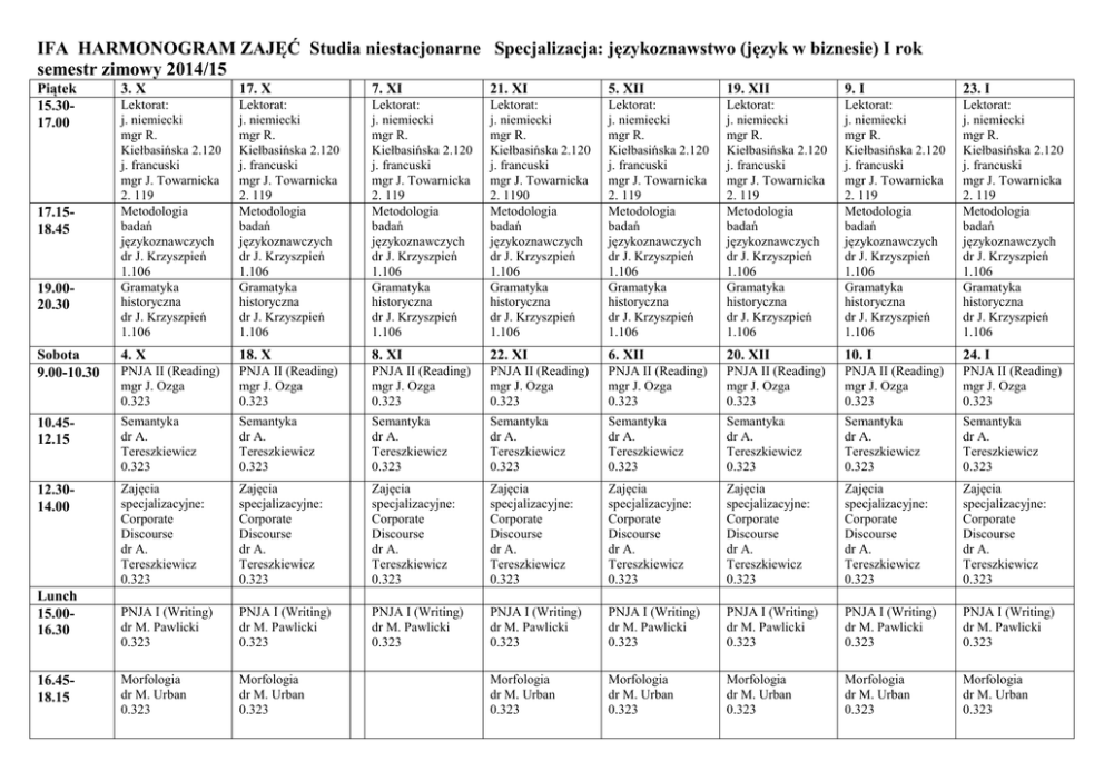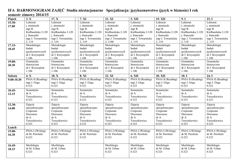 IFA HARMONOGRAM ZAJĘĆ Studia niestacjonarne Specjalizacja: językoznawstwo (język w biznesie) I rok semestr zimowy 2014/15 Piątek 15.3017.00 3. X 17. X 7. XI 21. XI 5. XII 19. XII 9. I 23. I Lektorat: j. niemiecki mgr R. Kiełbasińska 2.120 j. francuski mgr J. Towarnicka 2. 119 Metodologia badań językoznawczych dr J. Krzyszpień 1.106 Gramatyka historyczna dr J. Krzyszpień 1.106 Lektorat: j. niemiecki mgr R. Kiełbasińska 2.120 j. francuski mgr J. Towarnicka 2. 119 Metodologia badań językoznawczych dr J. Krzyszpień 1.106 Gramatyka historyczna dr J. Krzyszpień 1.106 Lektorat: j. niemiecki mgr R. Kiełbasińska 2.120 j. francuski mgr J. Towarnicka 2. 119 Metodologia badań językoznawczych dr J. Krzyszpień 1.106 Gramatyka historyczna dr J. Krzyszpień 1.106 Lektorat: j. niemiecki mgr R. Kiełbasińska 2.120 j. francuski mgr J. Towarnicka 2. 1190 Metodologia badań językoznawczych dr J. Krzyszpień 1.106 Gramatyka historyczna dr J. Krzyszpień 1.106 Lektorat: j. niemiecki mgr R. Kiełbasińska 2.120 j. francuski mgr J. Towarnicka 2. 119 Metodologia badań językoznawczych dr J. Krzyszpień 1.106 Gramatyka historyczna dr J. Krzyszpień 1.106 Lektorat: j. niemiecki mgr R. Kiełbasińska 2.120 j. francuski mgr J. Towarnicka 2. 119 Metodologia badań językoznawczych dr J. Krzyszpień 1.106 Gramatyka historyczna dr J. Krzyszpień 1.106 Lektorat: j. niemiecki mgr R. Kiełbasińska 2.120 j. francuski mgr J. Towarnicka 2. 119 Metodologia badań językoznawczych dr J. Krzyszpień 1.106 Gramatyka historyczna dr J. Krzyszpień 1.106 Lektorat: j. niemiecki mgr R. Kiełbasińska 2.120 j. francuski mgr J. Towarnicka 2. 119 Metodologia badań językoznawczych dr J. Krzyszpień 1.106 Gramatyka historyczna dr J. Krzyszpień 1.106 Sobota 9.00-10.30 4. X 18. X 8. XI 22. XI 6. XII 20. XII 10. I 24. I PNJA II (Reading) mgr J. Ozga 0.323 PNJA II (Reading) mgr J. Ozga 0.323 PNJA II (Reading) mgr J. Ozga 0.323 PNJA II (Reading) mgr J. Ozga 0.323 PNJA II (Reading) mgr J. Ozga 0.323 PNJA II (Reading) mgr J. Ozga 0.323 PNJA II (Reading) mgr J. Ozga 0.323 PNJA II (Reading) mgr J. Ozga 0.323 10.4512.15 Semantyka dr A. Tereszkiewicz 0.323 Semantyka dr A. Tereszkiewicz 0.323 Semantyka dr A. Tereszkiewicz 0.323 Semantyka dr A. Tereszkiewicz 0.323 Semantyka dr A. Tereszkiewicz 0.323 Semantyka dr A. Tereszkiewicz 0.323 Semantyka dr A. Tereszkiewicz 0.323 Semantyka dr A. Tereszkiewicz 0.323 12.3014.00 Zajęcia specjalizacyjne: Corporate Discourse dr A. Tereszkiewicz 0.323 Zajęcia specjalizacyjne: Corporate Discourse dr A. Tereszkiewicz 0.323 Zajęcia specjalizacyjne: Corporate Discourse dr A. Tereszkiewicz 0.323 Zajęcia specjalizacyjne: Corporate Discourse dr A. Tereszkiewicz 0.323 Zajęcia specjalizacyjne: Corporate Discourse dr A. Tereszkiewicz 0.323 Zajęcia specjalizacyjne: Corporate Discourse dr A. Tereszkiewicz 0.323 Zajęcia specjalizacyjne: Corporate Discourse dr A. Tereszkiewicz 0.323 Zajęcia specjalizacyjne: Corporate Discourse dr A. Tereszkiewicz 0.323 PNJA I (Writing) dr M. Pawlicki 0.323 PNJA I (Writing) dr M. Pawlicki 0.323 PNJA I (Writing) dr M. Pawlicki 0.323 PNJA I (Writing) dr M. Pawlicki 0.323 PNJA I (Writing) dr M. Pawlicki 0.323 PNJA I (Writing) dr M. Pawlicki 0.323 PNJA I (Writing) dr M. Pawlicki 0.323 PNJA I (Writing) dr M. Pawlicki 0.323 Morfologia dr M. Urban 0.323 Morfologia dr M. Urban 0.323 Morfologia dr M. Urban 0.323 Morfologia dr M. Urban 0.323 Morfologia dr M. Urban 0.323 Morfologia dr M. Urban 0.323 Morfologia dr M. Urban 0.323 17.1518.45 19.0020.30 Lunch 15.0016.30 16.4518.15 18.30.20.00 Składnia dr M. Urban 0.323 Składnia dr M. Urban 0.323 Niedziela 9.00-10.30 5. X 19. X Seminarium mgr dr M. Szczyrbak 0.323 Seminarium mgr dr M. Szczyrbak 0.323 10.4512.15 Public Speaking dr M. Szczyrbak 0.323 12.3014.00 Lunch 15.0016.30 16.4518.15 18.3020.00 Składnia dr M. Urban 0.323 Składnia dr M. Urban 0.323 Składnia dr M. Urban 0.323 Składnia dr M. Urban 0.323 Składnia dr M. Urban 0.323 9. XI 23. XI 7. XII 21. XII 11.I 25. I Seminarium mgr dr J. Świątek 0.323 Seminarium mgr dr J. Świątek 0.323 Seminarium mgr dr J. Świątek 0.323 Seminarium mgr dr M. Szczyrbak 0.323 Seminarium mgr dr J. Świątek 0.323 Seminarium mgr dr M. Szczyrbak 0.323 Public Speaking dr M. Szczyrbak 0.323 PNJA III (Integrated Skills) dr J. Świątek 0.323 PNJA III (Integrated Skills) dr J. Świątek 0.323 PNJA III (Integrated Skills) dr J. Świątek 0.323 Public Speaking dr M. Szczyrbak 0.323 PNJA III (Integrated Skills) dr J. Świątek 0.323 Public Speaking dr M. Szczyrbak 0.323 Introduction to Economics mgr K. Zakrzewski 0.323 Public Speaking dr M. Szczyrbak 0.323 Introduction to Economics mgr K. Zakrzewski 0.323 Introduction to Economics mgr K. Zakrzewski 0.323 Introduction to Economics mgr K. Zakrzewski 0.323 Public Speaking dr M. Szczyrbak 0.323 Introduction to Economics mgr K. Zakrzewski 0.323 Introduction to Economics mgr K. Zakrzewski 0.323 PNJA III (Integrated Skills) dr J. Świątek 0.323 Introduction to Economics mgr K. Zakrzewski 0.323 Introduction to Economics mgr K. Zakrzewski 0.323 Public Speaking dr M. Szczyrbak 0.323 Składnia dr M. Urban 0.323 PNJA III (Integrated Skills) dr J. Świątek 0.323 Public Speaking dr M. Szczyrbak 0.323 PNJA III (Integrated Skills) dr J. Świątek 0.323 Seminarium mgr dr J. Świątek 0.323 PNJA III (Integrated Skills) dr J. Świątek 0.323 Seminarium mgr dr M. Szczyrbak 0.323 Morfologia dr M. Urban 0.323 Seminarium mgr dr J. Świątek 0.323 Seminarium mgr dr M. Szczyrbak 0.323 Seminarium mgr dr J. Świątek 0.323 Seminarium mgr dr J. Świątek 0.323 Seminarium mgr dr M. Szczyrbak 0.323 Seminarium mgr dr M. Szczyrbak 0.323