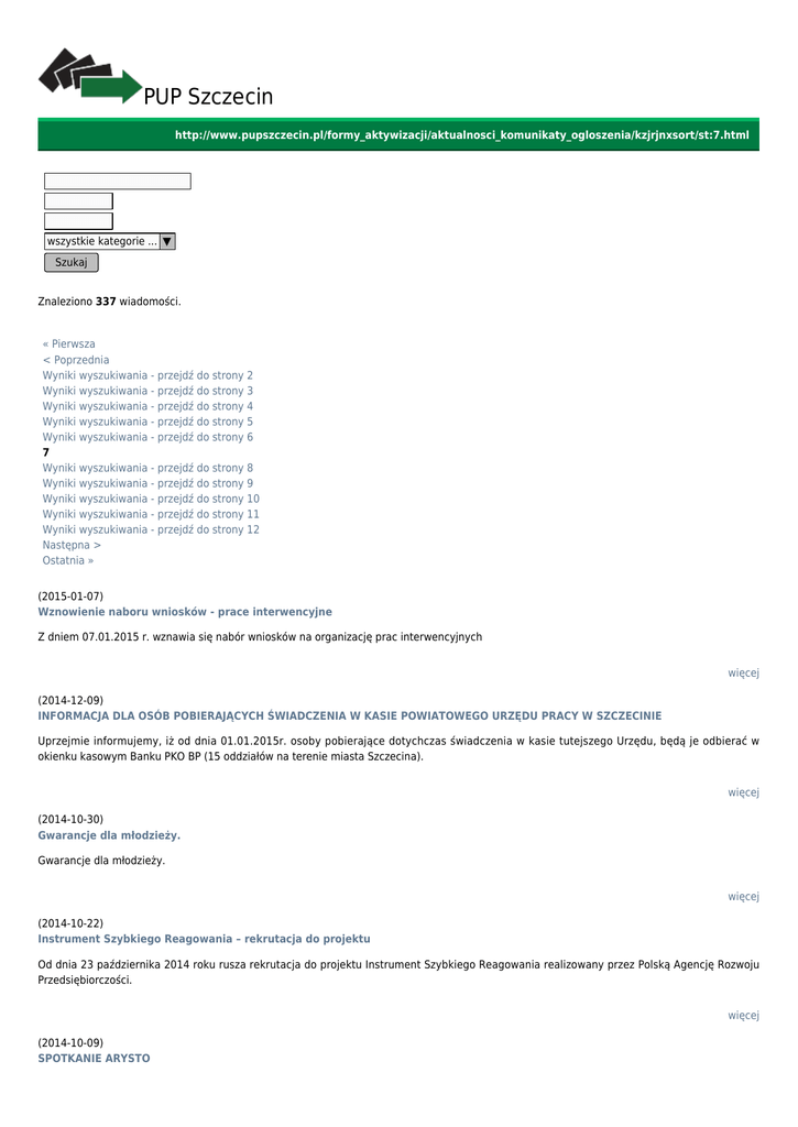PUP Szczecin http://www.pupszczecin.pl/formy_aktywizacji/aktualnosci_komunikaty_ogloszenia/kzjrjnxsort/st:7.html wszystkie kategorie ... ▼ Szukaj Znaleziono 337 wiadomości. « Pierwsza < Poprzednia Wyniki wyszukiwania - przejdź do strony 2 Wyniki wyszukiwania - przejdź do strony 3 Wyniki wyszukiwania - przejdź do strony 4 Wyniki wyszukiwania - przejdź do strony 5 Wyniki wyszukiwania - przejdź do strony 6 7 Wyniki wyszukiwania - przejdź do strony 8 Wyniki wyszukiwania - przejdź do strony 9 Wyniki wyszukiwania - przejdź do strony 10 Wyniki wyszukiwania - przejdź do strony 11 Wyniki wyszukiwania - przejdź do strony 12 Następna > Ostatnia » (2015-01-07) Wznowienie naboru wniosków - prace interwencyjne Z dniem 07.01.2015 r. wznawia się nabór wniosków na organizację prac interwencyjnych więcej (2014-12-09) INFORMACJA DLA OSÓB POBIERAJĄCYCH ŚWIADCZENIA W KASIE POWIATOWEGO URZĘDU PRACY W SZCZECINIE Uprzejmie informujemy, iż od dnia 01.01.2015r. osoby pobierające dotychczas świadczenia w kasie tutejszego Urzędu, będą je odbierać w okienku kasowym Banku PKO BP (15 oddziałów na terenie miasta Szczecina). więcej (2014-10-30) Gwarancje dla młodzieży. Gwarancje dla młodzieży. więcej (2014-10-22) Instrument Szybkiego Reagowania – rekrutacja do projektu Od dnia 23 października 2014 roku rusza rekrutacja do projektu Instrument Szybkiego Reagowania realizowany przez Polską Agencję Rozwoju Przedsiębiorczości. więcej (2014-10-09) SPOTKANIE ARYSTO ARYSTO więcej (2014-08-18) Marszałek Województwa Zachodniopomorskiego zaprasza podmioty ekonomii społecznej Marszałek Województwa Zachodniopomorskiego zaprasza podmioty ekonomii społecznej do udziału w certyfikacji swoich produktów i usług znakiem "Zakup Prospołeczny" więcej (2014-08-05) Nabór wniosków o przyznanie grantu na utworzenie stanowiska pracy w formie telepracy Nabór wniosków o przyznanie grantu na utworzenie stanowiska pracy dla osoby bezrobotnej w formie telepracy więcej (2014-08-05) Nabór wniosków od pracodawców na dofinansowanie wynagrodzenia zatrudnionych osób bezrobotnych Powiatowy Urząd Pracy w Szczecinie zaprasza pracodawców do składania wniosków o przyznanie: - świadczenia aktywizacyjnego, dofinansowania wynagrodzenia za zatrudnienie skierowanego bezrobotnego, który ukończył 50 rok życia. - refundacji kosztów poniesionych na składki na ubezpieczenia społeczne należne od pracodawcy za skierowanych do pracy bezrobotnych do 30 roku życia, którzy podejmują zatrudnienie po raz pierwszy w życiu. więcej (2014-04-04) Konkurs - staże PUP Szczecin ogłasza konkurs dla organizatorów staży dla osób bezrobotnych. Przy kierowaniu na staż preferowane będą osoby powyżej 50 r. życia,osoby do 30 r. życia, młodzież do 24 r. życia nie ucząca się, nie szkoląca i nie studiująca, która w dniu skierowania na staż zarejestrowana jest w PUP krócej niż 4 m-ce, oraz byli pracownicy sektora oświaty zwolnieni po 01.01.13r. i zarejestrowani w PUP nie później niż 31.12.13r. więcej (2014-02-27) Zaproszenie na szkolenia: "Kucharz" i "Budowa, obsługa, eksploatacja instalacji oraz sieci wytwarzających, przetwarzających, przesyłających i zużywających ciepło oraz innych urządzeń energetycznych" Powiatowy Urząd Pracy w Szczecinie zaprasza zarejestrowane osoby bezrobotne do 25 roku życia na szkolenia realizowane w ramach projektu „Wiedza i doświadczenie daje mi zatrudnienie” 1. Budowa, obsługa, eksploatacja instalacji oraz sieci wytwarzających, przetwarzających, przesyłających i zużywających ciepło oraz innych urządzeń energetycznych (wymagania: wykształcenie zawodowe techniczne lub średnie) 2. Kucharz więcej « Pierwsza < Poprzednia Wyniki wyszukiwania - przejdź do strony 2 Wyniki wyszukiwania - przejdź do strony 3 Wyniki wyszukiwania - przejdź do strony 4 Wyniki wyszukiwania - przejdź do strony 5 Wyniki wyszukiwania - przejdź do strony 6 7 Wyniki wyszukiwania - przejdź do strony 8 Wyniki wyszukiwania - przejdź do strony 9 Wyniki wyszukiwania - przejdź do strony 10 Wyniki wyszukiwania - przejdź do strony 11 Wyniki wyszukiwania - przejdź do strony 12 Następna > Ostatnia »