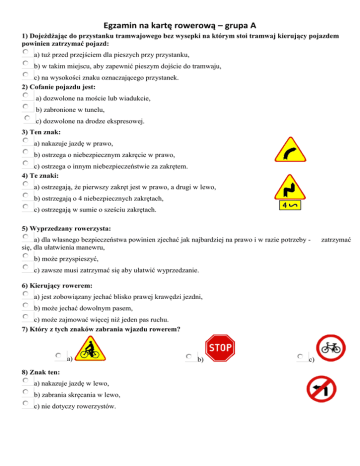 Egzamin na kartę rowerową – grupa A 1) Dojeżdżając do przystanku tramwajowego bez wysepki na którym stoi tramwaj kierujący pojazdem powinien zatrzymać pojazd: a) tuż przed przejściem dla pieszych przy przystanku, b) w takim miejscu, aby zapewnić pieszym dojście do tramwaju, c) na wysokości znaku oznaczającego przystanek. 2) Cofanie pojazdu jest: a) dozwolone na moście lub wiadukcie, b) zabronione w tunelu, c) dozwolone na drodze ekspresowej. 3) Ten znak: a) nakazuje jazdę w prawo, b) ostrzega o niebezpiecznym zakręcie w prawo, c) ostrzega o innym niebezpieczeństwie za zakrętem. 4) Te znaki: a) ostrzegają, że pierwszy zakręt jest w prawo, a drugi w lewo, b) ostrzegają o 4 niebezpiecznych zakrętach, c) ostrzegają w sumie o sześciu zakrętach. 5) Wyprzedzany rowerzysta: a) dla własnego bezpieczeństwa powinien zjechać jak najbardziej na prawo i w razie potrzeby się, dla ułatwienia manewru, b) może przyspieszyć, c) zawsze musi zatrzymać się aby ułatwić wyprzedzanie. 6) Kierujący rowerem: a) jest zobowiązany jechać blisko prawej krawędzi jezdni, b) może jechać dowolnym pasem, c) może zajmować więcej niż jeden pas ruchu. 7) Który z tych znaków zabrania wjazdu rowerem? a) 8) Znak ten: a) nakazuje jazdę w lewo, b) zabrania skręcania w lewo, c) nie dotyczy rowerzystów. b) c) zatrzymać 9) Wyprzedzanie pojazdu uprzywilejowanego jest: a) zawsze dozwolone, b) niedozwolone, c) dozwolone poza terenem zabudowanym. 10) W tej sytuacji kierujący rowerem: a) ustępuje tylko pojazdowi z numerem 3, b) jedzie jako pierwszy, c) ustępuje pojazdowi z numerem 2. 11) W tej sytuacji kierujący rowerem: a) jedzie ostatni, b) ma pierwszeństwo przed pojazdem z numerem 2, c) ma pierwszeństwo przed pojazdem z numerem 3. 12) W tej sytuacji kierujący rowerem: a) ustępuje pierwszeństwa pojazdowi z numerem 3, b) jedzie jako pierwszy, c) jedzie ostatni. 13) Bezpośrednio na ranę można przyłożyć: a) chusteczkę higieniczną, b) gazę, c) watę. 14) Włączając się do ruchu, kierujący pojazdem powinien: a) zachować ostrożność, b) ustąpić pierwszeństwa pojazdowi już będącemu w ruchu, c) ustąpić pierwszeństwa pieszym tylko wówczas, gdy skręca w lewo. 15) Po skręceniu w lewo, kierujący pojazdem: a) może zająć dowolny pas ruchu na prawej połowie jezdni dwukierunkowej, b) powinien zająć lewy skrajny pas ruchu na jezdni jednokierunkowej, c) powinien zająć najbliższy osi jezdni pas ruchu na drodze dwukierunkowej.