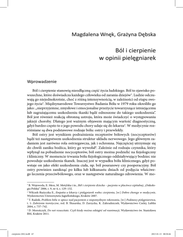 Magdalena Wnęk, Grażyna Dębska Ból i cierpienie w opinii pielęgniarek Wprowadzenie Ból i cierpienie stanowią nieodłączną część życia ludzkiego. Ból to zjawisko powszechne, które doświadcza każdego człowieka od zarania dziejów1. Ludzie odczuwają go niejednokrotnie, choć z różną intensywnością, w zależności od etapu swojego życia2. Międzynarodowe Towarzystwo Badania Bólu w 1979 roku określiło go jako: „nieprzyjemne, zmysłowe i emocjonalne przeżycie towarzyszące istniejącemu lub zagrażającemu uszkodzeniu tkanki bądź odnoszone do takiego uszkodzenia”. Ból jest również reakcją obronną ustroju, która może świadczyć o występowaniu jakiejś choroby. Dlatego jest ważnym objawem mającym wartość diagnostyczną, gdyż bardzo często to z jego powodu chory udaje się do lekarza3. W medycynie rozróżniane są dwa podstawowe rodzaje bólu: ostry i przewlekły. Ból ostry jest wynikiem podrażnienia receptorów bólowych (nocyceptorów) bądź też następstwem uszkodzenia struktur układu nerwowego. Jego głównym zadaniem jest zarówno rola ostrzegawcza, jak i ochronna. Najczęściej utrzymuje się do chwili zaniku bodźca, który go wywołał4. Zależnie od rodzaju czynnika, który wpłynął na pobudzenie nocyceptorów, ból ostry można podzielić na fizjologiczny i kliniczny. W momencie trwania bólu fizjologicznego oddziaływujący bodziec nie powoduje uszkodzenia tkanek. Inaczej jest w wypadku bólu klinicznego, gdyż powstaje on jako efekt uszkodzenia ciała, np. ból pourazowy czy pooperacyjny. Ból ostry powinien zaniknąć po kilku lub kilkunastu dniach od podjęcia właściwego leczenia przeciwbólowego, oraz w następstwie naturalnego zdrowienia. W mo1 B. Wojewoda, E. Mess, M. Motylska i in., Ból i cierpienie dziecka – pacjenta w placówce szpitalnej, „Onkologia Polska” 2006, t. 9, nr 4, s. 129–132. 2 Wilczek-Rużyczka E., Empatia u lekarzy i pielęgniarek wobec cierpienia, [w:] Dobro chorego w medycynie, Wydawnictwo Uniwersytetu Jagiellońskiego, Kraków 2007. 3 T. Radzik, Problem bólu w opiece nad pacjentem o niepomyślnym rokowaniu, [w:] Podstawy pielęgniarstwa, t. 1: Założenia teoretyczne, red. B. Ślusarska, D. Zarzycka, K. Zahradniczek, Wydawnictwo Czelej, Lublin 2004, s. 737–742. 4 D. Morończyk, Do not resuscitate. Czyli kiedy można odstąpić od reanimacji, Wydawnictwo św. Stanisława BM, Kraków 2011. cierpienie 2012.indb 67 2013-01-15 08:58:46 Magdalena Wnęk, Grażyna Dębska 68 mencie niepodejmowania lub w razie bezskutecznej terapii przeciwbólowej może przekształcić się z bólu ostrego w przewlekły5. O bólu przewlekłym mówi się, jeżeli odczuwanie bólu utrzymuje się powyżej trzech miesięcy lub jest nadal obecne po zagojeniu uszkodzonych wcześniej tkanek. Pojawia się ono, pomimo że nie działa już bodziec drażniący receptory bólowe6. W przeciwieństwie do bólu ostrego, ból przewlekły nie pełni już roli ostrzegawczej, co w konsekwencji prowadzi do licznych nieprzyjemnych doznań. Może się przerodzić w „chorobę samą w sobie”, gdyż dotyka wszystkich sfer życia człowieka i znacząco je zmienia. Doświadczanie tego bólu jest tak mocne, że człowiek spycha wszystkie sprawy życiowe na dalszy plan. Skupienie uwagi w głównej mierze na bólu powoduje wzrost jego odczuwania. Może też wpływać na rozwój lęku i innych negatywnych emocji7 oraz na obniżenie poziomu życia8. Zależy to przede wszystkim od siły i długości trwania bólu, a nie od wywołującej go przyczyny9. To pokazuje, że przedstawiona na początku definicja bólu skupia się wyłącznie na jego funkcji biologicznej w ustroju10. A przecież jest to subiektywne doznanie zmysłowe, mocno złożone, dotykające prawie wszystkich sfer osobowości człowieka11 Bólowi towarzyszy cierpienie, które jest jego nieodłącznym elementem. Znany austriacki psychiatra i psychoterapeuta Viktor Frankl twierdzi, że jedynie człowiek może doświadczać cierpienia12, które jest odpowiedzią organizmu na zadawany mu ból fizyczny lub psychiczny13. Cierpienie bywa także określane jako zespół różnorakich doświadczeń, które są negatywnie odbierane przez jednostkę14. Doświadczenia te mogą dotykać zarówno sfery psychicznej, fizycznej, jak i duchowej człowieka. Do ich przyczyny zaliczyć można czynniki wewnętrzne, takie jak np. załamanie psychiczne czy przeżywanie jakichś wątpliwości, oraz czynniki zewnętrzne, jak np. choroba czy śmierć kogoś z rodziny. W dzisiejszych czasach zdarza się dość powszechnie, że słowo cierpienie zastępowane jest innymi określeniami, takimi jak ból lub choroba. W wielu przypadkach zależy to od rodzaju nauki, która zajmuje się badaniami w tej kwestii. Nauki 5 R. Szulc, Z.N. Brzózy, Ból, [w:] Encyklopedia bioetyki, red. A. Muszala, Polskie Wydawnictwo Encyklopedyczne, Radom 2009, s. 126–133. 6 T. Radzik, Problem bólu w opiece nad pacjentem o niepomyślnym rokowaniu, dz. cyt. 7 I. Filipczak-Bryniarska, J. Wordliczek, Lekarz wobec bólu i cierpienia człowieka, „Anestezjologia i Ratownictwo” 2008, t. 2, s. 101–108. 8 D. Morończyk, Do not resuscitate…, dz. cyt. 9 R. Szulc, Z.N. Brzózy, Ból, dz. cyt. 10 I. Filipczak-Bryniarska, J. Wordliczek, Lekarz wobec bólu…, dz. cyt. 11 R. Szulc, Z.N. Brzózy, Ból, dz. cyt. 12 E. Wilczek-Rużyczka, E. Zajkowska, K. Wojtas, Postawy lekarzy i pielęgniarek…, dz. cyt. 13 A. Dyaczyńska-Herman, Aktualne potrzeby i możliwości niesienia ulgi w cierpieniu, [w:] Terminalne choroby. Hospicjum, red. K. Gibiński, Polska Akademia Umiejętności, Kraków 1996. 14 L. Patyjewicz, Doskonaląca wartość cierpienia, [w:] Człowiek nieuleczalnie chory, red. B. Blocka, W. Otrębski, WNS KUL, Lublin 1997. cierpienie 2012.indb 68 2013-01-15 08:58:46 Ból i cierpienie w opinii pielęgniarek 69 przyrodnicze częściej stosują pojęcie choroby i bólu15. Jednak takie rozumowanie, ujmujące cierpienie wyłącznie w katego