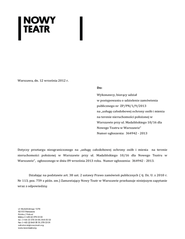 Warszawa, dn. 12 września 2012 r. Do: Wykonawcy, biorący udział w postępowaniu o udzielenie zamówienia publicznego nr ZP/PN/1/9/2013 na „usługę całodobowej ochrony osób i mienia na terenie nieruchomości położonej w Warszawie przy ul. Madalińskiego 10/16 dla Nowego Teatru w Warszawie” Numer ogłoszenia: 364942 - 2013 Dotyczy przetargu nieograniczonego na „usługę całodobowej ochrony osób i mienia na terenie nieruchomości położonej w Warszawie przy ul. Madalińskiego 10/16 dla Nowego Teatru w Warszawie”, ogłoszonego w dniu 09 września 2013 roku. Numer ogłoszenia: 364942 - 2013. Działając na podstawie art. 38 ust. 2 ustawy Prawo zamówień publicznych ( tj. Dz. U. z 2010 r. Nr 113, poz. 759 z późn. zm.) Zamawiający Nowy Teatr w Warszawie przekazuje niniejszym zapytanie wraz z odpowiedzią: Lp. Pytanie Odpowiedź 1. Czy Zamawiający dopuści zmianę ceny brutto w przypadku ustawowej zmiany podatku VAT? 2. Czy Zamawiający dopuszcza zmianę umowy w przypadku zmiany ustawowego Nie. podatku VAT ? 3. W jakim składzie ilościowym ma występować grupa interwencyjna? Wykonawca sam określi skład grupy interwencyjnej (ilość osób) w zależności od zaistniałej sytuacji wymagającej interwencji. 4. Czy pracownicy grupy interwencyjnej muszą posiadać licencje POF? Tak. Czy pracownicy grupy interwencyjnej mają być uzbrojeni, jeśli tak, w jaką broń: a. Broń palna krótka b. Broń palna maszynowa c. Paralizator elektryczny z pozwoleniem na broń? Wykonawca sam oceni konieczność posiadania broni przez pracowników grupy interwencyjnej w zależności od zaistniałej sytuacji wymagającej interwencji. Zamawiający zastrzega, że wszelkie działania grupy interwencyjnej, w tym posiadanie i ewentualne użycie broni przez pracowników grupy interwencyjnej Wykonawcy musi być uzasadnione oraz przebiegać zgodnie z obowiązującymi przepisami prawa, a ponadto Wykonawca ponosi pełną odpowiedzialność za wybór uzbrojenia i ewentualne użycie broni lub paralizatora. 5. Nie. 6. Proszę o potwierdzenie, które z elementów poniższego wyposażenia musi posiadać grupa interwencyjna: a. Pałka wielofunkcyjna b. Kajdanki c. Ręczny miotacz gazu d. Paralizator elektryczny bez pozwolenia na broń e. Kamizelka operacyjna f. Hełm g. Kamizelka kuloodporna h. Telefon komórkowy i. Radiotelefon przenośny j. Latarka operacyjna k. Opatrunek osobisty l. Apteczka m. Pojazd osobowy (inny) oznakowany z lampą reklamową n. Radiotelefon samochodowy z anteną? Wykonawca sam określi, jakie wyposażenie powinni posiadać pracownicy grupy interwencyjnej, w zależności od zaistniałej sytuacji wymagającej interwencji. Wszelkie elementy wyposażenia grupy interwencyjnej oraz ich użycie, w tym posiadanie i użycie broni przez pracowników grupy interwencyjnej Wykonawcy musi być uzasadnione oraz przebiegać zgodnie z obowiązującymi przepisami prawa. 7. Czy pracownicy grupy interwencyjnej muszą posiadać poświadczenie bezpieczeństwa osobowego, jeśli tak, do jakiej klauzuli informacji niejawnej? Nie. Czy pracownicy grupy interwencyjnej muszą posiadać pozwolenie na broń? Nie jest to wymagane, jeśli Wykonawca zdecyduje, ze grupa interwencyjna nie będzie posiadała wyposażenia wymagającego pozwolenia na broń. Jeśli Wykonawca zdecyduje, że na wyposażeniu wysłanej grupy interwencyjnej będzie się znajdowało wyposażenie wymagające zgodnie z obowiązującymi przepisami pozwolenia na broń, pracownicy grupy interwencyjnej muszą posiadać również stosowne pozwolenia, wymagane obowiązującymi przepisami prawa. 8. 9. Czy instrukcja ochrony jest zgodna z opisem przedmiotu zamówienia? 10. Czy w przypadku zmiany powszechnie obowiązujących przepisów prawa skutkujących zwiększeniem obciążeń finansowych po stronie Wykonawcy, w szczególności związanych z kosztami zatrudnienia pracowników Wykonawcy, strony w terminie 30 dni od daty wejścia Nie. Zamawiający nie przewiduje zmian umowy w celu uwzględnienia wzrostu w życie opisanych powyżej zmian w przepisach prawa dokonają odpowiednich obciążeń po stronie Wykonawcy. zmian w Umowie, w szczególności w zakresie wynagrodzenia należnego Wykonawcy, uwzględniających wzrost obciążeń po stronie Wykonawcy? Wnosimy o dodanie powyższej klauzuli do wzoru Umowy. 11. Czy w świetle przewidywanych zmian o zatrudnieniu, Zamawiający wymaga aby wykonawca uwzględnił w cenie oferty zwiększenie kosztów zatrudnienia pracowników na podstawie umowy zlecenia w związku z ewentualną koniecznością odprowadzania składek do ZUS od umów cywilno-prawnych? Zamawiający nie posiada instrukcji ochrony. Nie wymaga. Wykonawca powinien sam zadecydować czy taką ewentualną zmianę uwzględni w ofercie bądź nie. Zamawiający nie przewiduje jednak zmian wynagrodzenia Wykonawcy w trakcie trwania Umowy, także w związku ze zwiększeniem kosztów zatrudnienia pracowników Wykonawcy. Czy w świetle przewidywanych zmian o zatrudnieniu (tj. zwiększenia kosztów zatrudnienia pracowników na podstawie umowy zlecenia w związku z ewentualną koniecznością odprowadzania składek do ZUS od umów cywilno-prawnych do wielkości pełnego etatu) Zamawiający dopuszcza możliwość skrócenia okresu realizacji kontraktu do czasu wykorzystania maksymalnej ceny oferty, po udokumentowaniu szczegółowych składników wpływających na tę cenę po zmianach ustawowych? Nie. 13. Jakie drobne prace gospodarcze Zamawiający ma na myśli w załączniku nr 1 do SIWZ? Pod pojęciem „pomocy pracownikom Zamawiającego w drobnych pracach gospodarczych” umieszczonym w Załączniku nr 1 do SIWZ Zamawiający rozumie proste czynności, wymagające pomocy pracownika ochrony, np. pomoc przy załadunku drobnych rzeczy do samochodu teatralnego, jeśli będzie taka konieczność. Zamawiający nie wymaga wykonywania prac gospodarczych typu sprzątanie nieruchomości, odśnieżanie, wywóz odpadów itp. 14. W odniesieniu do zapisu SIWZ o posiadaniu przez 