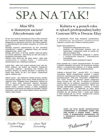 BIULETYN NR 9/2012 28 LISTOPADA 2012 SPA NA TAK! Mini SPA w domowym zaciszu? Zdecydowanie tak! W tym roku Centrum Kosmetyczne Dworu Elizy otworzyło się na wszystkich chętnych poznania swojego ciała i jego pielęgnacją na najwyższym poziomie. Nie trzeba dodawać, iż zainteresowanie jest przede wszystkim po stronie płci pięknej. Każdego tygodnia organizowane są mini warsztaty kosmetyczne z masażu i pielęgnacji twarzy jak również pielęgnacji stóp - lekkie nogi. Dlatego, jeśli marzą ci się nogi gładkie i lekkie jak piórko lub zdrowa ujędrniona cera twarzy już dziś weź udział w bezpłatnych warsztatach SPA. Wybierz, który temat jest dla ciebie ważny i zgłoś chęć uczestnictwa w recepcji hotelu - z pewnością poinformujemy Cię o najbliższym spotkaniu. Lekkie Nogi - takie nogi możesz pokazać przez cały rok. Warto wiedzieć, jak pozbyć się kłopotów związanych z uczuciem ciężkości i opuchlizną nóg. Problem jest poważny. Dotyczy, aż połowy dorosłych. A naprawdę nie trzeba wielu starań, by się z nim uporać i eksponować piękne, zadbane nogi. Masaż twarzy - jest efektywną metodą leczenia obrzęku oraz poprawy wyglądu skóry twarzy. Działa skuteczniej niż najlepszy krem. Wygładza twarz ekspresowo. Możesz go robić w domu sama. Domowym, własnym sposobem możemy ujędrnić mięśnie twarzy, poprawić krążenie płynów twarzy, uwolnić toksyny, a także zapobiegać powstawaniu zmarszczek lub spłycić już powstałe. Poprzez automasaż, nasza skóra twarzy będzie również aksamitna, miękka i pełna energii. Kobieta w 4 porach roku w rękach profesjonalnej kadry Centrum SPA w Dworze Elizy W październiku Panie miały możliwość uczestniczenia w b e z p ł a t n y c h w a r s z t a t a c h k o s m e t y c z n y c h ‚Kobieta w 4 porach roku. Kobieta w kolorach jesieni’. Każde takie spotkanie to: • komputerowa diagnostyka stanu cery • prelekcja: jak wykorzystać jesienny czas na regenerację i przygotować skórę do trudnej roli, jaką musi odegrać zimą • planowanie indywidualnej pielęgnacji w oparciu o komputerową diagnozę i doświadczenie kosmetologa • losowaniem bardzo atrakcyjnych nagród Akcja spotkała się z dużym zainteresowaniem. W czasie 5 spotkań odwiedziło nas ponad 100 mieszkanek naszego regionu. Z przyjemnością czekamy na II edycję spotkań z cyklu i zapraszamy wszystkich zainteresowanych. ‚Kobieta w Kolorach Zimy’ - styczeń 2013 - to II edycja warsztatów. Będzie przygotowana wspólnie z naszym partnerem kosmetycznym firmą Bionantech - generalnym przedstawicielem THAL’ION THALASSO COSMETICS. Tym razem tematem przewodnim będzie pielęgnacja twarzy anti-age: 30+, 40+, 50+. To właśnie tym tematem chciały zająć się na kolejnych warsztatach uczestniczki jesiennej edycji warsztatów kosmetycznych. Piękna cera wymaga odpowiedniej pielęgnacji i ochrony w każdym etapie naszego życia. W zależności od wieku skóra wymaga jednak innego. Wszystkie uczestniczki warsztatów dowiedzą się, jak powinny dbać o swoją cerę kobiety w wieku powyżej 30, 40 i 50 lat - zachęca Pani Justyna Kostuń - Dyrektor SPA Medical Dwór Elizy Jeżeli już teraz jesteś zainteresowana uczestnictwem w warsztatach zostaw nam swój kontakt w recepcji hotelu - telefon, e-mail. Z przyjemnością powiadomimy Cię o dokładnych terminach i szykowanych atrakcjach. Sandra Matys Kosmetolog Anna Bąk Kosmetolog ! y m a Polec
