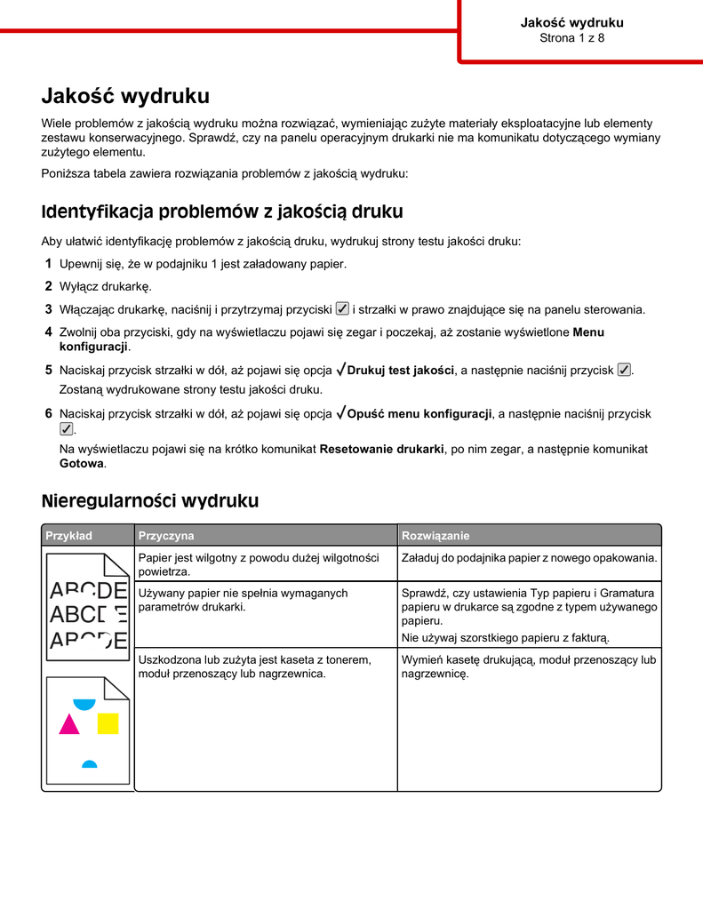 Jakość wydruku Strona 1 z 8 Jakość wydruku Wiele problemów z jakością wydruku można rozwiązać, wymieniając zużyte materiały eksploatacyjne lub elementy zestawu konserwacyjnego. Sprawdź, czy na panelu operacyjnym drukarki nie ma komunikatu dotyczącego wymiany zużytego elementu. Poniższa tabela zawiera rozwiązania problemów z jakością wydruku: Identyfikacja problemów z jakością druku Aby ułatwić identyfikację problemów z jakością druku, wydrukuj strony testu jakości druku: 1 Upewnij się, że w podajniku 1 jest załadowany papier. 2 Wyłącz drukarkę. 3 Włączając drukarkę, naciśnij i przytrzymaj przyciski i strzałki w prawo znajdujące się na panelu sterowania. 4 Zwolnij oba przyciski, gdy na wyświetlaczu pojawi się zegar i poczekaj, aż zostanie wyświetlone Menu konfiguracji. 5 Naciskaj przycisk strzałki w dół, aż pojawi się opcja Drukuj test jakości, a następnie naciśnij przycisk . Zostaną wydrukowane strony testu jakości druku. 6 Naciskaj przycisk strzałki w dół, aż pojawi się opcja Opuść menu konfiguracji, a następnie naciśnij przycisk . Na wyświetlaczu pojawi się na krótko komunikat Resetowanie drukarki, po nim zegar, a następnie komunikat Gotowa. Nieregularności wydruku Przykład ) ) ABCDE ABCDE ABCDE Przyczyna Rozwiązanie Papier jest wilgotny z powodu dużej wilgotności powietrza. Załaduj do podajnika papier z nowego opakowania. Używany papier nie spełnia wymaganych parametrów drukarki. Sprawdź, czy ustawienia Typ papieru i Gramatura papieru w drukarce są zgodne z typem używanego papieru. Nie używaj szorstkiego papieru z fakturą. Uszkodzona lub zużyta jest kaseta z tonerem, moduł przenoszący lub nagrzewnica. Wymień kasetę drukującą, moduł przenoszący lub nagrzewnicę. Jakość wydruku Strona 2 z 8 Powtarzające się błędy wydruku Przyczyna Rozwiązanie Jeśli błędy dotyczą tylko jednego koloru i występują wielokrotnie na stronie: Kaseta z tonerem jest uszkodzona. Wymień kasetę z tonerem, jeśli usterka pojawia się co: • 33,0 mm • 35,3 mm Bęben światłoczuły jest uszkodzony. Wymień fotoprzewodnik (bęben światłoczuły), jeśli usterka pojawia się co: • 28,3 mm • 72,4 mm Jeśli błędy powtarzają się na stronie i dotyczą wszystkich kolorów: Nagrzewnica jest uszkodzona. Wymień nagrzewnicę, jeśli usterki pojawiają się co: • 47,4 mm • 94,8 mm • 113,0 mm Linia jasna, biała lub w niewłaściwym kolorze Przykład ABCDE ABCDE ABCDE ABCDE ABCDE Przyczyna Rozwiązanie Kaseta z tonerem jest uszkodzona. Wymień kasetę koloru powodującego powstawanie linii. Fotoprzewodnik (bęben światłoczuły) jest uszkodzony. Wymień bęben światłoczuły. Moduł przenoszący jest uszkodzony. Wymień moduł przenoszący. Soczewki głowicy drukującej są zabrudzone. Wyczyść soczewki głowicy drukującej. Jakość wydruku Strona 3 z 8 Błędne nakładanie kolorów Przykład Przyczyna Rozwiązanie Kolor przesunął się poza właściwy obszar lub został nałożony na obszar innego koloru. ABCDE ABCDE 1 Wykonaj ponowną kalibrację drukarki. • Wykonaj regulację koloru w menu Jakość. 2 Wyjmij bęben światłoczuły, a następnie zainstaluj go ponownie. 3 Ustaw kalibrację kolorów. Więcej informacji można znaleźć w sekcji „Ustawianie kalibracji kolorów” na stronie 3. Uwaga: Jeśli problem nie zostanie rozwiązany, ponownie przeprowadź kalibrację. W razie potrzeby ustaw ponownie kalibrację kolorów. Ustawianie kalibracji kolorów 1 Upewnij się, że drukarka jest wyłączona. 2 Włączając drukarkę, naciśnij i przytrzymaj przyciski i strzałki w prawo znajdujące się na panelu sterowania. 3 Zwolnij oba przyciski, gdy na wyświetlaczu pojawi się zegar. Zostanie przeprowadzona sekwencja uruchamiania drukarki, a następnie pojawi się opcja Menu konfiguracji. 4 Naciskaj przycisk strzałki w dół, aż pojawi się opcja 5 Naciśnij ponownie przycisk Kalibr. kolorów, a następnie naciśnij przycisk . , aby wydrukować stronę kalibracji. 6 Naciskaj przycisk strzałki w dół, aż pojawi się opcja Ustaw A, a następnie naciśnij przycisk . 7 Na wydrukowanym arkuszu wybierz najprostszą z 20 linii znajdujących się obok litery A. 8 Naciskaj przycisk strzałki w lewo lub strzałki w prawo, aż wyświetlony zostanie ten numer, a następnie naciśnij przycisk . Zostanie wyświetlony komunikat Wysyłanie wyboru. 9 Powtórz czynności z punktów od 6 do 8, aby skalibrować ustawienia od A do L. 10 Naciśnij przycisk . 11 Naciśnij przycisk . 12 Naciskaj przycisk strzałki w dół, aż pojawi się opcja Opuść menu konfiguracji, a następnie naciśnij przycisk . Na wyświetlaczu pojawi się na krótko komunikat Resetowanie drukarki, po nim zegar, a następnie komunikat Gotowa. Jakość wydruku Strona 4 z 8 Poziome smugi Przykład Przyczyna Rozwiązanie Kaseta z tonerem jest uszkodzona, pusta lub zużyta. Wymień kasetę z tonerem. ABCDE ABCDE ABCDE Nagrzewnica jest uszkodzona lub zużyta. Wymień nagrzewnicę. Bęben światłoczuły może być uszkodzony. Wymień uszkodzony bęben światłoczuły. Pionowe smugi Przykład ABCDE ABCDE ABCDE Przyczyna Rozwiązanie Toner jest rozmazywany przed wtopieniem go w papier. Jeśli papier jest sztywny, użyj innego podajnika. Kaseta z tonerem jest uszkodzona. Wymień kastę z tonerem powodującą powstawanie smug. Czy moduł przenoszący jest zużyty lub uszkodzony? Wymień moduł przenoszący. Nierówna gęstość wydruku Przykład ABCDE ABCDE ABCDE Przyczyna Rozwiązanie Kaseta z tonerem jest zużyta lub uszkodzona. Wymień kasetę z tonerem. Bęben światłoczuły jest zużyty lub uszkodzony. Wymień bęben światłoczuły. Wydruk jest zbyt ciemny Przyczyna Rozwiązanie Być może ostatnio nie była przeprowadzana ponowna kalibracja drukarki. Wykonaj regulację koloru w menu Jakość. Ustawienie Intensywność toneru lub Kontrast RGB ma zbyt wysoką wartość, lub Jasność RGB ma zbyt niską wartość. Przed wysłaniem zadania d