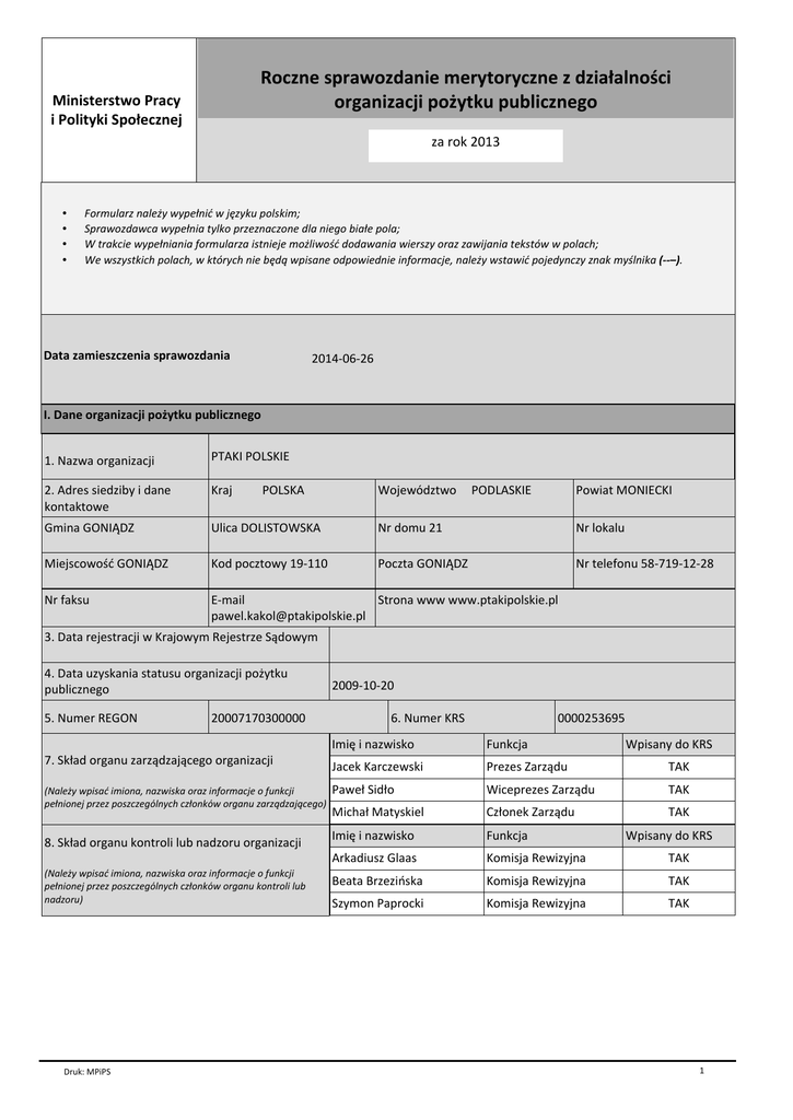 ZŽĐnjŶĞƐƉƌĂǁŽnjĚĂŶŝĞŵĞƌLJƚŽƌLJĐnjŶĞnjĚnjŝĂųĂůŶŽƑĐŝ ŽƌŐĂŶŝnjĂĐũŝƉŽǏLJƚŬƵƉƵďůŝĐnjŶĞŐŽ Ministerstwo Pracy ŝWŽůŝƚLJŬŝ^ƉŽųĞĐnjŶĞũ za rok 2013 • • • • &ŽƌŵƵůĂƌnjŶĂůĞǏLJǁLJƉĞųŶŝđǁũħnjLJŬƵƉŽůƐŬŝŵ͖ ^ƉƌĂǁŽnjĚĂǁĐĂǁLJƉĞųŶŝĂƚLJůŬŽƉƌnjĞnjŶĂĐnjŽŶĞĚůĂŶŝĞŐŽďŝĂųĞƉŽůĂ͖ tƚƌĂŬĐŝĞǁLJƉĞųŶŝĂŶŝĂĨŽƌŵƵůĂƌnjĂŝƐƚŶŝĞũĞŵŽǏůŝǁŽƑđĚŽĚĂǁĂŶŝĂǁŝĞƌƐnjLJŽƌĂnjnjĂǁŝũĂŶŝĂƚĞŬƐƚſǁǁƉŽůĂĐŚ͖ tĞǁƐnjLJƐƚŬŝĐŚƉŽůĂĐŚ͕ǁŬƚſƌLJĐŚŶŝĞďħĚČǁƉŝƐĂŶĞŽĚƉŽǁŝĞĚŶŝĞŝŶĨŽƌŵĂĐũĞ͕ŶĂůĞǏLJǁƐƚĂǁŝđƉŽũĞĚLJŶĐnjLJnjŶĂŬŵLJƑůŶŝŬĂ (--–). Data zamieszczenia sprawozdania 2014-06-26 /͘ĂŶĞŽƌŐĂŶŝnjĂĐũŝƉŽǏLJƚŬƵƉƵďůŝĐnjŶĞŐŽ 1. Nazwa organizacji PTAKI POLSKIE 2. Adres siedziby i dane kontaktowe Kraj 'ŵŝŶĂ'KE/ Ulica DOLISTOWSKA Nr domu 21 Nr lokalu DŝĞũƐĐŽǁŽƑđ'KE/ Kod pocztowy 19-110 WŽĐnjƚĂ'KE/ Nr telefonu 58-719-12-28 Nr faksu E-mail Strona www www.ptakipolskie.pl [email protected] POLSKA Województwo PODLASKIE Powiat MONIECKI ϯ͘ĂƚĂƌĞũĞƐƚƌĂĐũŝǁ<ƌĂũŽǁLJŵZĞũĞƐƚƌnjĞ^ČĚŽǁLJŵ ϰ͘ĂƚĂƵnjLJƐŬĂŶŝĂƐƚĂƚƵƐƵŽƌŐĂŶŝnjĂĐũŝƉŽǏLJƚŬƵ publicznego 5. Numer REGON 20007170300000 ϳ͘^ŬųĂĚŽƌŐĂŶƵnjĂƌnjČĚnjĂũČĐĞŐŽŽƌŐĂŶŝnjĂĐũŝ ;EĂůĞǏLJǁƉŝƐĂđŝŵŝŽŶĂ͕ŶĂnjǁŝƐŬĂŽƌĂnjŝŶĨŽƌŵĂĐũĞŽĨƵŶŬĐũŝ ƉĞųŶŝŽŶĞũƉƌnjĞnjƉŽƐnjĐnjĞŐſůŶLJĐŚĐnjųŽŶŬſǁŽƌŐĂŶƵnjĂƌnjČĚnjĂũČĐĞŐŽͿ ϴ͘^ŬųĂĚŽƌŐĂŶƵŬŽŶƚƌŽůŝůƵďŶĂĚnjŽƌƵŽƌŐĂŶŝnjĂĐũŝ ;EĂůĞǏLJǁƉŝƐĂđŝŵŝŽŶĂ͕ŶĂnjǁŝƐŬĂŽƌĂnjŝŶĨŽƌŵĂĐũĞŽĨƵŶŬĐũŝ ƉĞųŶŝŽŶĞũƉƌnjĞnjƉŽƐnjĐnjĞŐſůŶLJĐŚĐnjųŽŶŬſǁŽƌŐĂŶƵŬŽŶƚƌŽůŝůƵď nadzoru) Druk: MPiPS 2009-10-20 6. Numer KRS 0000253695 /ŵŝħŝŶĂnjǁŝƐŬŽ Funkcja Wpisany do KRS Jacek Karczewski WƌĞnjĞƐĂƌnjČĚƵ TAK WĂǁĞų^ŝĚųŽ tŝĐĞƉƌĞnjĞƐĂƌnjČĚƵ TAK DŝĐŚĂųDĂƚLJƐŬŝĞů njųŽŶĞŬĂƌnjČĚƵ TAK /ŵŝħŝŶĂnjǁŝƐŬŽ Funkcja Arkadiusz Glaas Komisja Rewizyjna TAK ĞĂƚĂƌnjĞnjŝŷƐŬĂ Komisja Rewizyjna TAK Szymon Paprocki Komisja Rewizyjna TAK Wpisany do KRS 1 9. Cele statutowe organizacji ;EĂůĞǏLJŽƉŝƐĂđĐĞůĞŶĂƉŽĚƐƚĂǁŝĞƐƚĂƚƵƚƵŽƌŐĂŶŝnjĂĐũŝͿ ͲŽĐŚƌŽŶĂĚnjŝŬŽǏLJũČĐLJĐŚŐĂƚƵŶŬſǁŝŝĐŚƐŝĞĚůŝƐŬ͕njĞƐnjĐnjĞŐſůŶLJŵ ƵǁnjŐůħĚŶŝĞŶŝĞŵƉƚĂŬſǁ͕ ͲŽĐŚƌŽŶĂŵŝĞũƐĐĐĞŶŶLJĐŚŝǁĂǏŶLJĐŚƉƌnjLJƌŽĚŶŝĐnjŽ͕ǁƚLJŵƉŽĐŚŽĚnjĞŶŝĂ antropogenicznego, ͲŽĚƚǁĂƌnjĂŶŝĞƐŝĞĚůŝƐŬ͕ƉŽƉƵůĂĐũŝĚnjŝŬŽǏLJũČĐLJĐŚŐĂƚƵŶŬſǁŝƐnjĞƌŽŬŽ rozumianych zasobów przyrody, ͲďĂĚĂŶŝĞ͕ŵŽŶŝƚŽƌŽǁĂŶŝĞŝĚŽŬƵŵĞŶƚŽǁĂŶŝĞƐƚĂŶƵƉƌnjLJƌŽĚLJŝƑƌŽĚŽǁŝƐŬĂ naturalnego, ͲĚnjŝĂųĂůŶŽƑđĞĚƵŬĂĐLJũŶĂŝŬƐnjƚĂųƚŽǁĂŶŝĞƉŽƐƚĂǁŶĂƌnjĞĐnjŽĐŚƌŽŶLJƉƌnjLJƌŽĚLJ ŝƑƌŽĚŽǁŝƐŬĂŶĂƚƵƌĂůŶĞŐŽ͕ ͲĂŶŐĂǏŽǁĂŶŝĞƐƉŽųĞĐnjĞŷƐƚǁĂŽƌĂnjŝŶƚĞŐƌŽǁĂŶŝĞƉŽƚĞŶĐũĂųƵƌſǏŶLJĐŚ ŽƌŐĂŶŝnjĂĐũŝǁŽŬſųĚnjŝĂųĂŷŶĂƌnjĞĐnjŽĐŚƌŽŶLJƉƌnjLJƌŽĚLJ͕ - wspieranie rozwoju terenów wiejskich lub innych antropogenicznych w njŐŽĚnjŝĞnjnjĂƐĂĚĂŵŝnjƌſǁŶŽǁĂǏŽŶĞŐŽƵǏLJƚŬŽǁĂŶŝĂnjĂƐŽďſǁƑƌŽĚŽǁŝƐŬĂ naturalnego oraz w poszanowaniu dziedzictwa przyrodniczego i kulturowego, ͲŽĐŚƌŽŶĂĚnjŝŬŽǏLJũČĐLJĐŚŐĂƚƵŶŬſǁŝŝĐŚƐŝĞĚůŝƐŬ͕njĞƐnjĐnjĞŐſůŶLJŵ ƵǁnjŐůħĚŶŝĞŶŝĞŵƉƚĂŬſǁ͕ ͲŽĐŚƌŽŶĂŵŝĞũƐĐĐĞŶŶLJĐŚŝǁĂǏŶLJĐŚƉƌnjLJƌŽĚŶŝĐnjŽ͕ǁƚLJŵƉŽĐŚŽĚnjĞŶŝĂ 10. Sposób realizacji celów statutowych organizacji antropogenicznego, ͲŽĚƚǁĂƌnjĂŶŝĞƐŝĞĚůŝƐŬ͕ƉŽƉƵůĂĐũŝĚnjŝŬŽǏLJũČĐLJĐŚŐĂƚƵŶŬſǁŝƐnjĞƌŽŬŽ ;EĂůĞǏLJŽƉŝƐĂđƐƉŽƐſďƌĞĂůŝnjĂĐũŝĐĞůſǁƐƚĂƚƵƚŽǁLJĐŚŽƌŐĂŶŝnjĂĐũŝŶĂ rozumianych zasobów przyrody, ͲďĂĚĂŶŝĞ͕ŵŽŶŝƚŽƌŽǁĂŶŝĞŝĚŽŬƵŵĞŶƚŽǁĂŶŝĞƐƚĂŶƵƉƌnjLJƌŽĚLJŝƑƌŽĚŽǁŝƐŬĂ podstawie statutu organizacji) naturalnego, ͲĚnjŝĂųĂůŶŽƑđĞĚƵŬĂĐLJũŶĂŝŬƐnjƚĂųƚŽǁĂŶŝĞƉŽƐƚĂǁŶĂƌnjĞĐnjŽĐŚƌŽŶLJƉƌnjLJƌŽĚLJ ŝƑƌŽĚŽǁŝƐŬĂŶĂƚƵƌĂůŶĞŐŽ͕ ͲĂŶŐĂǏŽǁĂŶŝĞƐƉŽųĞĐnjĞŷƐƚǁĂŽƌĂnjŝŶƚĞŐƌŽǁĂŶŝĞƉŽƚĞŶĐũĂųƵƌſǏŶLJĐŚ ŽƌŐĂŶŝnjĂĐũŝǁŽŬſųĚnjŝĂųĂŷŶĂƌnjĞĐnjŽĐŚƌŽŶLJƉƌnjLJƌŽĚLJ͕ - wspieranie rozwoju terenów wiejskich lub innych antropogenicznych w njŐŽĚnjŝĞnjnjĂƐĂĚĂŵŝnjƌſǁŶŽǁĂǏŽŶĞŐŽƵǏLJƚŬŽǁĂŶŝĂnjĂƐŽďſǁƑƌŽĚŽǁŝƐŬĂ naturalnego oraz w poszanowaniu dziedzictwa przyrodniczego i kulturowego, //͘ŚĂƌĂŬƚĞƌLJƐƚLJŬĂĚnjŝĂųĂůŶŽƑĐŝŽƌŐĂŶŝnjĂĐũŝƉŽǏLJƚŬƵƉƵďůŝĐnjŶĞŐŽǁŽŬƌĞƐŝĞƐƉƌĂǁŽnjĚĂǁĐnjLJŵ ϭ͘KƉŝƐĚnjŝĂųĂůŶŽƑĐŝƉŽǏLJƚŬƵƉƵďůŝĐnjŶĞŐŽ W 2013ƌŽŬƵ^ƚŽǁĂƌnjLJƐnjĞŶŝĞŬŽŶƚLJŶƵŽǁĂųŽƉƌŽǁĂĚnjŽŶĞƉƌnjĞnjƐŝĞďŝĞƉƌŽũĞŬƚLJ͕ũĞĚŶŽĐnjĞƑŶŝĞǁųČĐnjĂũČĐ ƐŝħǁŬŽůĞũŶĞĂŬĐũĞŝŶŽǁĞŝŶŝĐũĂƚLJǁLJ͘ ϭ͘ϭ͘KƉŝƐŐųſǁŶLJĐŚ ĚnjŝĂųĂŷƉŽĚũħƚLJĐŚ ƉƌnjĞnjŽƌŐĂŶŝnjĂĐũħ Druk: MPiPS /͘<ŽŶƚLJŶƵĂĐũĂƌŽnjƉŽĐnjħƚLJĐŚǁĐnjĞƑŶŝĞũƉƌŽũĞŬƚſǁ͗ 1͘ČĚǍŶĂƉd<͊KŐſůŶŽƉŽůƐŬĂ<ĂŵƉĂŶŝĂtŝĞĚnjLJŝĚƵŬĂĐũŝWƌnjLJƌŽĚŶŝĐnjĞũ͘ĚL