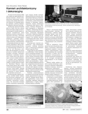 Anna Smoleñska, Marek Rembiœ Kamieñ architektoniczny i dekoracyjny W dniach 23–24 wrzeœnia 2003 roku odby³a siê ogólnopolska konferencja naukowa: „Kamieñ architektoniczny i dekoracyjny” zorganizowana przez Zak³ad Z³ó¿ Surowców Skalnych na Wydziale Geologii, Geofizyki i Ochrony Œrodowiska Akademii Górniczo-Hutniczej. Konferencjê otworzy³ Prorektor AGH ds. Nauki, Pan prof. Janusz Kowal zwracaj¹c uwagê na harmoniê panuj¹c¹ w rozwoju badañ naukowych prowadzonych przez Akademiê, zarówno w zakresie nowatorskich kierunków: informatyki i telekomunikacji, jak i tradycyjnych zwi¹zanych z geologi¹ i górnictwem. Podkreœli³ te¿ wagê problematyki zwi¹zanej z zastosowaniem i konserwacj¹ kamienia we wspó³czesnej gospodarce. Myœl tê kontynuowa³ przewodnicz¹cy Komitetu Organizacyjnego konferencji dr hab. in¿. Jan Bromowicz, prof. AGH. We wprowadzeniu do obrad poruszy³ on problem dysharmonii panuj¹cej pomiêdzy sposobem traktowania materia³ów kamiennych z jednej strony jako tajemniczych i przez to niezbyt lubianych, a z drugiej strony po¿¹danych z uwagi na szereg zalet. Zwróci³ te¿ uwagê na zas³ugi patrona Uczelni ks. Stanis³awa Staszica, który przed prawie dwustu laty w dziele „O Ziemiorodztwie Karpatow, i innych gor i rownin Polski”, wykaza³ ogromne umiejêtnoœci i gospodarcze wyczucie w ocenie polskich z³ó¿ materia³ów kamiennych. Konferencja by³a miejscem prezentacji wyników badañ materia³ów kamiennych zwi¹zanych z ich wydobyciem, ocen¹ jakoœci, zastosowaniem, niszczeniem i konserwacj¹. Tak ró¿norodna tematyka skupi³a uczestników reprezentuj¹- cych krajowe oœrodki naukowe: Akademiê Górniczo-Hutnicz¹, Akademiê Sztuk Piêknych w Krakowie, Instytut Górnictwa Odkrywkowego we Wroc³awiu, Instytut Techniki Budowlanej w Warszawie, Miêdzyuczelniany Instytut Konserwacji i Restauracji Dzie³ Sztuki w Warszawie i Krakowie, Pañstwowy Instytut Geologiczny w Warszawie i Gdañsku, Politechnikê Wroc³awsk¹, Polsk¹ Akademiê Nauk w Krakowie, Uniwersytet Wroc³awski i Poznañski, Wojskow¹ Akademiê Techniczn¹) oraz specjalistów zajmuj¹cych siê obróbk¹ kamienia i konserwacj¹ dzie³ sztuki. Konferencja odby³a siê w trzech sesjach tematycznych. W ramach esji I: „Kamieñ w architekturze i jego konserwacja” omawiano materia³y kamienne u¿yte w historycznych budowlach ró¿nych regionów Polski. Drug¹ czêœæ tej sesji poœwiêcono problematyce metod stosowanych w konserwacji kamienia. Profesor Irenesz P³uska omówi³ wspó³czesne metody konserwacji zabytków kamiennych w aspekcie technicznym i estetycznym. Podkreœli³ istotn¹ rolê konserwatora – restauratora, którego dzia³alnoœæ powinna byæ umiejêtnoœci¹ rekonstruowania oraz sztuk¹ m¹drej interpretacji dawnych dzie³. Zapewni to kamiennym dzie³om sztuki dalsz¹ ich egzystencjê, czêsto te¿ przywróci im si³ê oddzia³ywania artystycznego. Przyk³ady przeprowadzonych konserwacji zniszczonego kamienia zosta³y zaprezentowane przez Andrzeja M. Tekielaka (gmach Biblioteki Jagielloñskiej) i Lecha Chwilczyñskiego (nagrobek Kazimierza Jagielloñczyka w Kaplicy Œwiêtokrzyskiej Katedry na Wawelu). Przemówienie Prorektora AGH ds. Nauki, prof. dr. hab. in¿. Janusza Kowala inauguruj¹cego Konferencjê Naukow¹: „Kamieñ architektoniczny i dekoracyjny” (fot. M. Rembiœ) Sesja II: „Konserwacja Kaplicy Zygmuntowskiej” dotyczy³a najcenniejszego i zapewne najpiêkniejszego zabytku sztuki kamieniarskiej Polski. Referaty jej poœwiêcone porusza³y problematykê dotycz¹c¹ pochodzenia kamienia, jego niszczenia oraz historycznych i wspó³czesnych prac konserwatorskich. Sesja III: „Wydobycie i ocena jakoœci kamienia dla potrzeb architektury i konserwacji” obejmowa³a zagadnienia zwi¹zane z poszukiwaniem, rozpoznawaniem i metodami eksploatacji z³ó¿ materia³ów kamiennych w Polsce oraz perspektywami funkcjonowania gospodarki kamieniami budowlanymi na tle wymagañ normatywnych obowi¹zuj¹cych w Unii Europejskiej: Referaty zosta³y wydane drukiem w postaci obszernych, recenzowanych artyku³ów w Materia³ach konferencji naukowej: „Kamieñ architektoniczny i dekoracyjny”. W trakcie obrad i dyskusji towarzysz¹cej referatom zarysowa³y siê postulaty dotycz¹ce koniecznoœci podjêcia dzia³añ zwi¹zanych z: – rozszerzeniem na wiêksz¹ skalê informacji na temat mo¿liwoœci wykorzystania rodzimych materia³ów kamiennych. Szczególnie silnie podkreœlano po- trzebê informowania architektów w zakresie mo¿liwoœci stosowania polskiego kamienia. Podano szereg przyk³adów u¿ycia materia³ów kamiennych pochodz¹cych z odleg³ych krajów, co czêsto jest powodem du¿ych trudnoœci w pracach remontowych obiektów podlegaj¹cych silnemu zu¿yciu. £¹czy siê z tym koniecznoœæ rejestracji pochodzenia materia³ów w aktualnie realizowanych budowlach; – ustaleniem zasad dotycz¹cych oceny zmian stanu zachowania konserwowanych obiektów w miarê up³ywu czasu; – utworzeniem bazy danych dotycz¹cych pochodzenia i stanu zachowania materia³ów kamiennych na wzór podobnych, od lat ju¿ gromadzonych, np. we Francji. Konferencja by³a miejscem dyskusji i wymiany doœwiadczeñ specjalistów reprezentuj¹cych ró¿ne dziedziny nauki: geologów, górników, architektów, historyków sztuki i konserwatorów dzie³ sztuki. Przyczyni³a siê do nawi¹zania wzajemnych kontaktów, które byæ mo¿e w przysz³oœci zaowocuj¹ wspólnymi pracami naukowymi i nowymi rozwi¹zaniami technicznymi. Prace konserwatorskie prowadzone w Kaplicy Zygmuntowskiej na Wawelu. Kamienio³om w Trzuskawicy – przyk³ad oddzia³ywania górnictwa skalnego na Uzupe³nianie ubytków formy rzeŸbiarskiej mas¹ mineraln¹ imituj¹c¹ piaskowiec œrodowisko (referat El¿biety Pietrzyk-Sokulskiej) (referat Gra¿yny Chromy-Roœciszewskiej i Anny Janickiej) 10 BIP 123 – Listopad 2003 r.