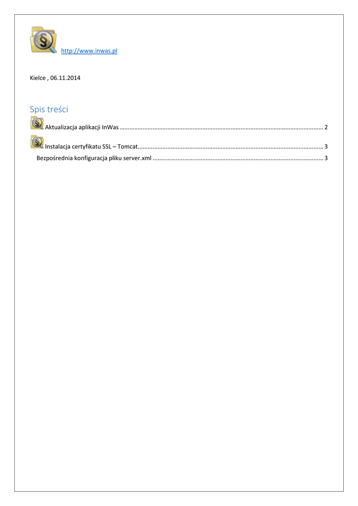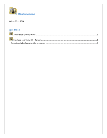 http://www.inwas.pl Kielce , 06.11.2014 Spis treści Aktualizacja aplikacji InWas ........................................................................................................................... 2 Instalacja certyfikatu SSL – Tomcat................................................................................................................ 3 Bezpośrednia konfiguracja pliku server.xml ....................................................................................................... 3 Aktualizacja aplikacji InWas Wersja 4.14 Wykonane zmiany : ! Usunięto blokadę znaków specjalnych w nazwie użytkownika podczas korzystania z LDAP/AD ! Poprawiono sposób kasowania sprawy + Dodano możliwość używania szablonów podczas dodawania nowej sprawy 1. Pobrać i rozpakować do osobnego katalogu paczkę http://www.inwas.pl/inwasapp/inwasUpdate414.zip 2. Zatrzymać serwis serwera Tomcat 3. Zlokalizować katalog aplikacji webapps/inwas 4. Nadpisać zawartość katalogu inwas zawartością pobranej paczki 5. Uruchomić Tomcat. Instalacja certyfikatu SSL – Tomcat Bezpośrednia konfiguracja pliku server.xml Wymagane: certyfikat SSL dla docelowej domeny i nazwy serwisu w formatach: Java Key Store (np inwas.test.pl.key, .keystore) lub PFX/P12 (PKCS#12) (inwas.test.pl.pfx) 1. Plik z certyfikatem (klucz prywatny oraz publiczny) należy zapisać w miejscu dostęnym dla serwisu Tomcat. 2. Ustalić konfigurację Tomcat w pliku server.xml: o Odnaleźć i odkomentować sekcję "SSL Connector". o Ustawić port na 8443 . o Ustawić parametry dostępu do certyfikatu: format pliku klucza Java (Java Key Store) <Connector port="8443" maxHttpHeaderSize="8192" maxThreads="150" minSpareThreads="25" maxSpareThreads="75" enableLookups="false" disableUploadTimeout="true" acceptCount="100" scheme="https" secure="true" clientAuth="false" sslProtocol="TLS" keystoreFile="inwas.test.pl.key" keystorePass="hasło do keystore" /> formatu pliku PFX/P12 (PKCS#12) <Connector port="8443" maxHttpHeaderSize="8192" maxThreads="150" minSpareThreads="25" maxSpareThreads="75" enableLookups="false" disableUploadTimeout="true" acceptCount="100" scheme="https" secure="true" clientAuth="false" sslProtocol="TLS" keystoreFile="inwas.test.pl.pfx" keystorePass="hasło_keystore" keystoreType="PKCS12" /> o Odszukać i wyłączyć ( zakomentować) sekcję <Listener className="org.apache.catalina.core.AprLifecycleListener" SSLEngine="on" /> 3. Zrestartować serwis Tomcat