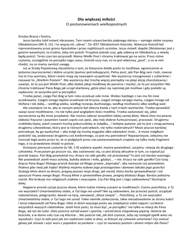 Dla większej miłości O postanowieniach wielkopostnych Drodzy Bracia i Siostry, Jezus bardzo lubił mówić obrazowo. Tym razem używa bardzo pięknego obrazu – samego siebie nazywa Oblubieńcem (Mt 9, 15). I to więcej niż „obraz”: On JEST Oblubieńcem Kościoła. Wówczas Kościół był reprezentowany przez grono Apostołów i przez najbliższych uczniów. Jezus mówił: dopóki Oblubieniec jest z gośćmi weselnymi, to trudno, żeby oni pościli. Przyjdzie jednak czas, gdy zabiorą im Oblubieńca, a wtedy będą pościć. Teraz czas ten przyszedł. Mamy Wielki Post i chcemy traktować go na serio. Przez różne czytania, szczególnie na początku tego czasu, Kościół uczy nas, co to jest właściwy „post”, o co w nim chodzi, na co mamy zwrócić uwagę. Już w Środę Popielcową słyszeliśmy o tym, że klasyczne dzieła postu to modlitwa, ograniczenie w jedzeniu (wyrzeczenie) i dobre uczynki (pomoc potrzebującym). Pełny post, jaki Pan Bóg ceni i lubi, zawsze ma te trzy wymiary, które razem mają się nawzajem uzupełniać. Nie wystarczy zrezygnować z cukierków i nazywać to „Wielkim Postem”. Nie wystarczy dać trochę więcej pieniędzy na jakąś akcję charytatywną i uważać, że to już jest Wielki Post, albo dodać jakąś modlitwę do pacierza i myśleć, że to już wszystko! Nie chcemy traktować Pana Boga jak urząd skarbowy, gdzie płaci się najmniej jak możliwe i gdy podatki są zapłacone, to wszystko jest w porządku! Trzeba pytać, czego Pan Bóg w tym roku oczekuje ode mnie. Wobec każdego z nas ma On inne oczekiwania. Czegoś innego będzie oczekiwał od Krzysia, czegoś innego od jego mamy, czegoś innego od Stefana i tak dalej…: według wieku, według rozwoju duchowego, według możliwości albo według wad. Ale uważajcie na to, aby w naszym poście był obecny każdy z tych trzech wymiarów. Trzeba sprawdzić swoje życie modlitewne, i to nie tylko pod względem ilości modlitw. Trzeba zastanowić się, jakie wyrzeczenia są dla mnie przydatne. Nie można zalecać wszystkim takiej samej diety. Może ktoś ma pewne słabości fizyczne i powinien nawet często coś zjeść, aby móc dobrze funkcjonować, pracować. Drugiemu zrobiłoby lepiej, jeżeli czasami trochę poburczałoby w żołądku... I kolejne pytanie: jak to jest z moją pomocą drugiemu człowiekowi, który jest w różnych potrzebach, nie tylko materialnych? Może jeszcze bardziej potrzebuje, by go wysłuchać – aby mógł się trochę wygadać albo odwiedzić mnie... A może mógłbym podzielić się, podarować drugiemu coś konkretnego, co jest mu potrzebne? Najważniejsze, żebyśmy nie niszczyli tego postu przez to, że w podjętych przez nas postanowieniach znajdzie się tylko mały fragment tego, o co prawdziwie chodzi w poście. Dzisiejsze pierwsze czytanie (Iz 58, 1‐9) wybiera aspekt, można powiedzieć, socjalny: relację do drugiego człowieka. Przeczytam go jeszcze raz, aby zastanowić się, co jest dzisiaj aktualne w tym, co napisał już prorok Izajasz. Pan Bóg powiedział mu: Krzycz na całe gardło, nie przestawaj! To jest coś bardzo ważnego. Nie powiedział: jeżeli masz ochotę, byłoby dobrze i miło, gdybyś... – nie: Krzycz na całe gardło! Coś tutaj dręczy Pana Boga! Dlatego prorok dostaje od Niego prawie „kopniaka”, aby nareszcie coś powiedzieć. Podnoś głos twój jak trąba! Wytknij mojemu ludowi jego przestępstwa i domowi Jakuba jego grzechy! Szukają Mnie dzień za dniem, pragną poznać moje drogi, jak naród, który kocha sprawiedliwość i nie opuszcza Prawa swego Boga. Proszą Mnie o sprawiedliwe prawa, pragną bliskości Boga. Bardzo pobożny naród. Nie brakuje mu religijnych znaków i zwyczajów. Czy Pan Bóg jest z tego zadowolony? Słuchajcie dalej. Najpierw prorok cytuje jeszcze słowa, które ludzie mówią czasami w modlitwach: Czemu pościliśmy, a Ty nie wejrzałeś? Umartwialiśmy siebie, a Tyś tego nie uznał? Nie są zadowoleni, bo przecież pościli, urządzali nabożeństwa, pielgrzymki, dawali na tacę, zamawiali „Msze święte”... Pościliśmy, a Ty nie wejrzałeś. Umartwialiśmy siebie, a Tyś tego nie uznał. Takie niemiłe zaskoczenie, takie niezadowolenie ze strony ludzi! I teraz odpowiedź od Pana Boga: Otóż w dzień waszego postu wy znajdujecie sobie zajęcie i uciskacie wszystkich waszych robotników. Jeżeli ktoś pości, to musi być „w porządku” nie tylko w relacji do Pana Boga, ale też do ludzi. Otóż pościcie wśród waśni i sporów, i wśród bicia niegodziwą pięścią. Idziecie do kościoła, a w domu cały czas się kłócicie... Nie pośćcie tak, jak dziś czynicie, żeby się rozlegał zgiełk wasz na wysokości. Czyż Ja taki post jak ten wybieram sobie w dniu, w którym się człowiek umartwia? Czy zwiesić głowy jak sitowie i użyć woru z popiołem za posłanie – czyż to nazwiesz postem i dniem miłym dla Pana? Chodzić cały czas ze zwieszoną głową, demonstrować pobożność albo sztuczne pokuty? Nie tego Pan Bóg od nas oczekuje! Czy nie jest raczej ten post, który wybieram: rozerwać kajdany zła, rozwiązać więzy niewoli, wypuścić wolno uciśnionych i wszelkie jarzmo połamać. Dać ludziom wolność, nie tylko w tym sensie, że ktoś dotychczas był niewolnikiem – czegoś takiego oficjalnie nie ma. Nieraz jednak człowiek wykorzystuje swoją pozycję jako szef albo jako ten, kto ma pieniądze lub władzę i daje to odczuć, wywyższa się, rządzi niesprawiedliwie, nie szanuje godności innych. Także dzisiaj istnieje dużo takiego niewolnictwa. ...Dzielić swój chleb z głodnym, wprowadzić w dom biednych tułaczy, nagiego, którego ujrzysz, przyodziać i nie odwrócić się od współziomków. Wtedy – gdy będziesz tak pościł – twoje światło wzejdzie jak zorza i szybko rozkwitnie twe zdrowie. Rozkwitnie twe zdrowie – taki post jest uzdrawiający! Sprawiedliwość twoja poprzedzać cię będzie, chwała Pańska iść będzie za tob